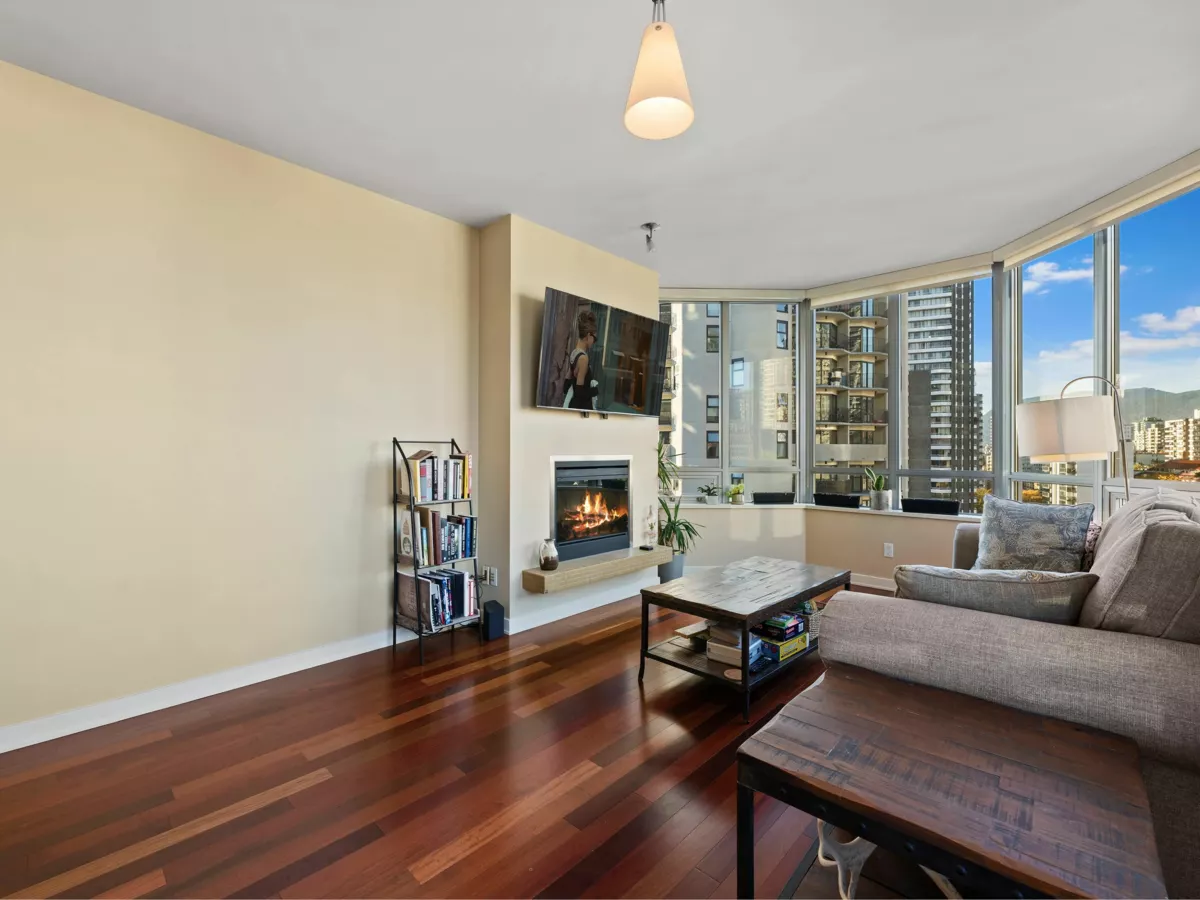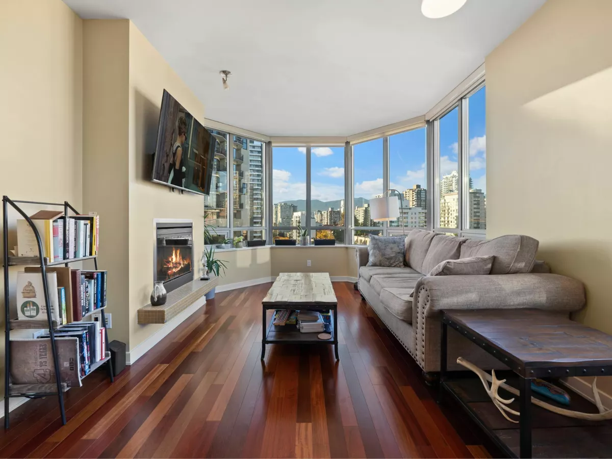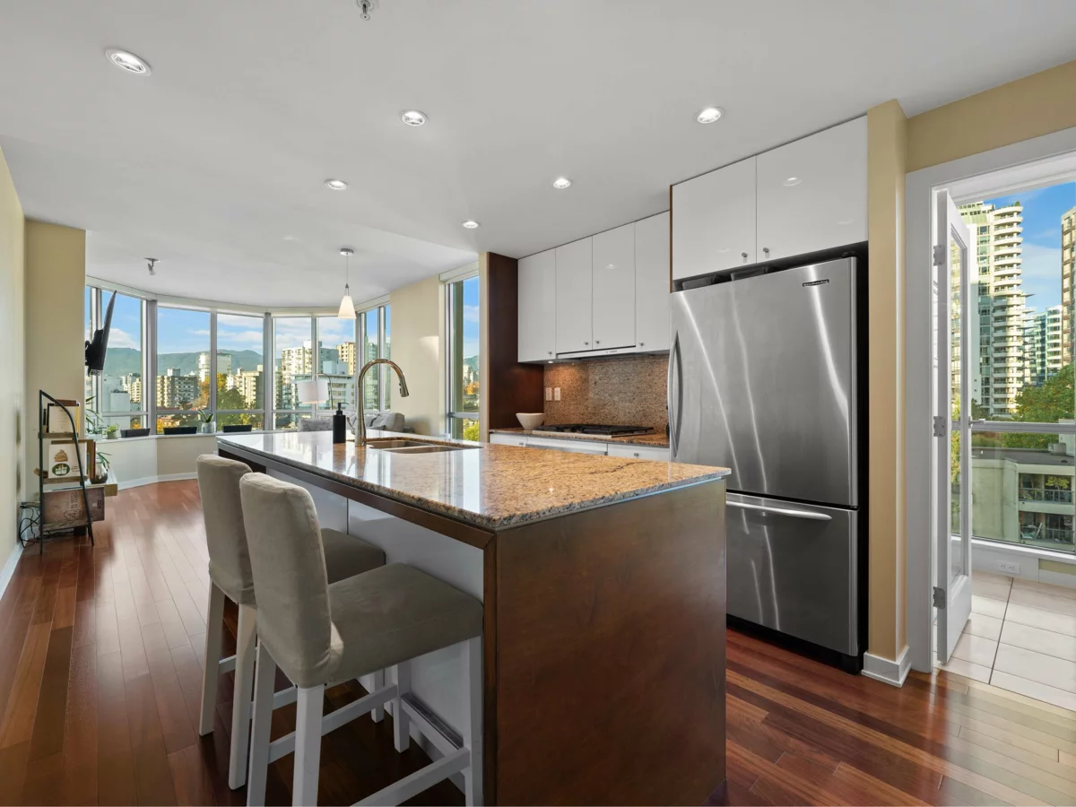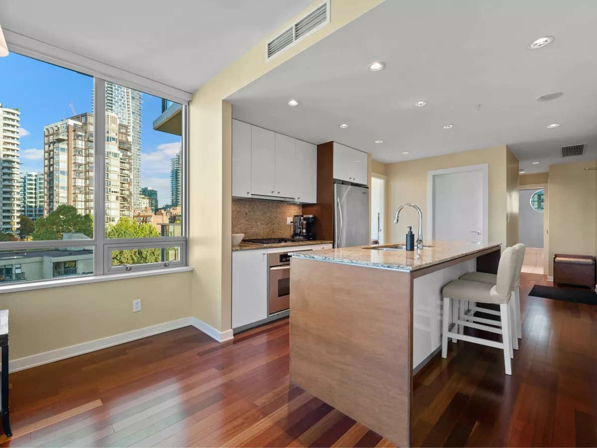 A rare offering in one of Vancouver’s most sought-after waterfront addresses. This exquisite residence 1 BEDROOM AND DEN at The Alvar exudes sophistication with its bright, open design, over-height ceilings, and expansive windows framing breathtaking city views. Enjoy your private balcony, perfect for morning coffee or evening sunsets. Impeccably finished with hardwood flooring, the gourmet kitchen is a showpiece featuring granite countertops, a generous island for casual dining. Central air conditioning ensures year-round comfort. Indulge in resort-style amenities including a jacuzzi, media and recreation lounges, pool table, conference facilities, and full security. Ideally positioned across from the Aquatic Centre, seawall, and minutes to Granville Island.