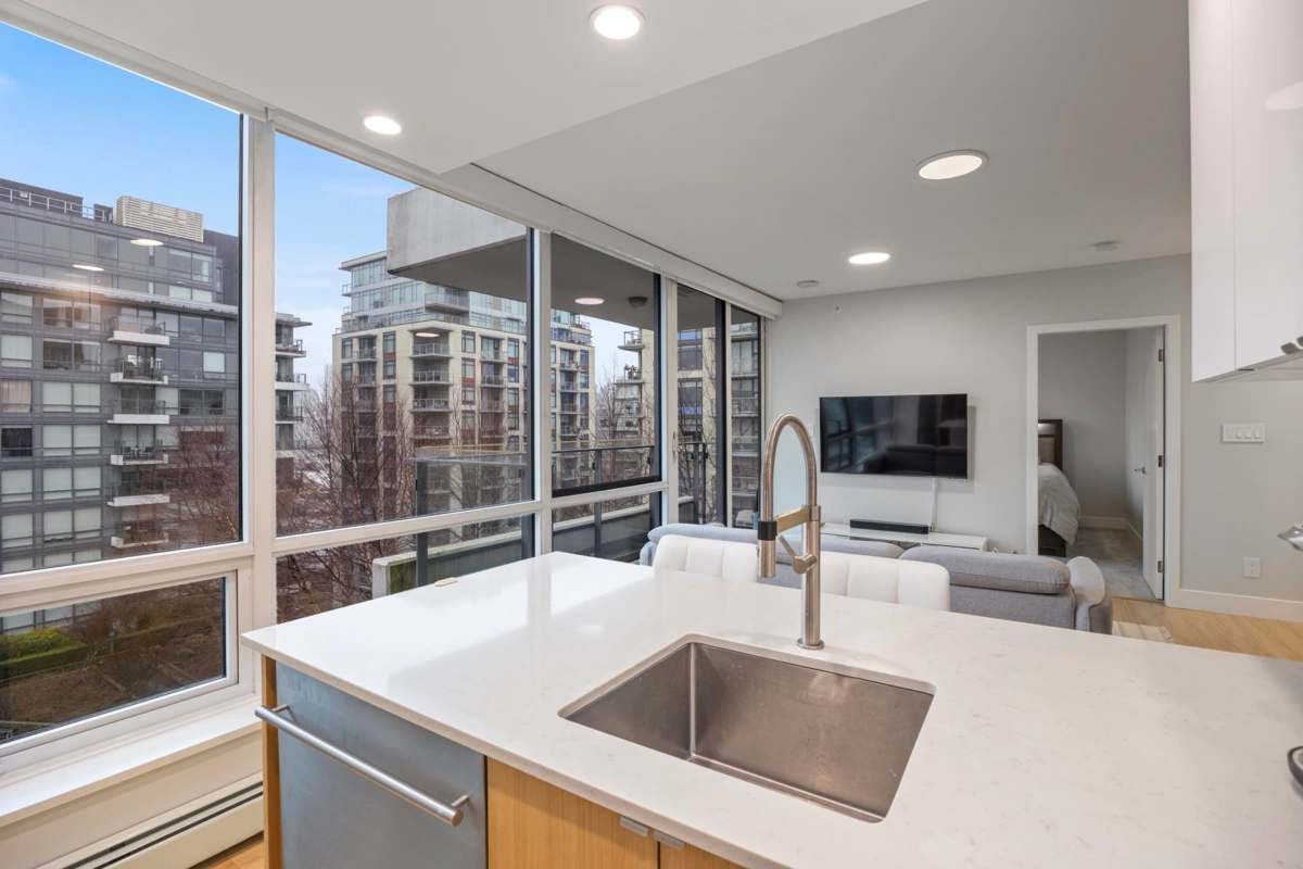 A standout south-west facing corner 1 bedroom + den at Tower Green, perfectly positioned in Vancouver’s sought-after False Creek neighbourhood. This bright home offers unobstructed City Hall views, 8'4 ceilings, and a smart, efficient layout that feels larger than expected. The U-shaped kitchen features full-size appliances and generous in-suite storage with no wasted space. Updates include Lutron electric curtains with wall panels and app control, new fridge, LED ceiling lights, updated bathroom fixtures, magnetic kitchen faucet, and a new bedroom rug. Portable AC included. Enjoy the seawall steps from your door and easy access to both the Canada and Expo Lines. Includes 1 parking, 1 bike locker.