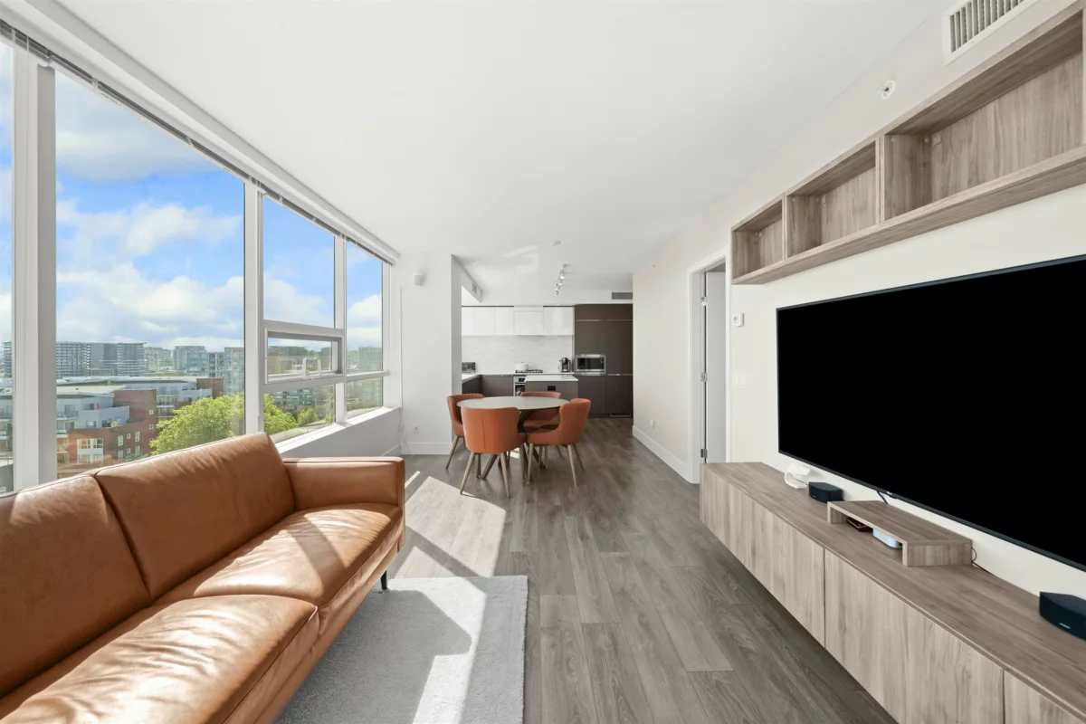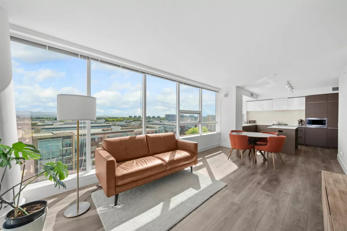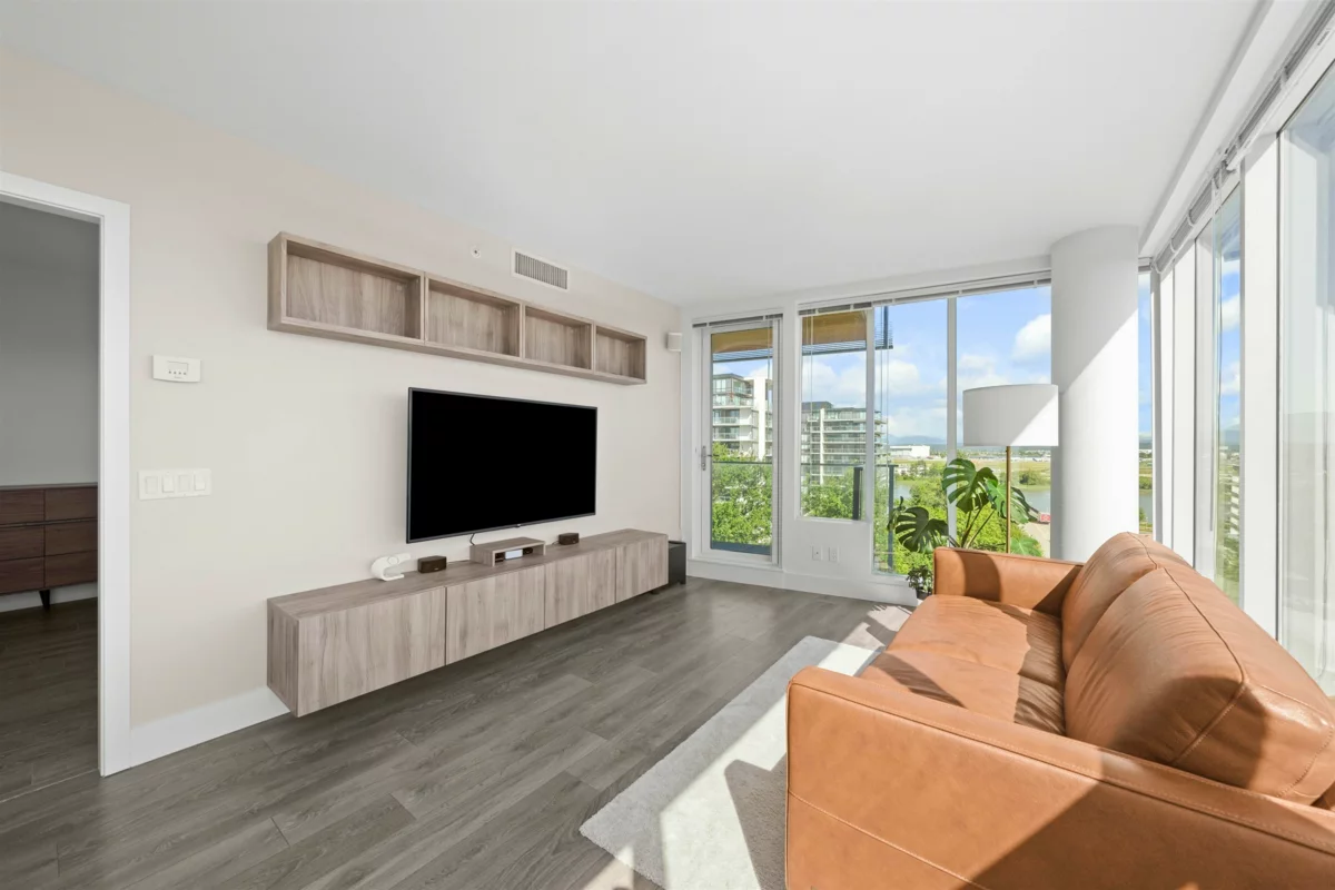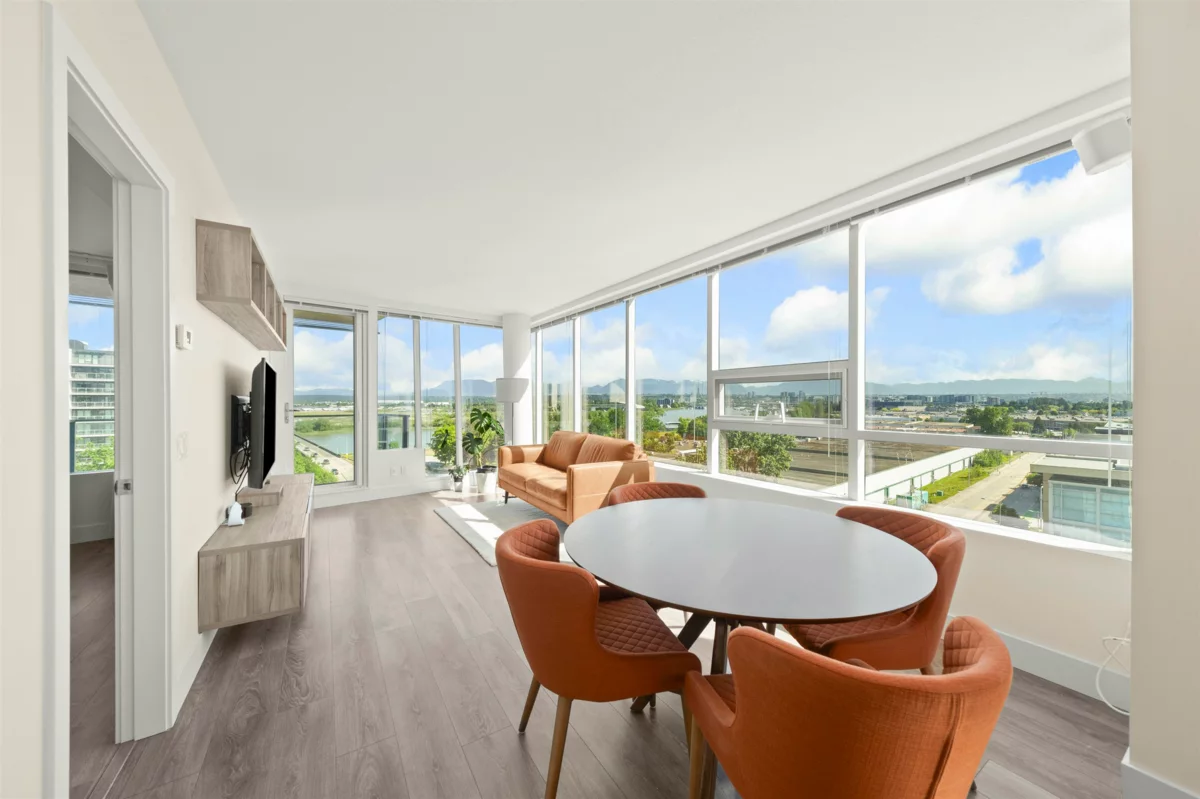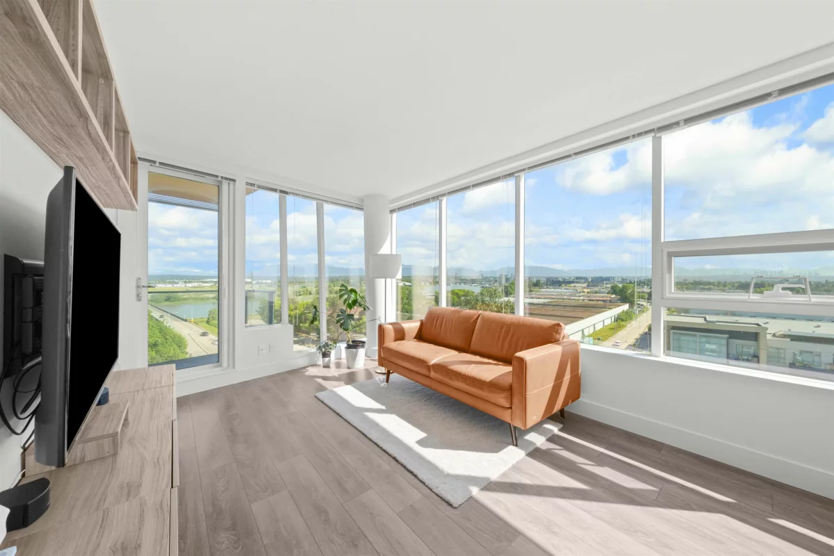 Stunning 180° view corner unit at RIVER PARK PLACE ONE by Intracorp! This rare high-floor home at 5233 Gilbert Rd offers breathtaking views from Mount Baker to the Fraser River, North Shore Mountains, and west-facing airplane skyline. Quiet yet central-just steps to the Olympic Oval, river trails, dining, markets, and easy access to Vancouver. Features two separated bedrooms, a spacious primary suite with walk-in closet and ensuite, rare kitchen window, laminate flooring, fresh paint, and mesh window screens. Floor-to-ceiling windows fill the space with light. Amenities: grand piano lounge, yoga and fitness rooms, party room, concierge service (office hours) with parcel receiving. Includes corner parking stall and locker.