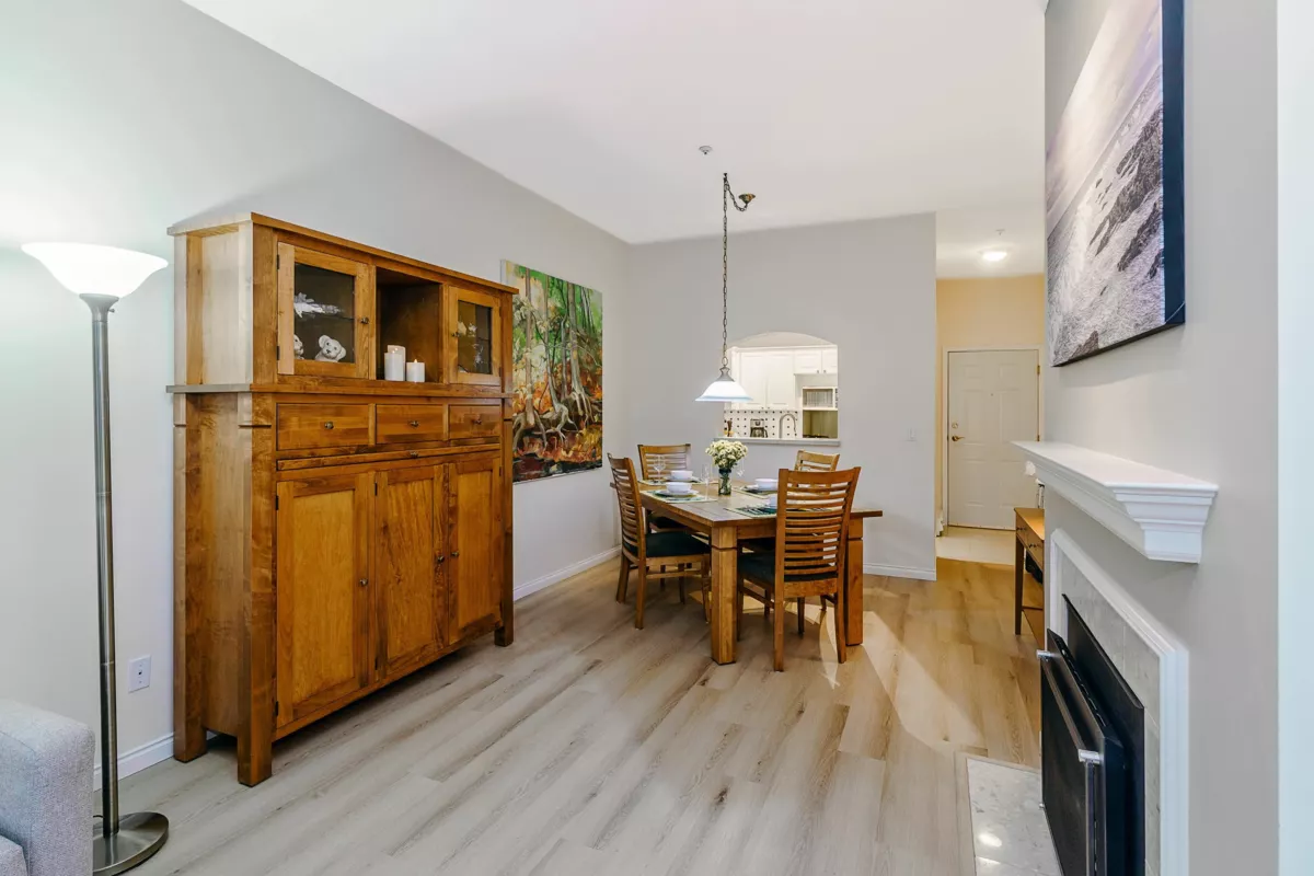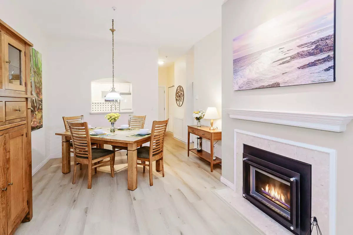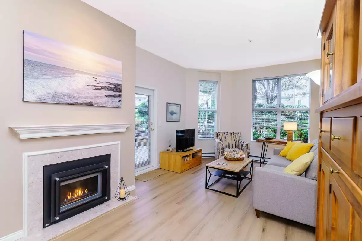 Gorgeous, original owner, over 1,000 SF 2 bed/2 bath garden suite at the Montclaire, features cathedral ceilings & large windows for tons of natural light. Lovingly maintained home boasts fresh paint & vinyl plank flooring throughout. Kitchen with white shaker cabinets & tile backsplash open to spacious living & dining area. Cozy living room with gas fireplace, walk out to spacious patio surrounded by lush greenery. Huge master with walk-in closet & ensuite with large soaker tub & his/her sinks. 2 side by side parking + storage locker on the same floor. Steps to Lafarge SkyTrain, Town Centre Park, Aquatic Complex & Coquitlam Centre. Steps to Caffé Divano & tons of dining and shopping. Hidden gem in the heart of Coquitlam.