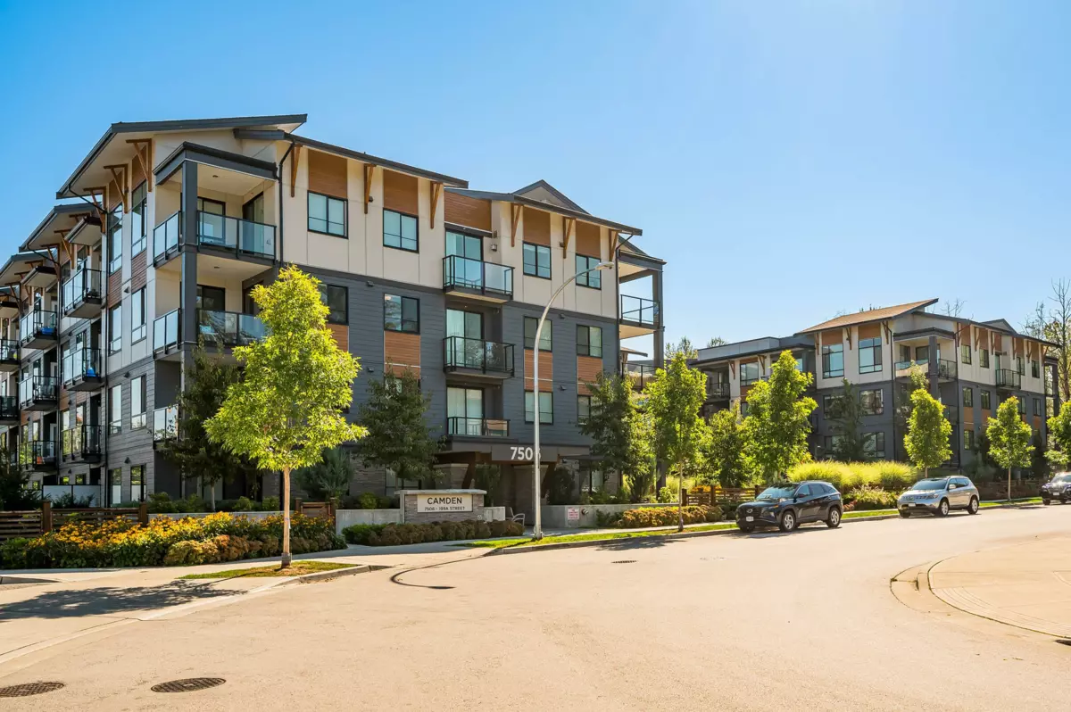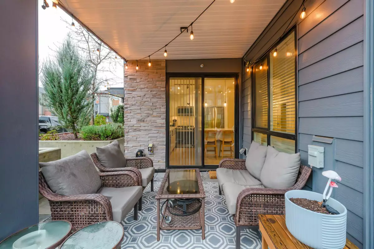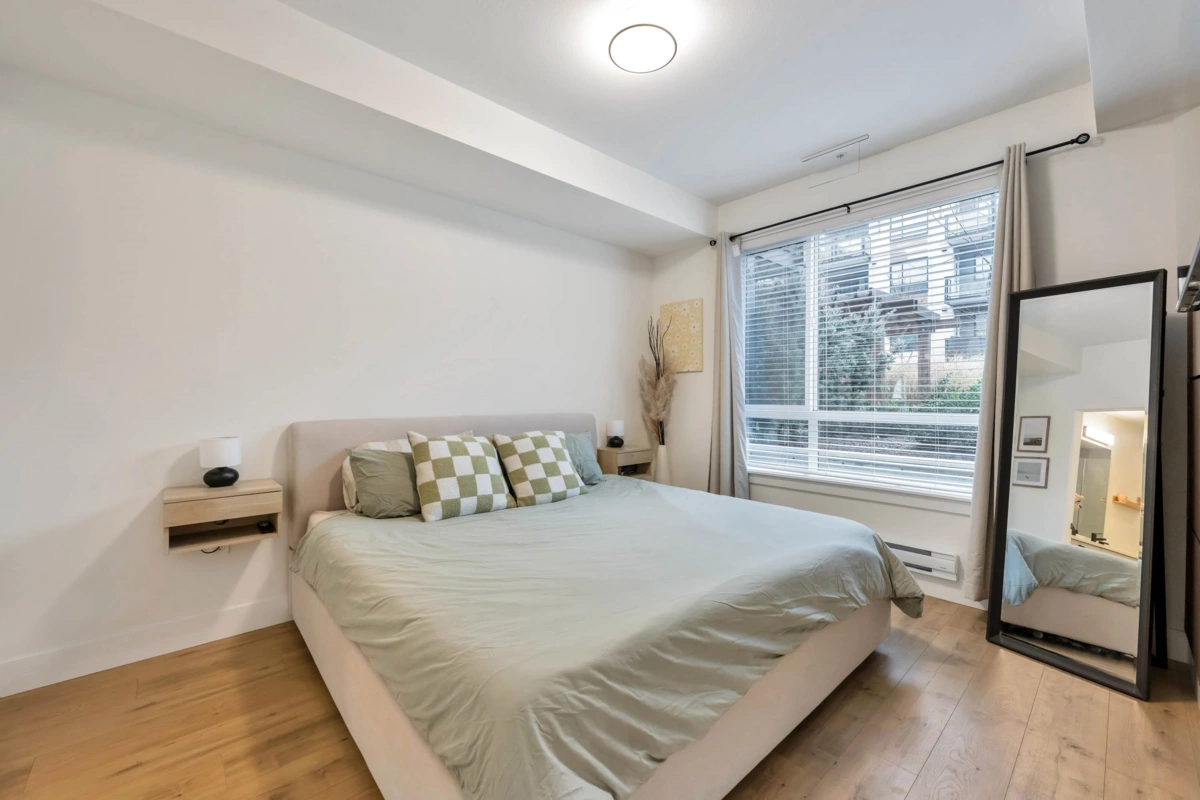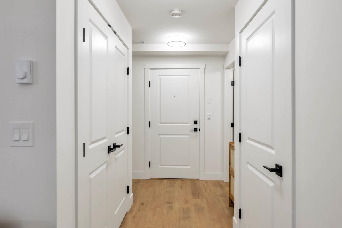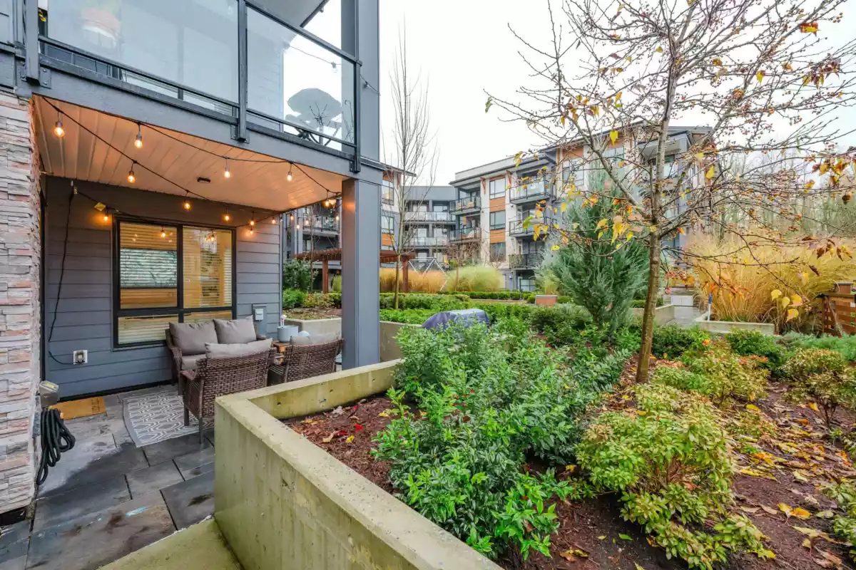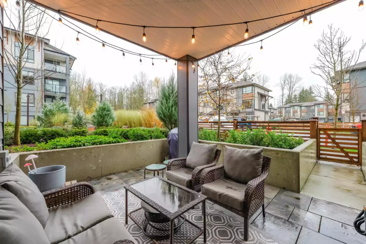 Bright, open, southwest-facing 2-bed, 2-bath corner home with a highly sought-after ground-level walkout patio, built by award-winning Zenterra. Excellent floor plan with 9 ft ceilings and vinyl plank flooring throughout. The kitchen features shaker-style cabinetry with a pantry, Samsung stainless-steel appliances with a gas range, a large island, quartz countertops, and an undermount sink. Two spacious bedrooms plus a bonus linen/storage area. Gas hookup on the patio. Unbeatable location: walk to coffee shops, restaurants, fitness facilities, and the Langley Events Centre. Future rapid transit will connect this area directly to SkyTrain. One underground parking, with more available to rent/purchase, plus plenty of street parking right out front.