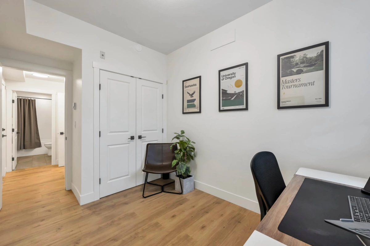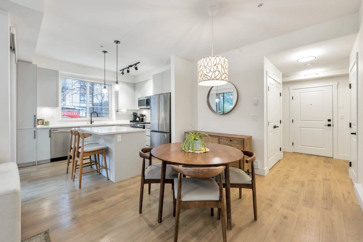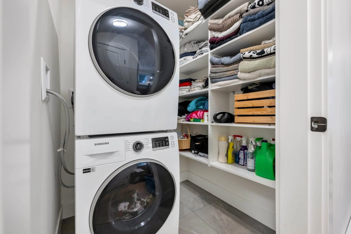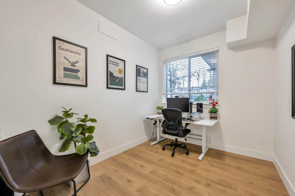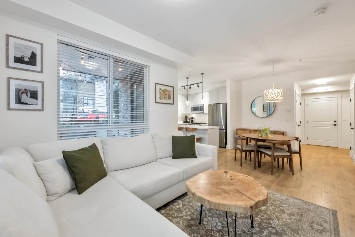 Bright, open, southwest-facing 2-bed, 2-bath corner home with a highly sought-after ground-level walkout patio, built by award-winning Zenterra. Excellent floor plan with 9 ft ceilings and vinyl plank flooring throughout. The kitchen features shaker-style cabinetry with a pantry, Samsung stainless-steel appliances with a gas range, a large island, quartz countertops, and an undermount sink. Two spacious bedrooms plus a bonus linen/storage area. Gas hookup on the patio. Unbeatable location: walk to coffee shops, restaurants, fitness facilities, and the Langley Events Centre. Future rapid transit will connect this area directly to SkyTrain. One underground parking, with more available to rent/purchase, plus plenty of street parking right out front.