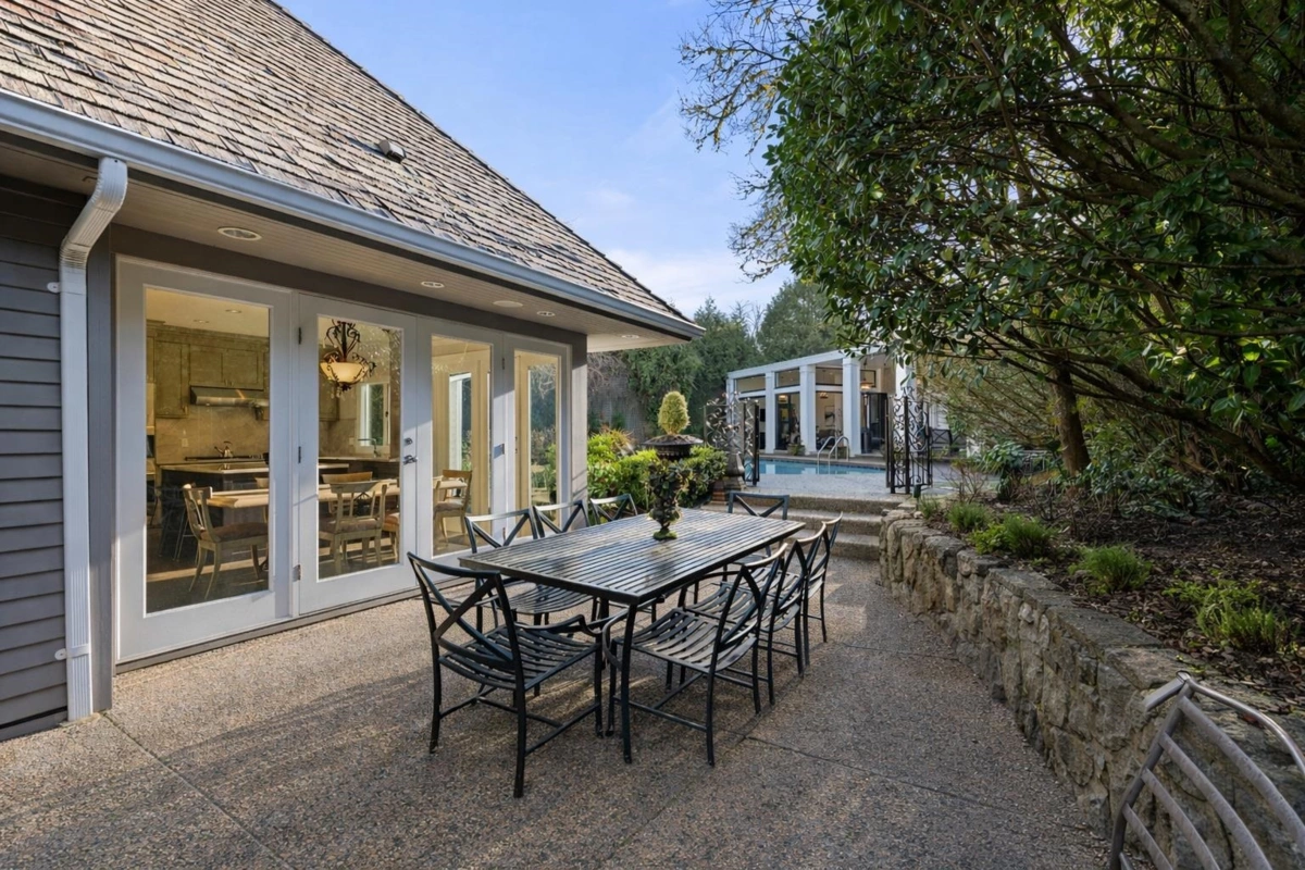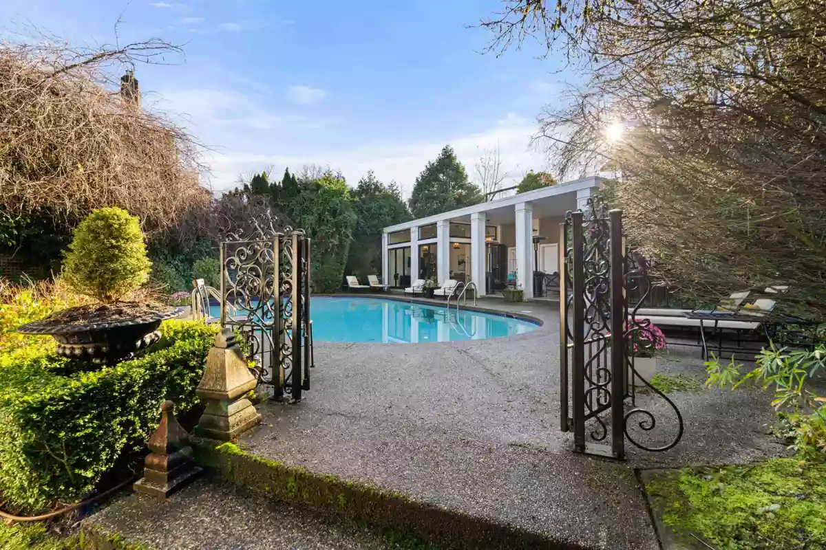 A rare offering in prestigious First Shaughnessy. This elegant coach house provides exceptional living space combined with extraordinary outdoor entertaining areas. Gracious principal rooms feature h/w floors, crown mouldings, and garden outlooks, while the well-appointed kitchen opens directly to outdoor entertaining areas. 3 generous bedrooms up include a sumptuous primary suite with marble ensuite and w/in closet, plus a finished lower level with rec-room, office, and wine room. Private grounds feature a swimming pool, covered cabana, and fully equipped glass enclosed gym, 3-piece pool bathroom, and storage. A detached garage with artist studio above, secure gated entry, and ample parking complete this exceptional offering.