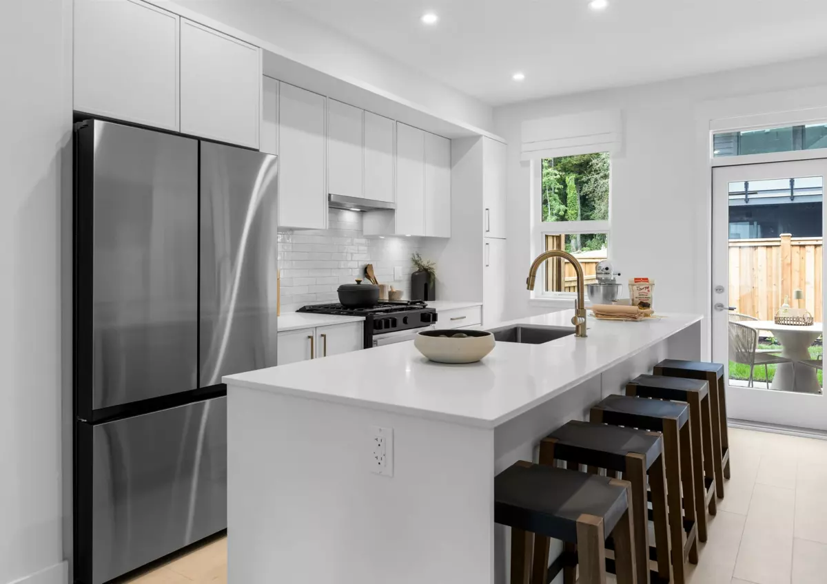 Welcome to VERSANT. A boutique collection of Modern Craftsman-inspired townhomes built by award-winning Infinity Properties. This 3-bed 2.5 bath home features a functional layout for growing families. Large kitchen with custom cabinetry, quartz countertops, SS app w/GAS range and entertaining island with eating bar. Deck off kitchen w/Gas BBQ outlet leads to a RAISED fully fenced BACKYARD. Laminate flooring on main floor, high efficiency gas furnace with AC and Rinnai water heater. Upper floor feat. 3 bedrooms incl. SPACIOUS primary bedroom w/spa inspired ensuite. Enjoy easy access to hiking trails, mountain biking routes + lakes. Only 10 minutes from the Skytrain, West Coast Express + Coquitlam City Centre Shopping + Amenities. Open Sat-Wed 12-5 PM.