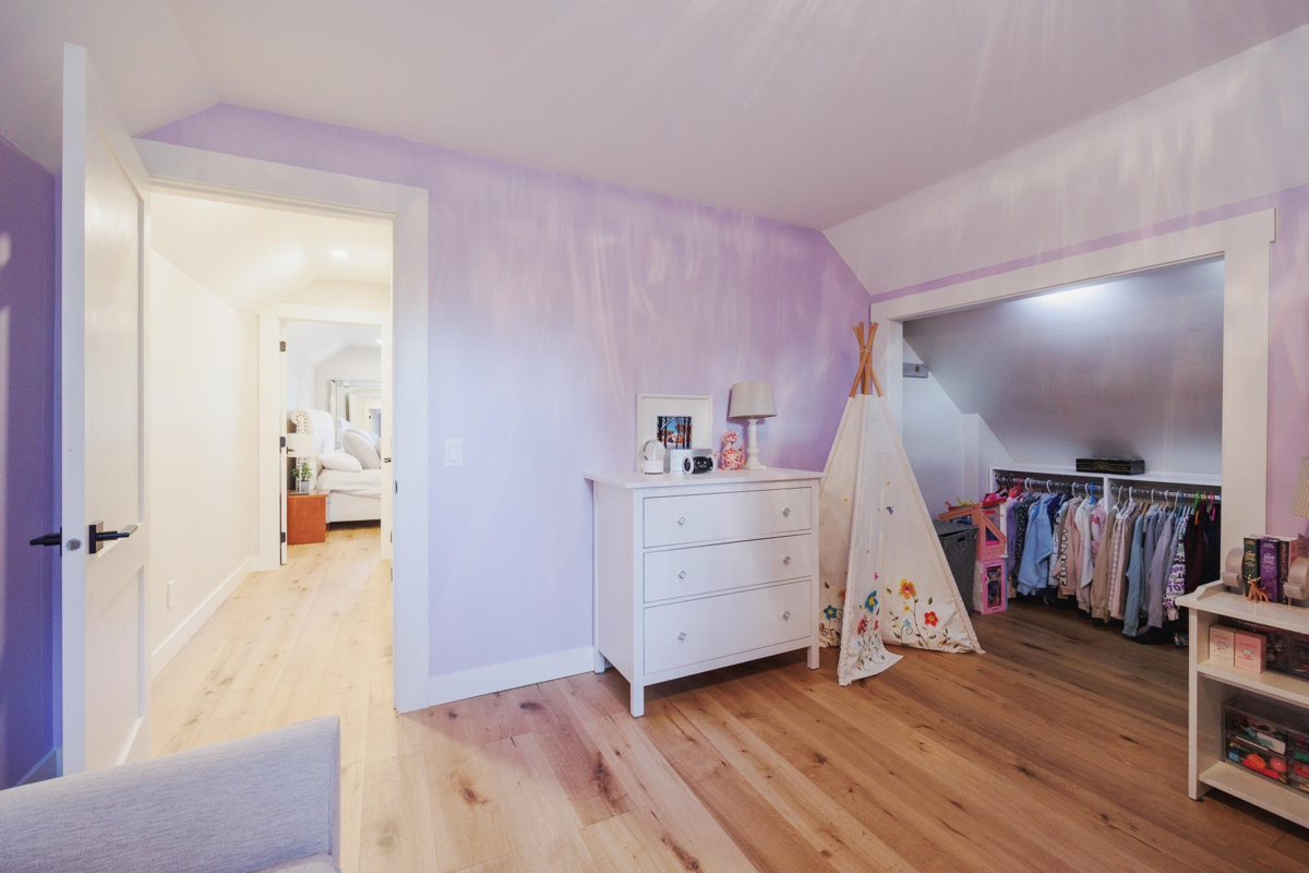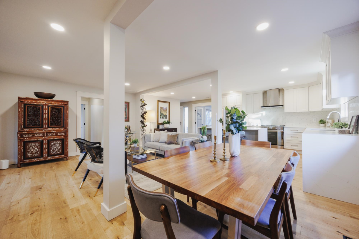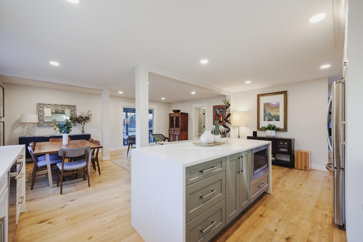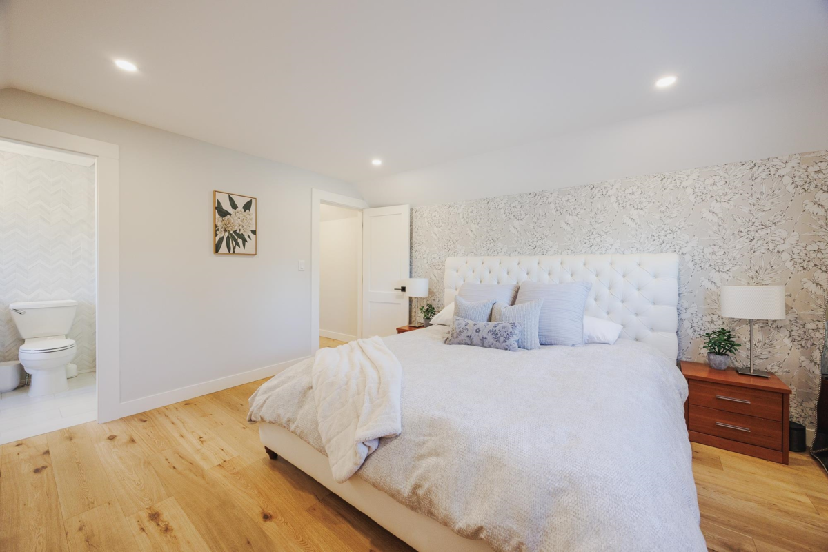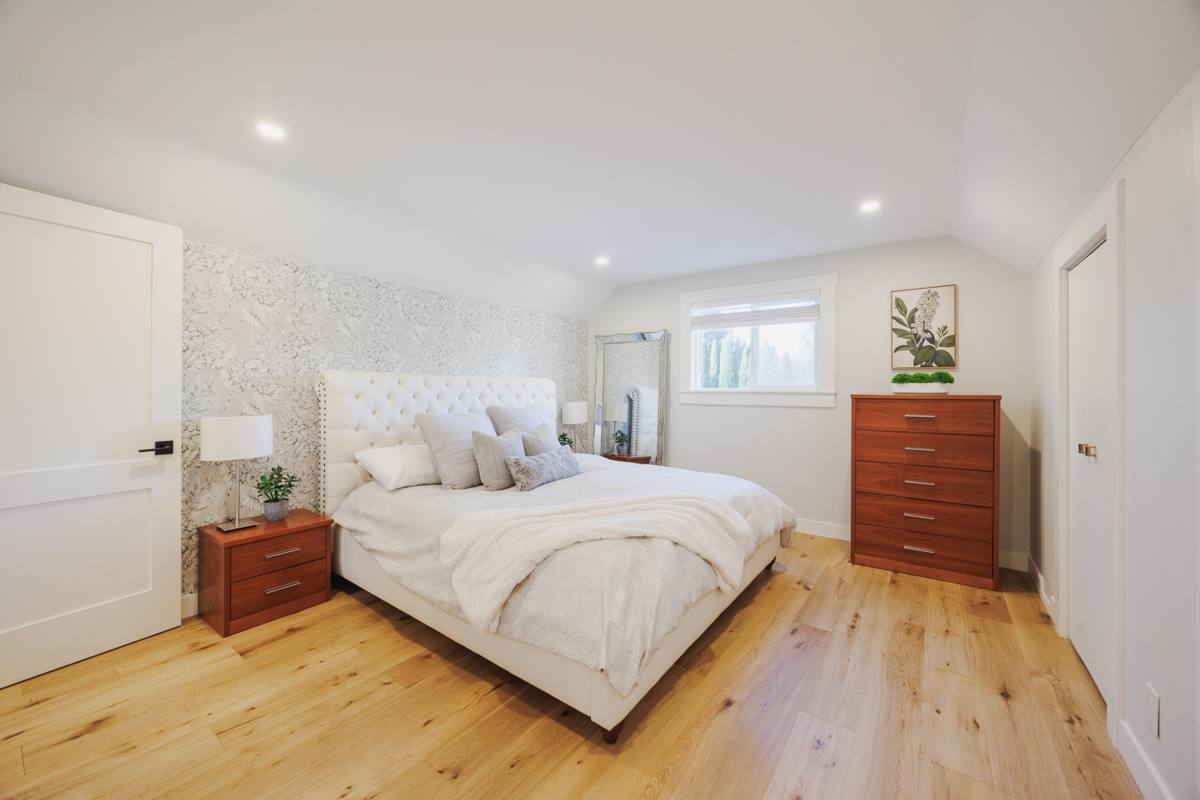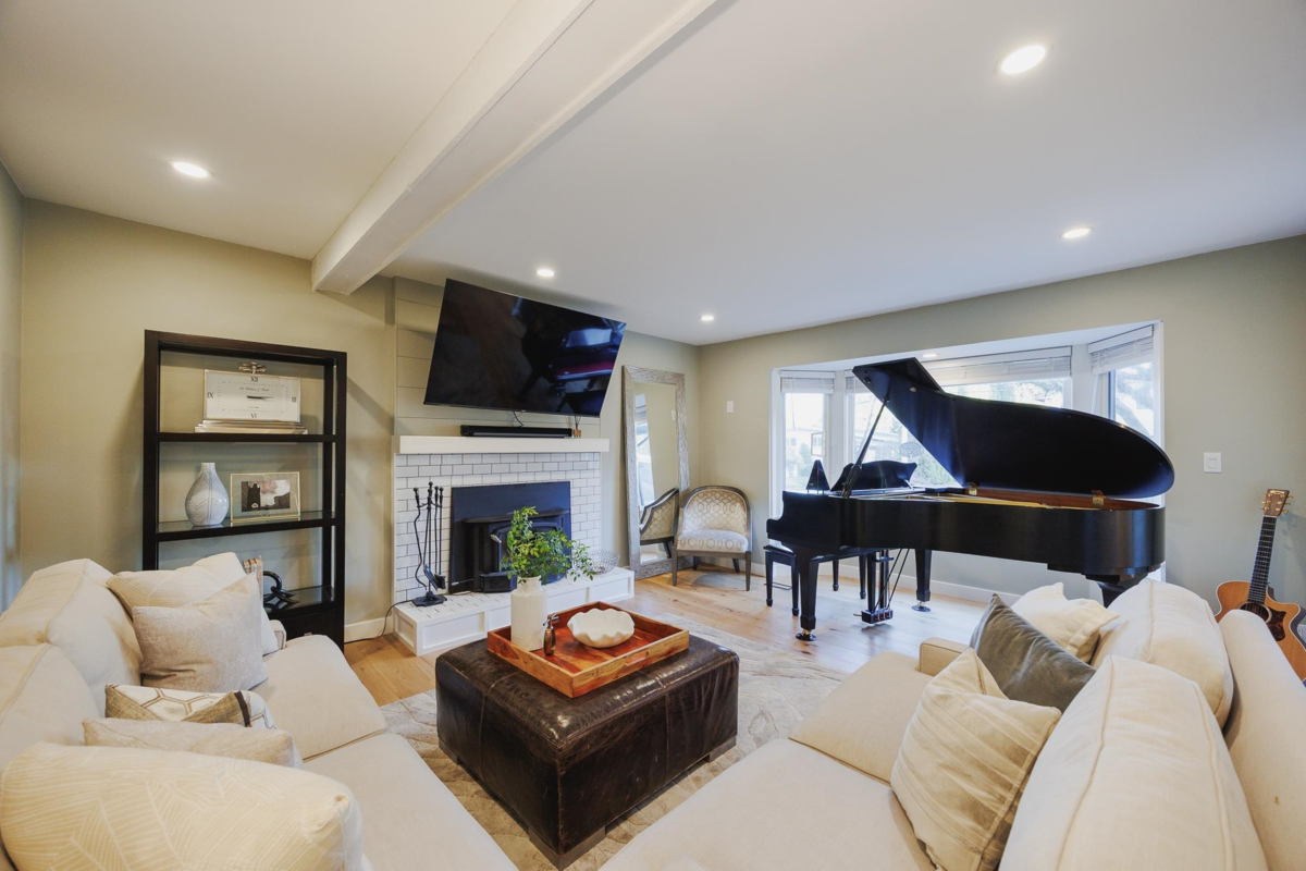 FAMILY FRIENDLY! This tastefully renovated home offers all the modern conveniences while enjoying the larger lot and mature landscaping of days gone by. Stunning kitchen featuring gleaming stone countertops, chevron tile backsplash, engineered wood floors, a massive island, an abundance of shaker cabinets and stainless appliance package including gas range. The large living room offers cozy comfort with a real wood fireplace. 2 bedrooms plus den on the main floor, and 2 fully remodeled bathrooms. Upstairs you will find a thoughtfully designed primary suite with beautifully renovated ensuite with double vanity and a shower built for 2. Additional bedroom upstairs ideal for the littles. Other upgrades included: new ceilings with pot-lights throughout, new window coverings, large deck, etc..