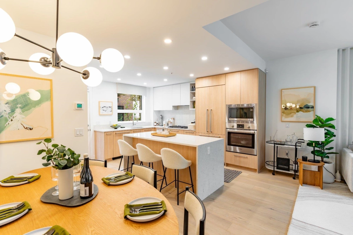 Plan D is a river facing 4 bedroom townhome + flex and 2.5 baths, offering over 1800 square feet of interior living space. This home features direct access to side by side parking and a dedicated flex room. The main floor features an open concept living and dining area. The kitchen includes a premium Bosch appliance package and polished quartz countertops. The bedrooms provide privacy and comfort, including a spacious primary suite overlooking the Capilano River with a walk in closet and spa like ensuite. Enjoy panoramic views of the river and surrounding greenspace, along with the tranquil sound of the water. Open house every Sat/Sun from 12-4PM #116, 2050 Glenaire Drive, or by private appt. Price is net of 30K incentive, terms apply