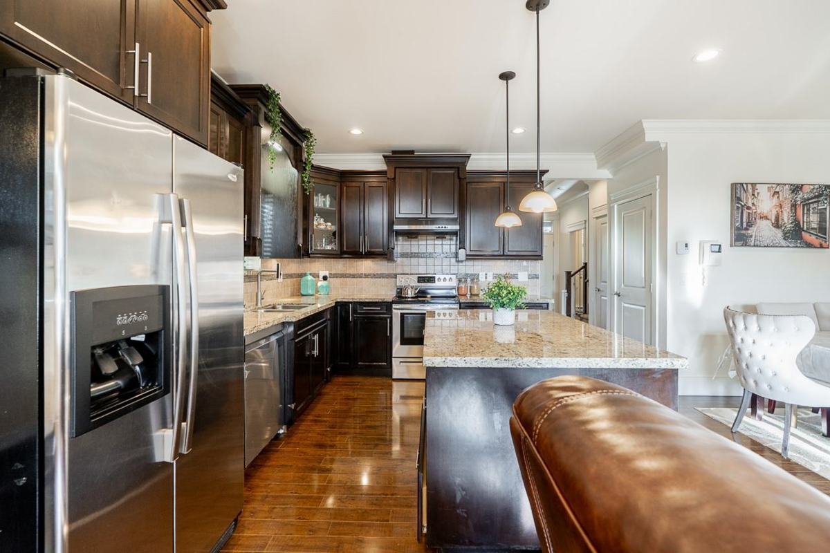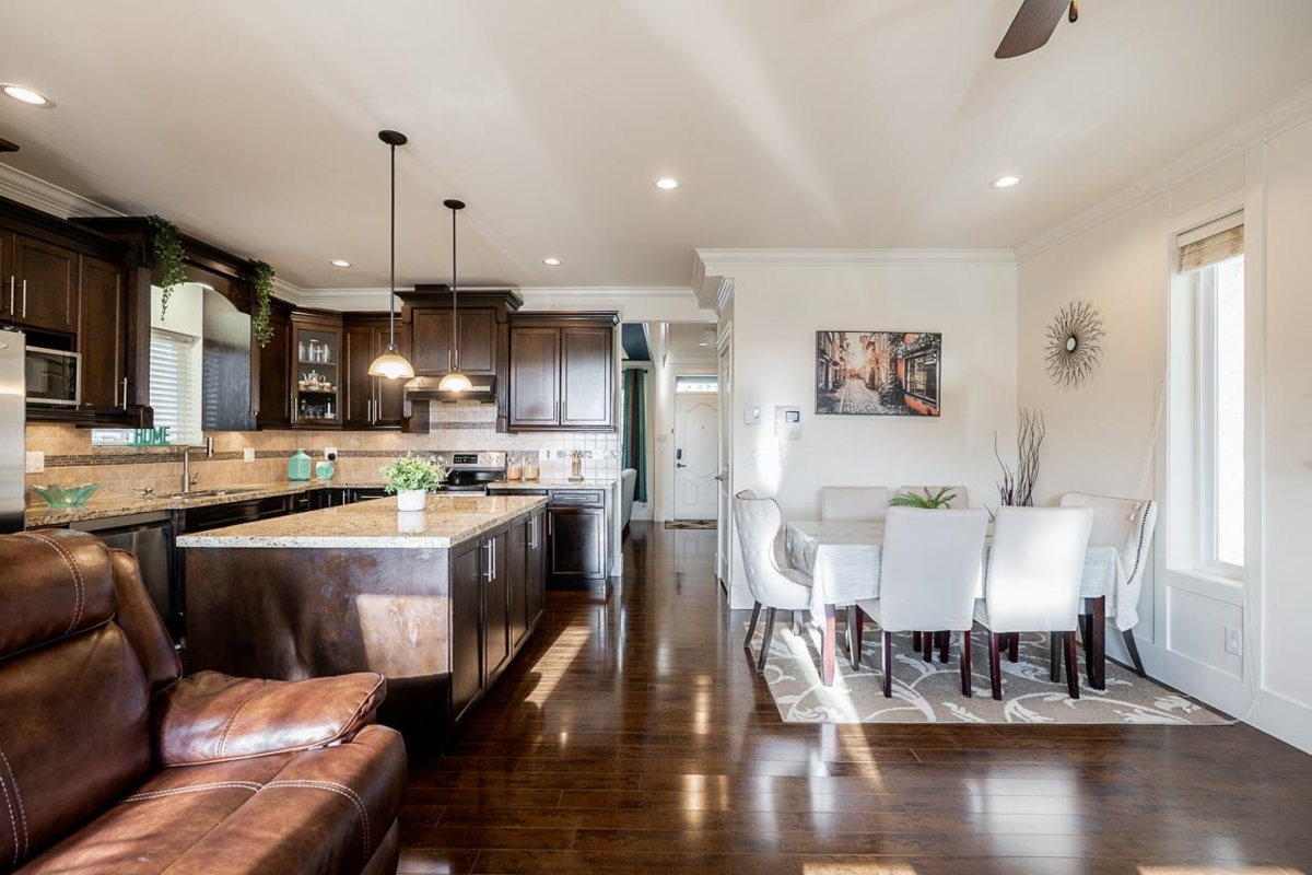 Elegant 5BR 3.5BTH Panorama Ridge residence. Ideally located directly across from Panorama Park, this well-maintained home welcomes you with rich laminate flooring flowing throughout the main level. Just past the convenient powder room and formal living area is a stunning eat-in kitchen featuring granite countertops, stainless steel appliances, and a large island—the perfect gathering place for family and guests. The upper level is dedicated to comfortable bedrooms, with the primary offering vaulted ceilings, a charming window seat, walk-in closet, and a serene ensuite. A bonus loft provides an ideal play area or home office, plus a separate-entry 2BR 1BTH basement suite. Access the detached double garage via lane and enjoy walking distance to both levels of schools and bus stops. Grocery