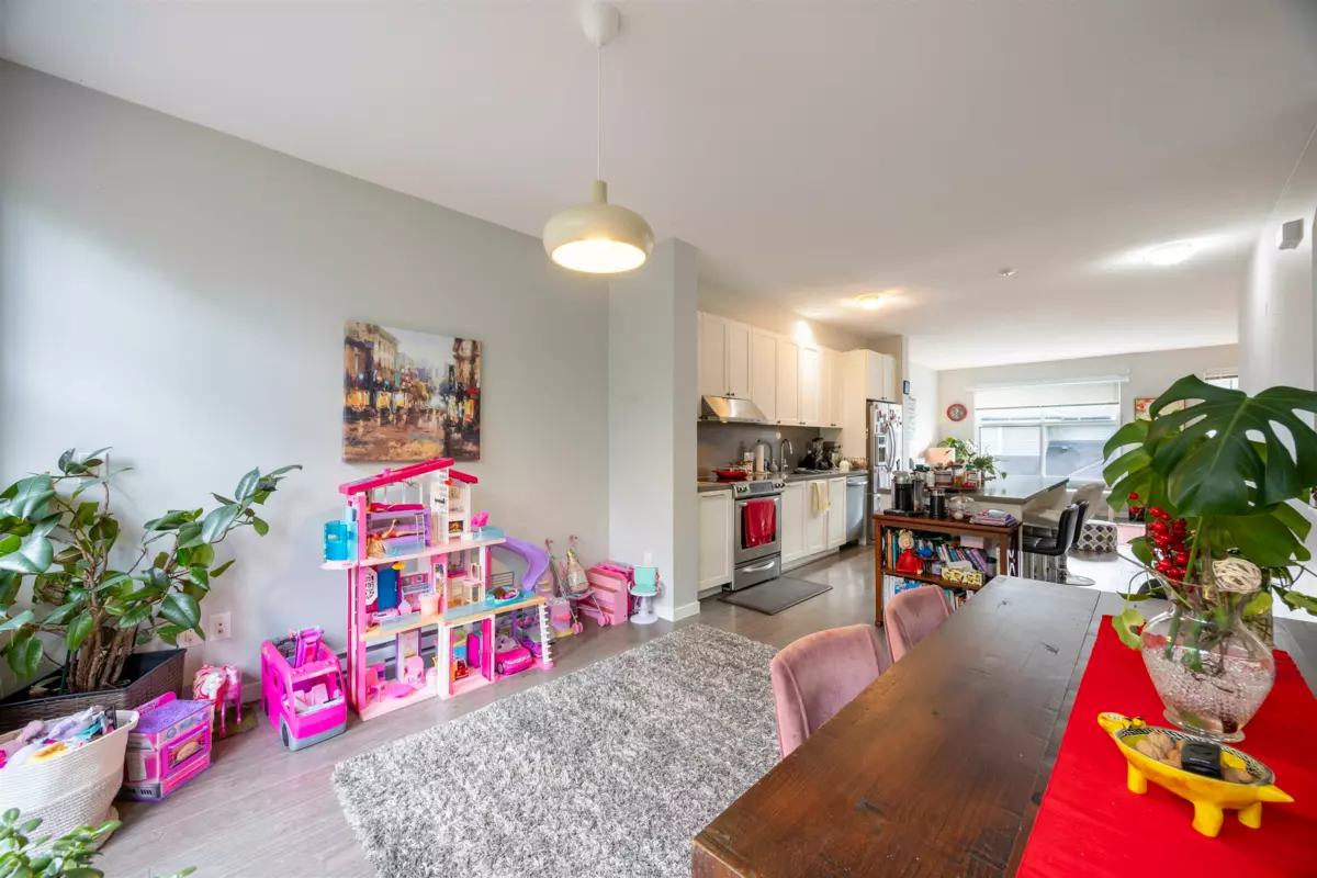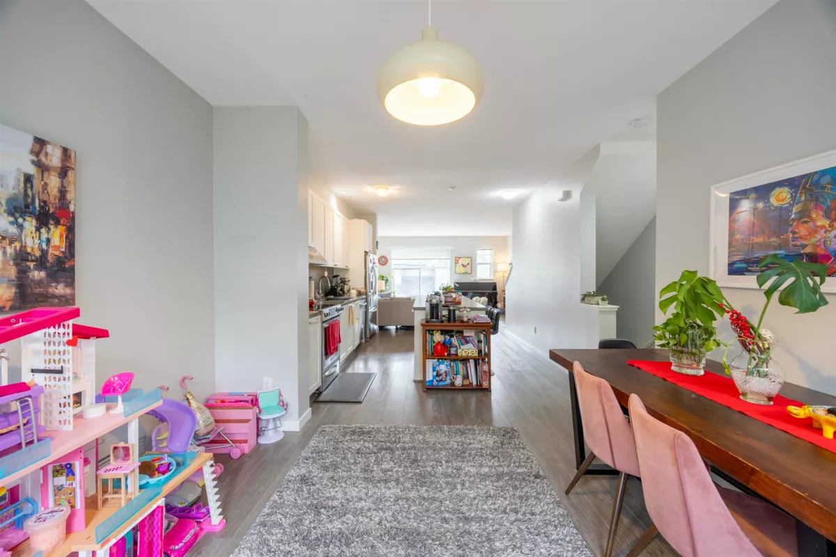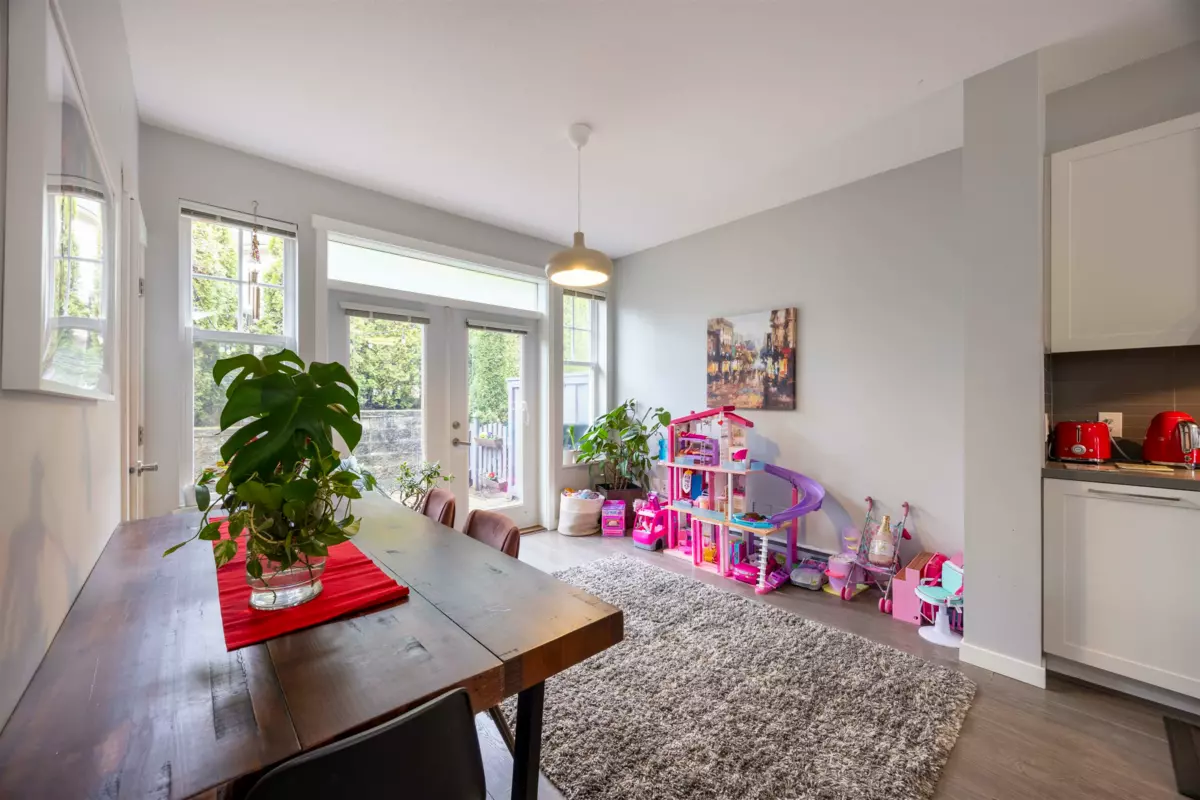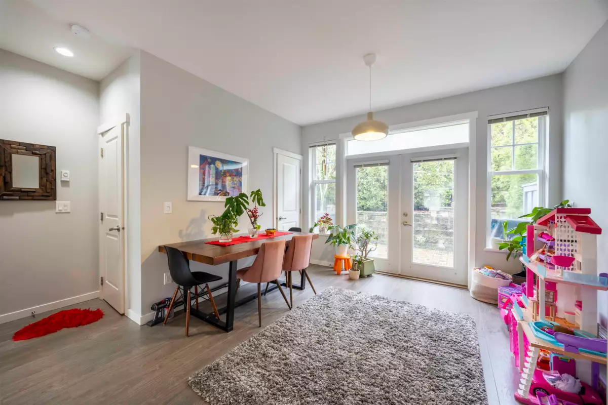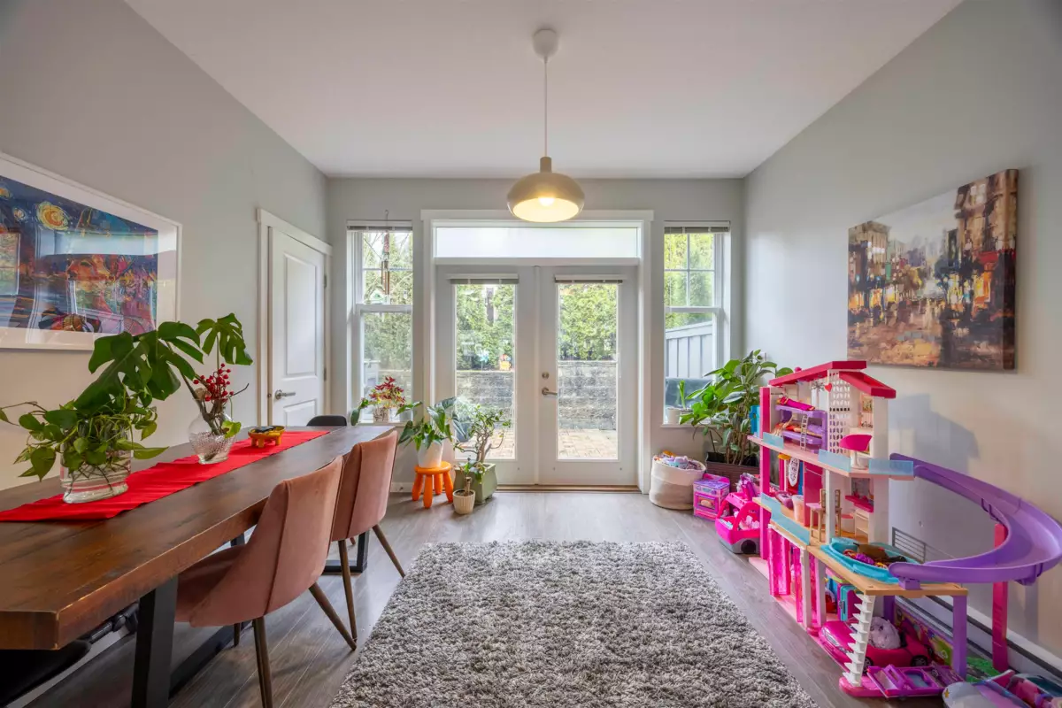 Nestled in a picturesque Craftsman-style townhome community built by Polygon, this stunning home is a nature lover’s dream. Situated on a sun-drenched south-facing slope, it offers the perfect balance of tranquility and convenience, surrounded by creeks and trails while remaining just minutes from everyday essentials. The bright white kitchen features a spacious island, seamlessly flowing into the open-concept living area—perfect for entertaining. A convenient powder room is located on the main floor, while elegant French doors in the dining area lead to a private, paved patio, ideal for outdoor relaxation. Upstairs, you’ll find three generously sized bedrooms, including a master suite with modern