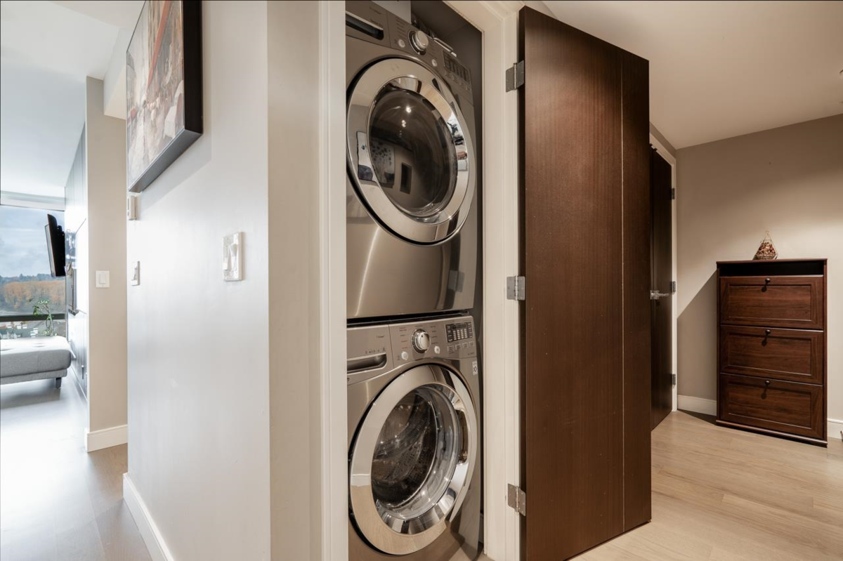 Resort-style living at its best. This beautiful 1-bedroom at The Peninsula offers stunning views, high-end finishes, and a sleek kitchen with fully integrated Gaggenau appliances. Enjoy a large covered deck with a natural gas BBQ hookup and the peaceful vibe of Queensborough, steps to parks, riverfront trails, and the Q-to-Q Ferry. Only 5 minutes to Costco for added convenience. The elegant 4-piece bath features in-floor heating, and the building offers concierge service, a full fitness centre, hot tub, steam room, theatre room, party room, chef’s kitchen/lounge, and a guest suite for $75/night. Rentals allowed.