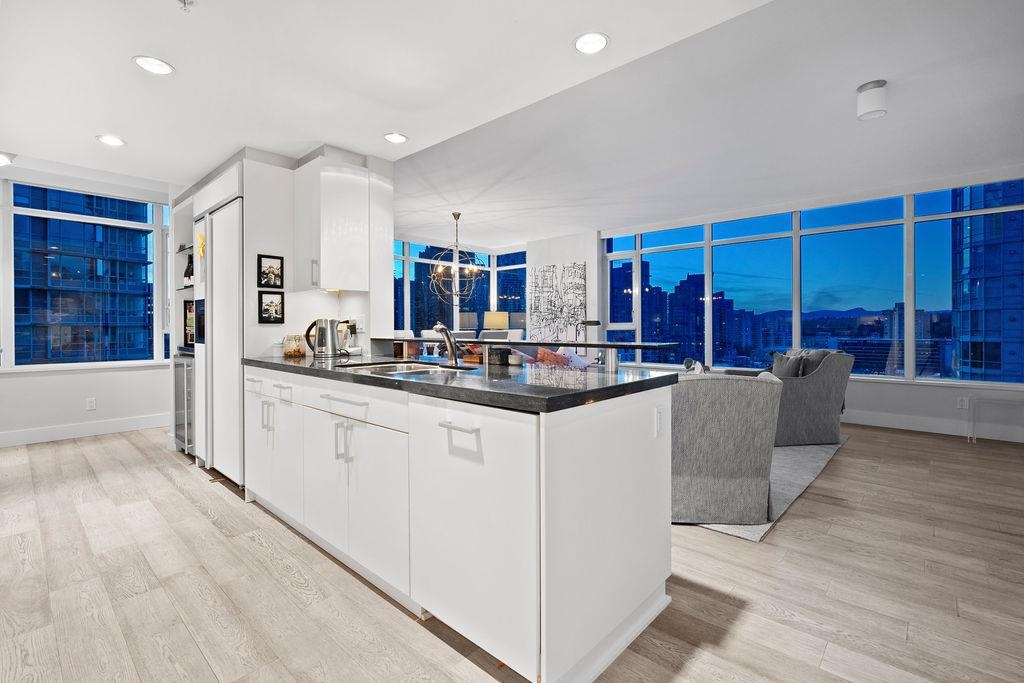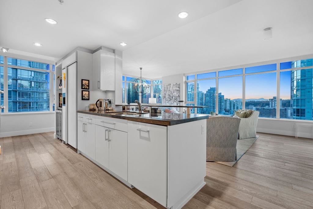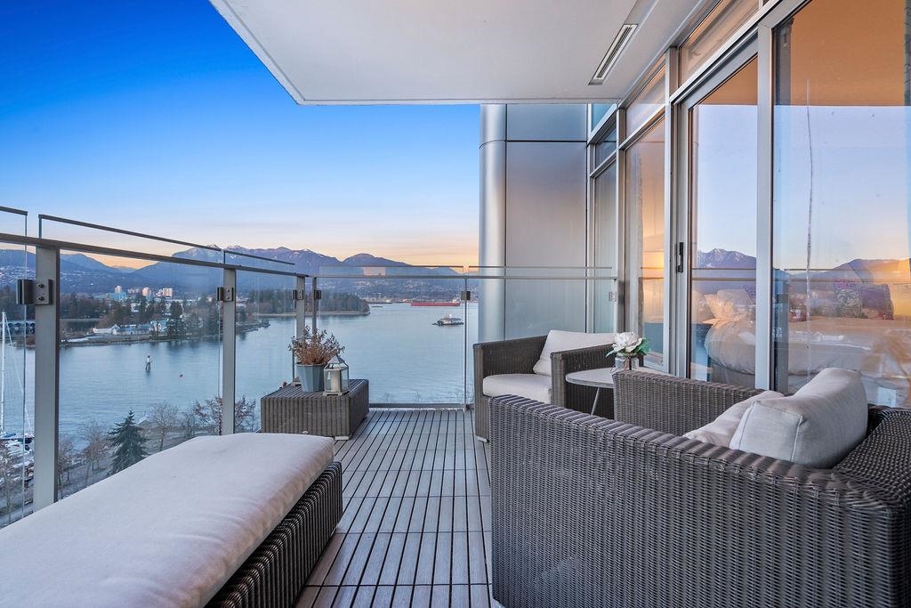 Welcome to Vancouver's iconic Callisto - where your WATERFRONT oasis awaits. Spectacular ocean & mountain vistas greet you in this 1378 sf NW corner residence on Coal Harbour's Front Row. Featuring 2 spacious bedrooms plus office, extensively upgraded kitchen, opulent primary ensuite w/deep soaker tub, central AC, custom built-ins throughout, premium hardwood flooring, & large balcony overlooking the marina & seawall. Resort-style amenities incl. indoor pool, steam room, hot tub w/views, fitness centre, theatre room, & 24hr concierge. Step outside & you are minutes to Stanley Park, Canada Place, the West End, retail, fine dining & shopping. 2 parking & storage locker (in addition to in-unit storage) are conveniently yours. Don't miss this exceptional home, book your private showing today.