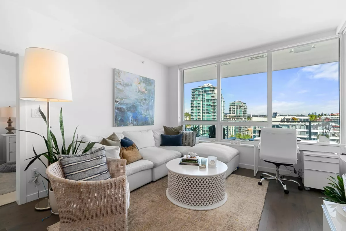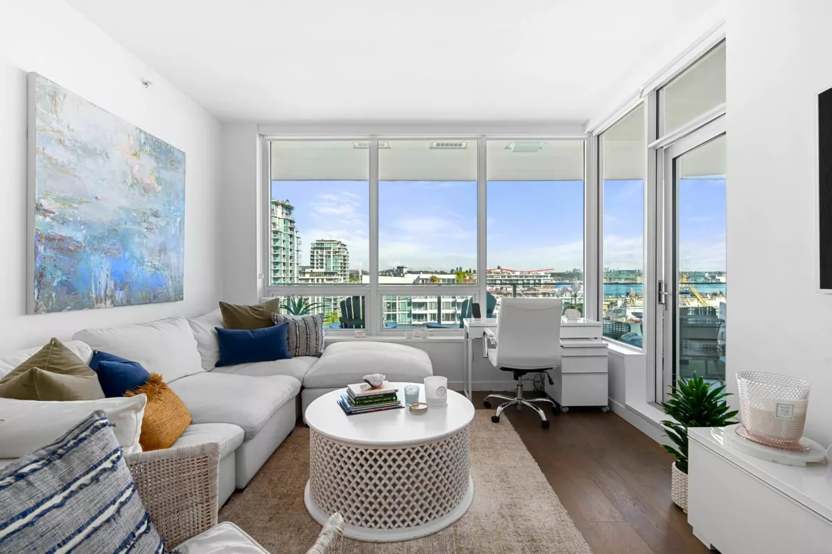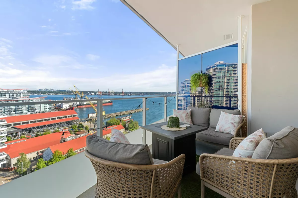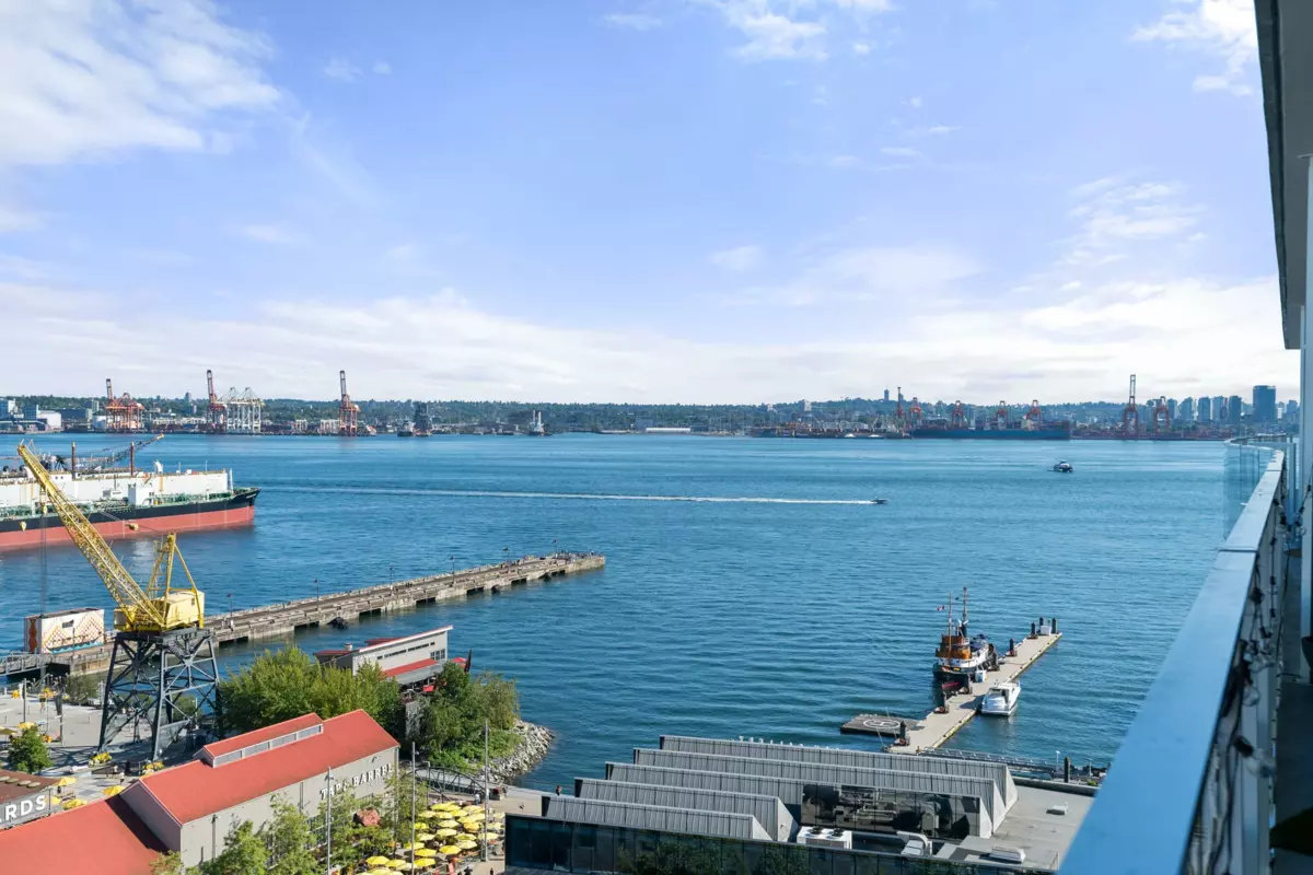 Ocean VIEWS! The Promenade by the award-winning Polygon. Offering bright & spacious 868 sq.ft. 2-bedroom, 2-bath sub-penthouse home with a very bright open layout, bright kitchen, separated bedrooms and AIR CONDITIONING. Enjoy breathtaking ocean views year-round from the oversized covered patio. Endless luxury finishings in this space including gleaming hardwood, a gourmet kitchen with integrated appliances, and a spa-inspired master ensuite with a rain shower. Situated across from the iconic Lonsdale Quay, steps away from the Shipyards, vibrant dining, shopping, Seabus & Spirit Trail. Building amenities: fitness center & billiard lounge. 1 storage & 1 parking with R/I for EV charger, extra parking currently rented, and separate E-bike storage. This location cannot be beat!