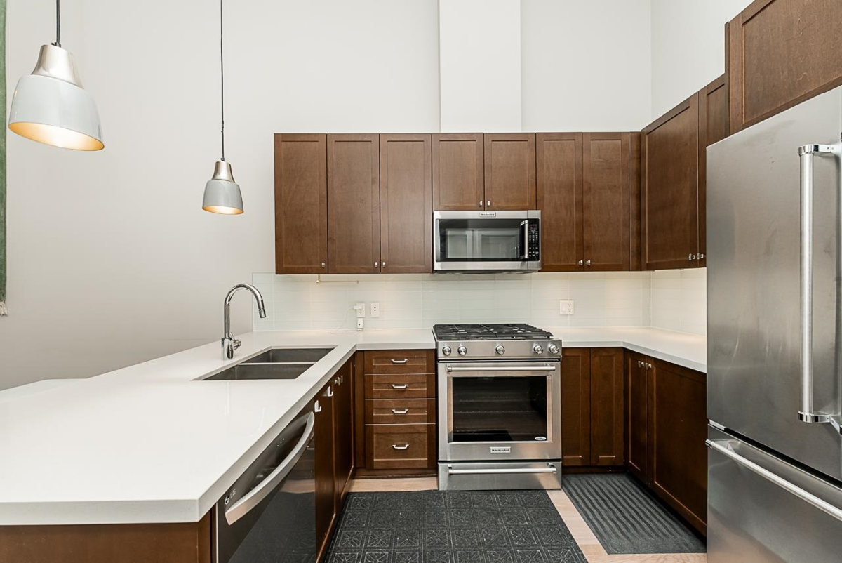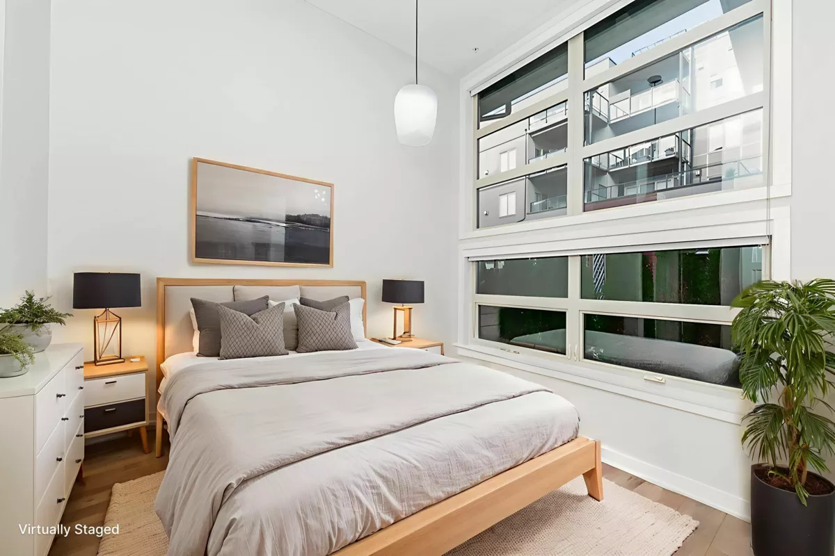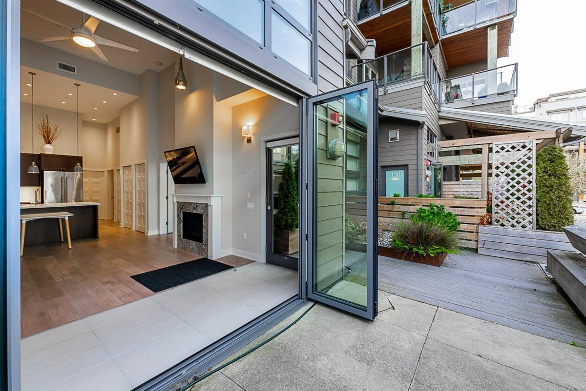 Welcome to "The Pier" in Steveston’s rarely available London Landing! This east-facing ground-level 1 bed + den unit features soaring 15’ ceilings and floor-to-ceiling windows that flood the space with natural light. With just under 750 sq ft, it offers 2 full bathrooms, a beautiful kitchen, and a versatile den that can be used as a 2nd bedroom or office. Enjoy seamless indoor-outdoor living with large bi-fold doors leading to your spacious garden patio, complete with a gas hookup. Steps from scenic dyke trails and a brand new waterfront park. Includes 1 parking and 1 locker. Rentals and pets allowed. A truly special home—don’t miss out! Jan 24 Sat 2 to 4pm open house.