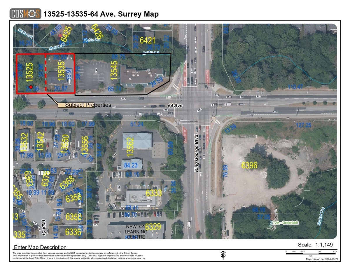 Excellent opportunity to build your dream duplex on this 87+ ft. wide ¼-acre lot or develop multifamily under the approved Newton–King George Boulevard Plan. Located just two lots west of King George Blvd & 64 Ave, with the adjacent ¼-acre parcel (13535 64 Ave) also available—offering nearly ½ acre with 174+ ft. frontage for an ideal land assembly. TransLink’s 2025 plan includes 12 new stations along King George Blvd., including one at 64 Ave. Bus stop out front and quick access to King George Blvd., SkyTrain, and Surrey City Centre. Submit Offers!