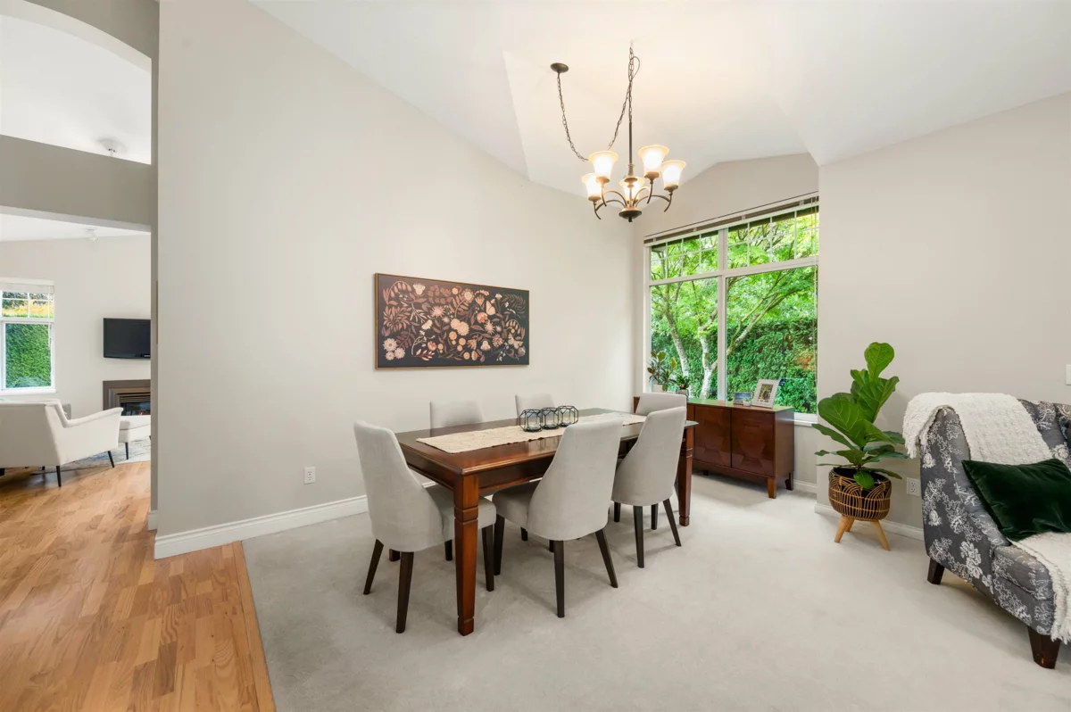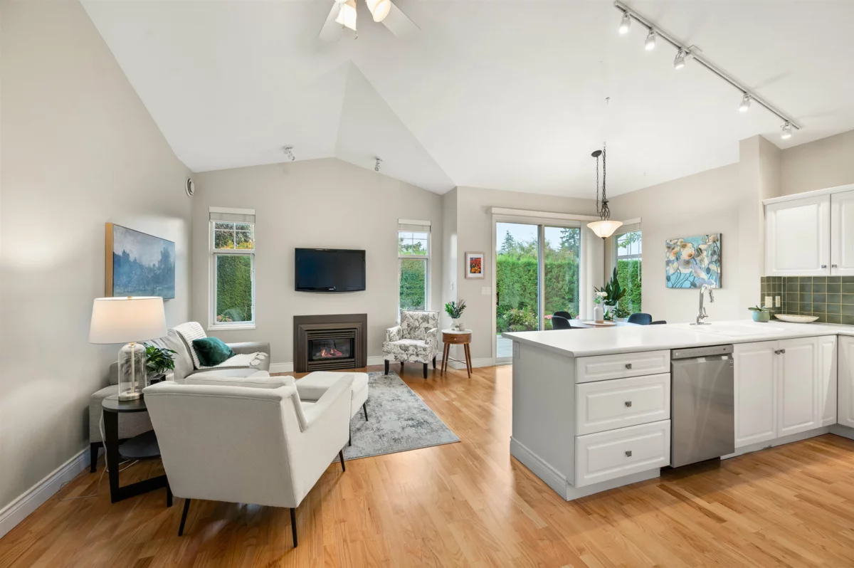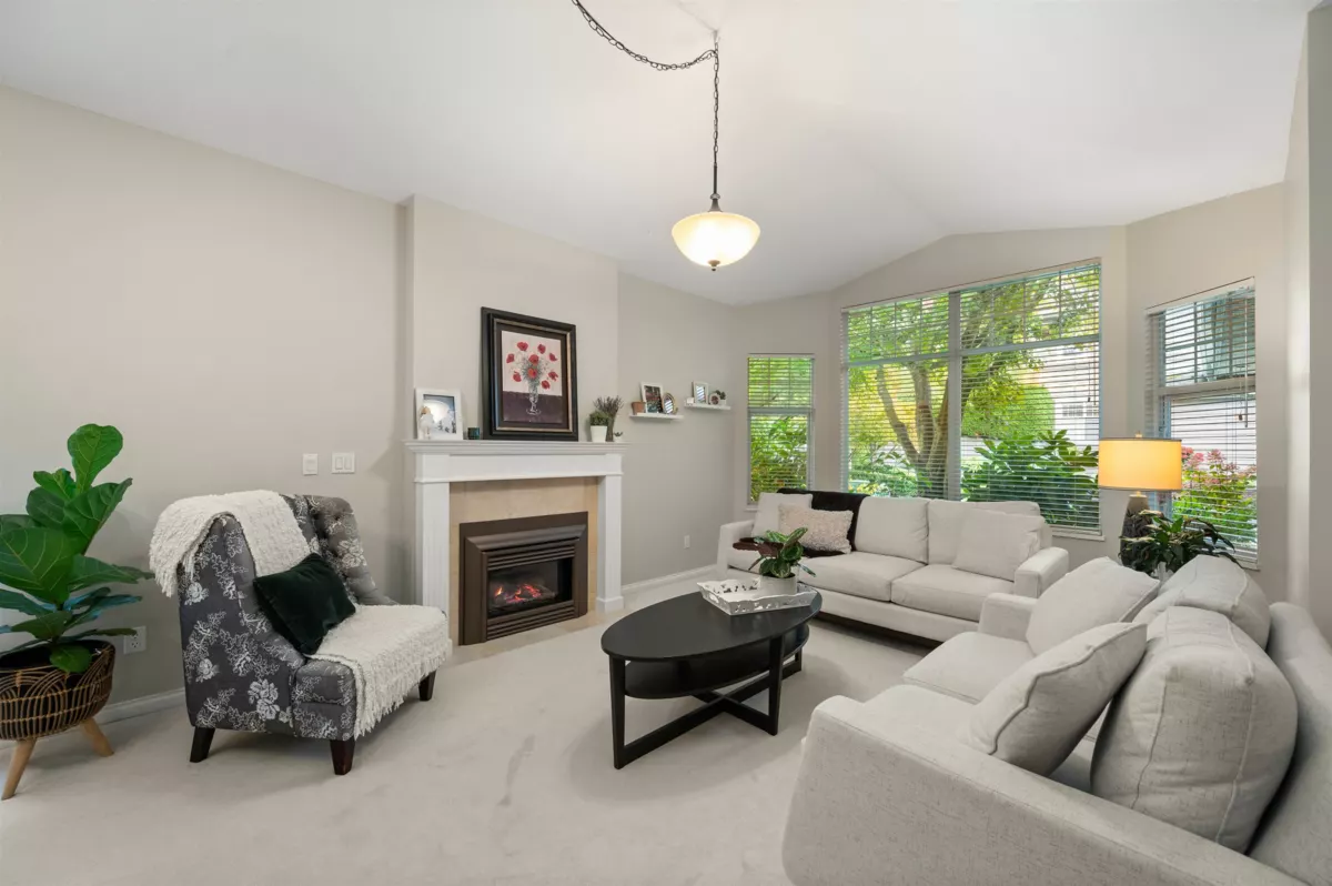 Rarely available RANCHER style END UNIT townhome in the sought after St. Martin’s Lane. Quality built by Polygon and quietly tucked at the end of the complex, this spacious 1580 sqft home with 2 bedrooms and 2 bathrooms is surrounded by beautifully landscaped gardens and a private yard with mature hedges. Inside, high pitched ceilings and large windows fill the home with natural light. The kitchen features stainless steel appliances upgraded approximately two years ago, while both the living and family rooms surround high end Valor gas fireplaces. A designated dining area comfortably fits a large table for gatherings with family and friends. The generous primary suite on the main includes a 5 piece ensuite, deep walk in closet, and peaceful garden views. Very well run strata!