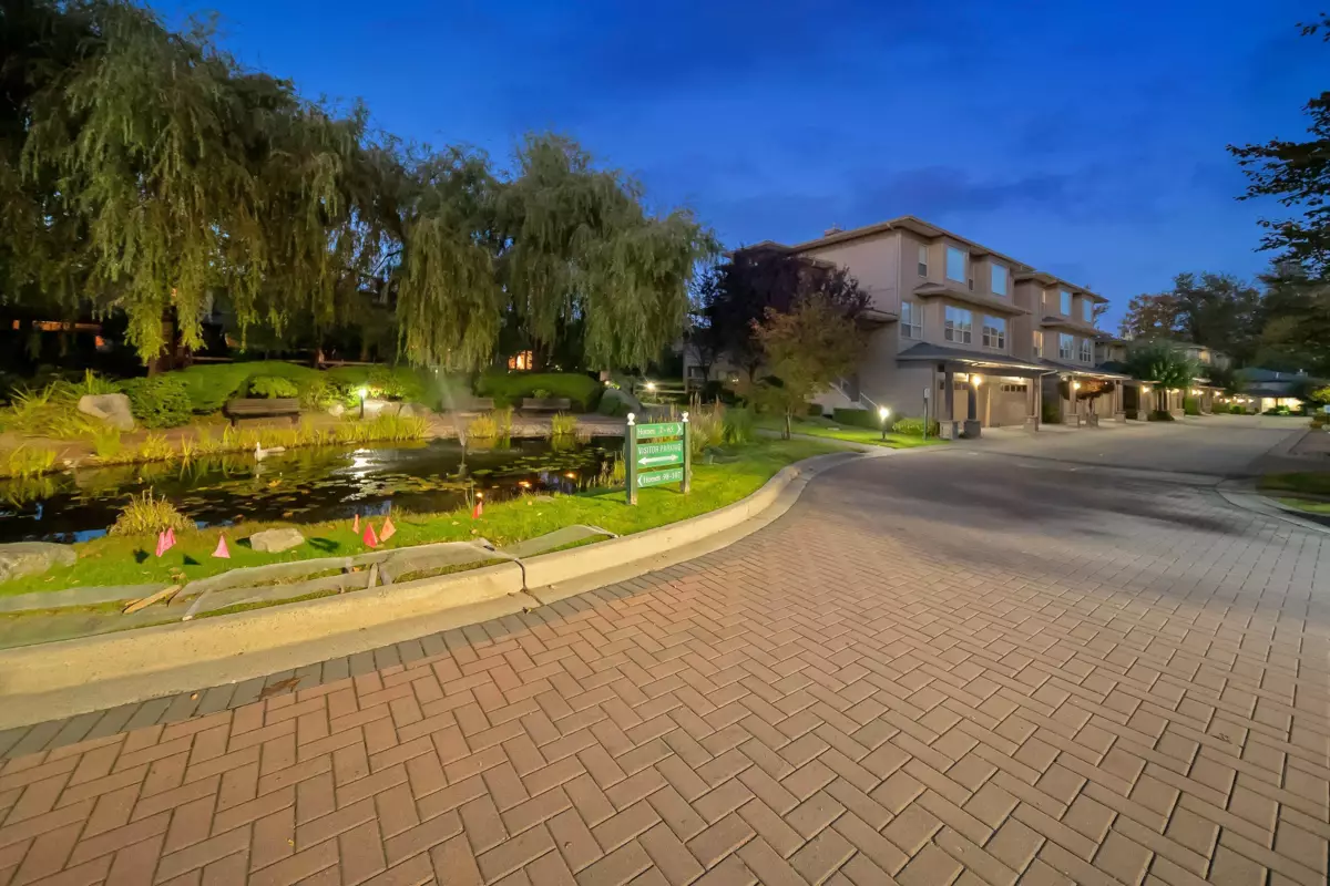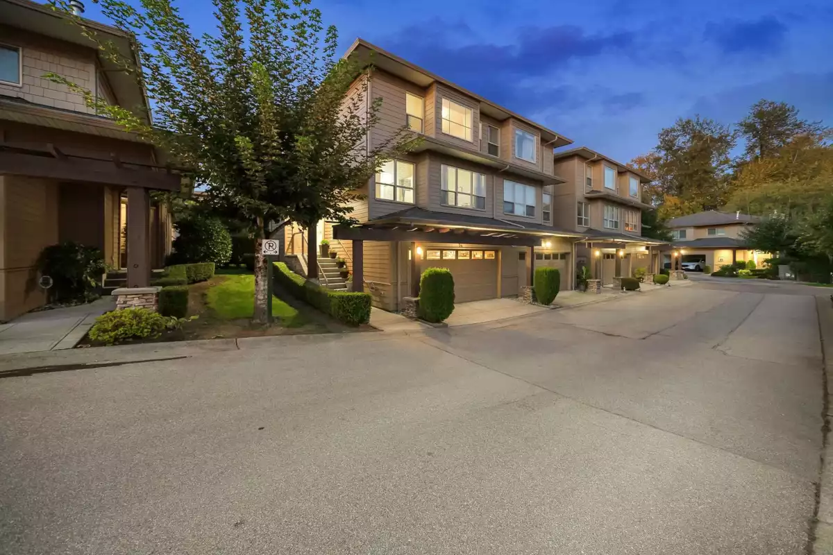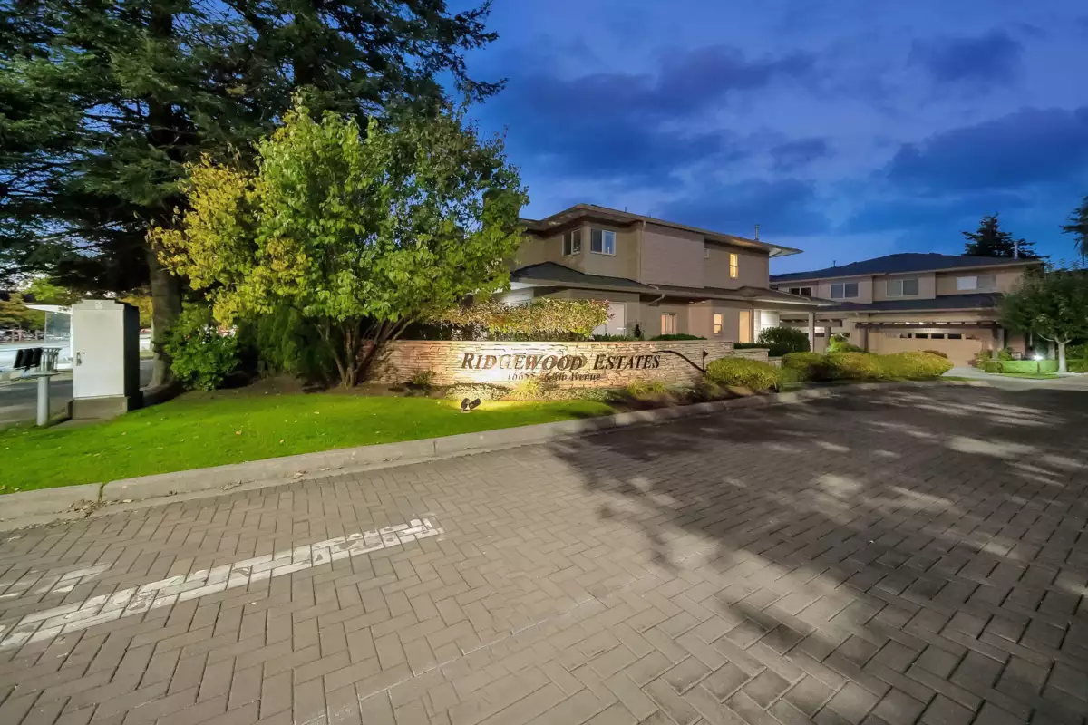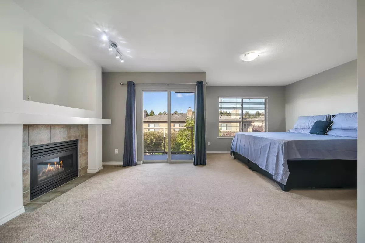 Welcome to Ridgewoods- a beautifully maintained air-conditioned end-unit townhouse offering nearly 2,200 sqft of elegant living in a highly desirable Cloverdale location. The bright, open-concept main floor features large windows, skylights, a cozy gas fireplace, spacious dining area, and a sunny deck. The modern kitchen offers abundant cabinetry and workspace, perfect for entertaining. Upstairs awaits a luxurious primary suite with fireplace, private balcony, walk-in closet, and spa-style ensuite with heated floors. Two additional bedrooms plus a full basement with recreation and games rooms add flexibility for family living. Double side-by-side garage, updated roof (2021), and resort-style amenities- clubhouse, guest suites, and fitness centre. Steps to Northview Golf Club.