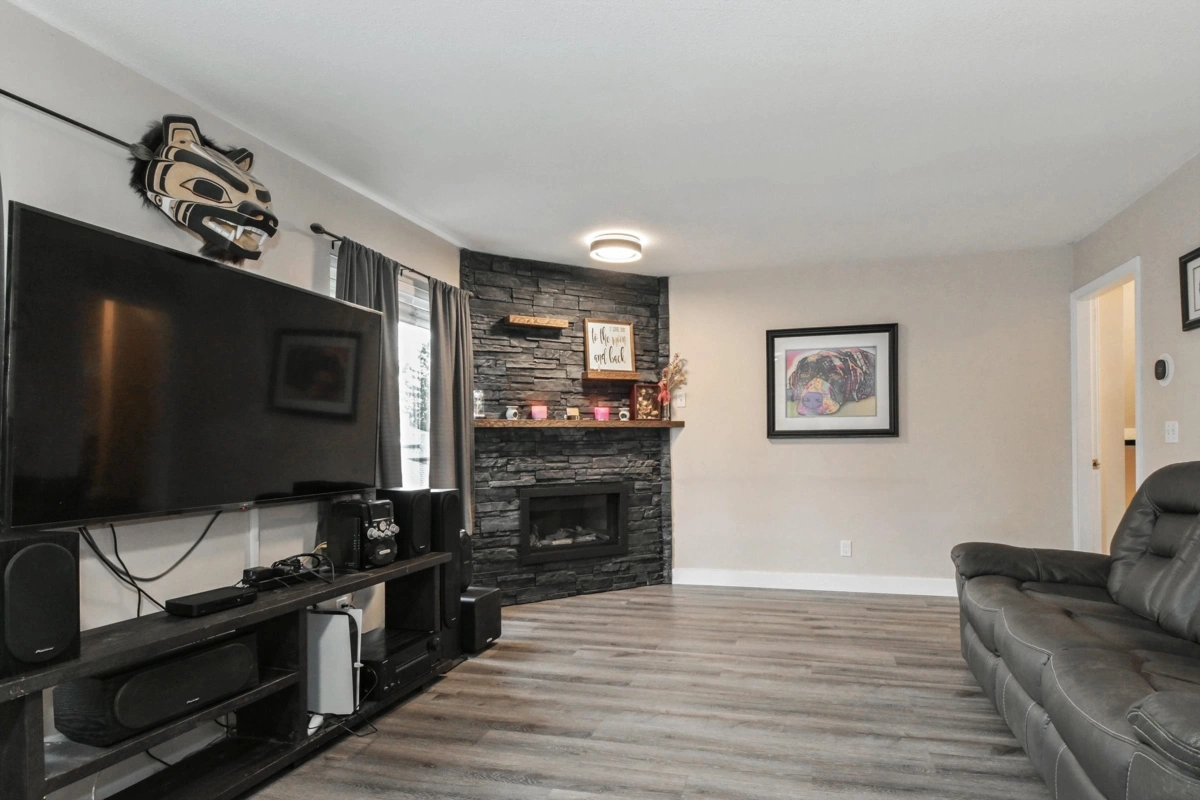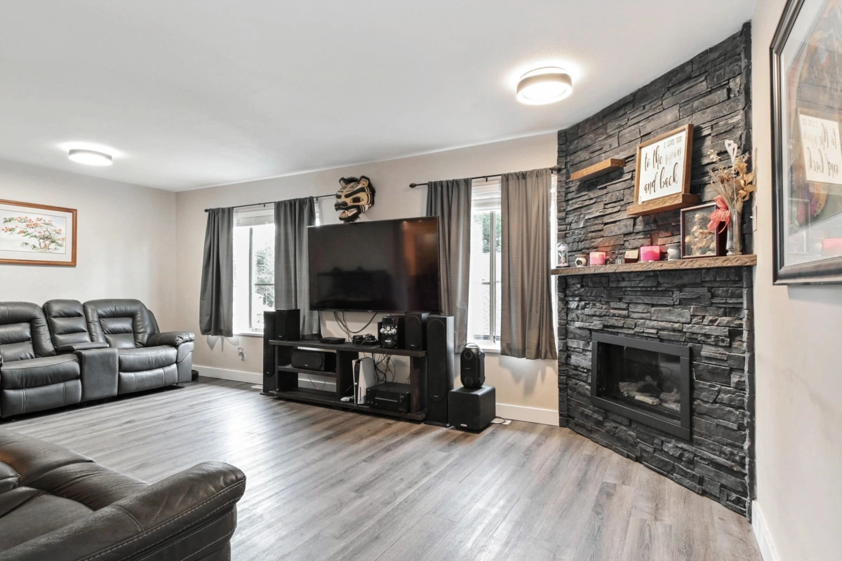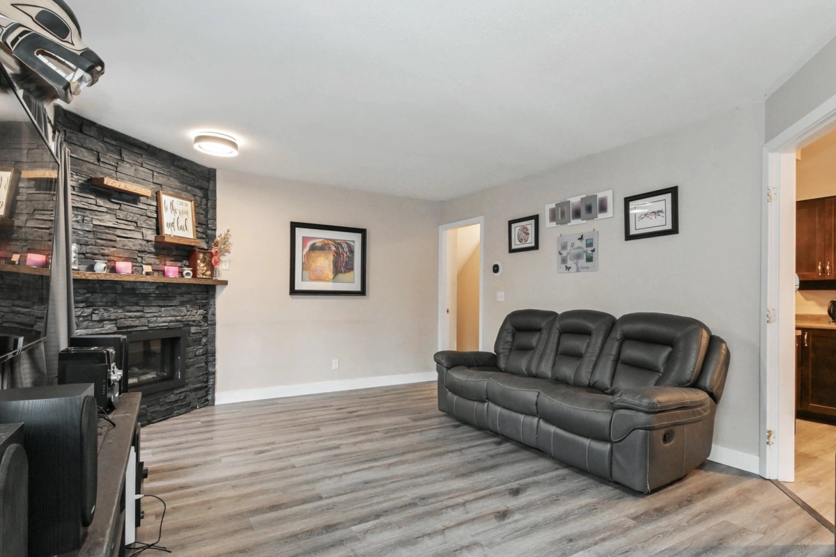 End unit. Family sized Townhouse. Features 3 bedrooms 2 full renovated bathrooms. Spacious living area with new gas fireplace. Renovated kitchen w/stainless steel appliances & separate eating area. Sliding glass doors lead out to a fully fenced private patio/yard area backing onto green space. Upstairs features extra large master bedroom with walk in closet and ensuite bath. Tasteful mix of newer vinyl plank, laminate & tile flooring. Hard to find Double side by side Garage. Lots of storage with large crawl space. Bonus! New gas furnace, heat pump/central air conditioning, Navien tankless hot water system. Walk to Westcoast express, nearby pubs, restaurants, shopping & services. Near parks, recreation, lakes & rivers. Easy commute to downtown Vancouver.