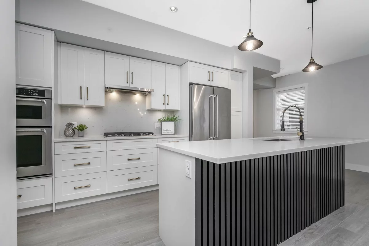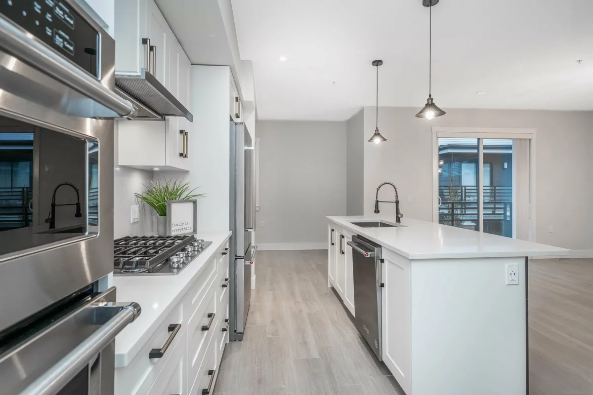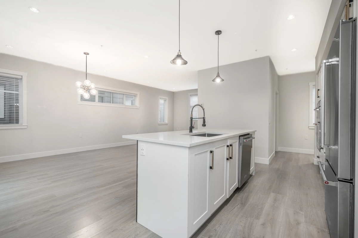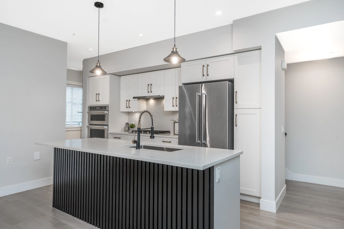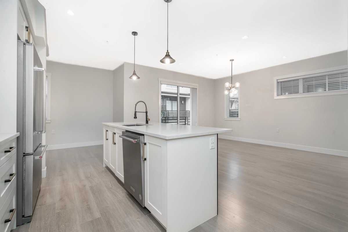RARE 1,682 sf 2 bdrm/3bath END unit townhome in the heart of Murrayville. Built by Zenterra, an award-winning builder known for quality & craftsmanship. This gently lived-in home offers modern comfort. An inviting open-concept main floor w/ a spacious kitchen, abundant cabinetry, updated lighting, a generous island—perfect for cooking & entertaining. The bright living room incl a cozy F/P, 9’ ceilings, & expansive windows that flood the space with natural light. A powder rm & good sized deck complete the main floor. Upstairs, the impressive primary bdrm showcases a 14’ vaulted ceiling, two closets & well appointed ensuite. The 2nd bedroom is generously sized, plus laundry on upper floor. Other features incl fenced yard, 26'5 x 23'5 GARAGE that fits a FULL SIZE truck, A/C, HW on demand