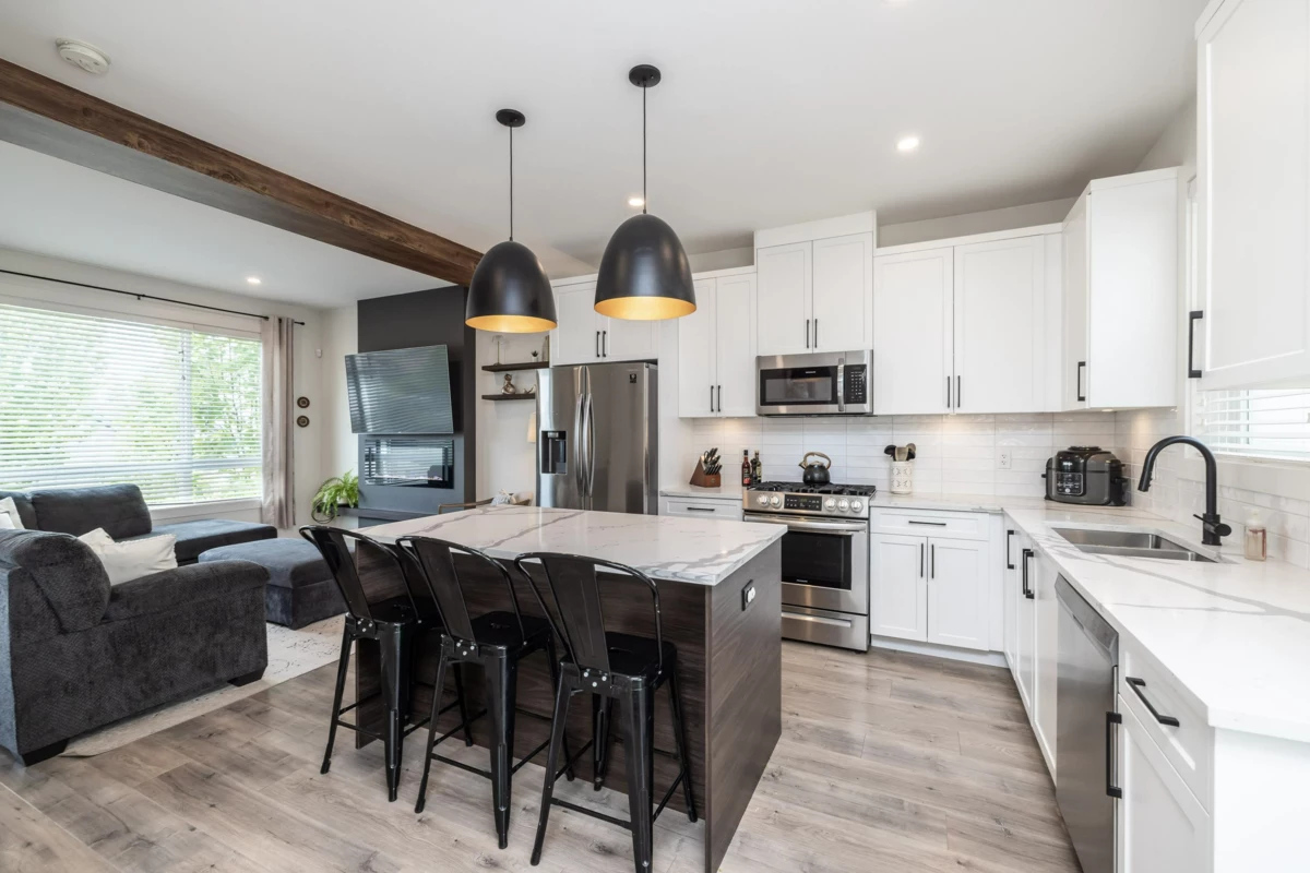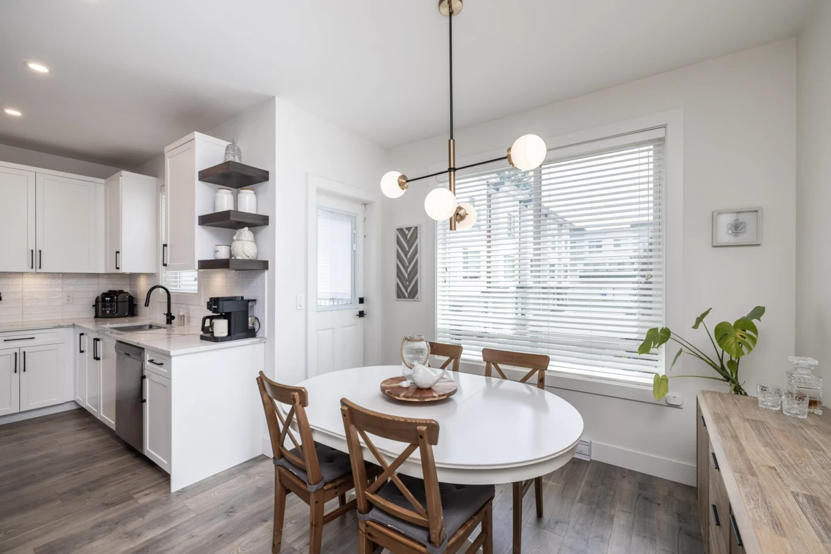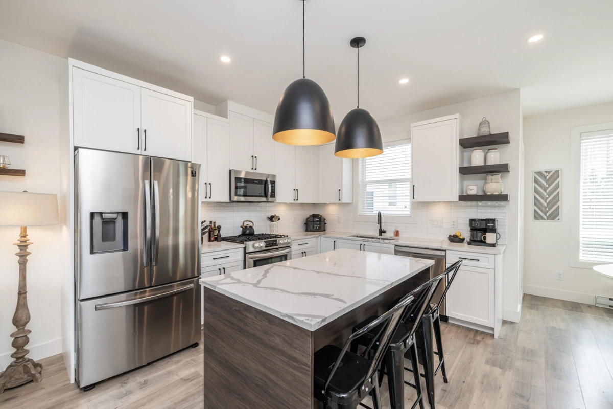 Family friendly Lantern Park is situated in a prime location, walking distance to all amenities, schools & transit. This 1472 sq ft home offers 4 bdrms ( 3 up, 1 down) 3 bthrms & a great, functional floor plan. Kitchen has pantry, tons of white cabinetry with stylish black accents/hardware, & quality S/S appliances including gas. The island/ prep space has seating for 3 & there is a convenient 2 pc powder rm on the main. Step out to the south facing deck that offers gas hookup to barbeque. Laundry up & primary suite has walk in closet & 4 pc ensuite. Head down where you will find an additional bedroom/ flex space with custom desk! Double side by side garage with epoxy upgrade, & ample street parking for visitors. Call today to view this fantastic home, & re discover what community is!