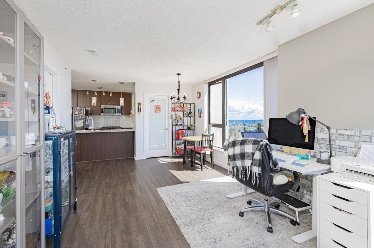 Emerson by Bosa in Highgate Village offers a newly painted southwest-facing corner unit with expansive windows that boast views of Gouse Mountain, Vancouver Island, the Pacific Ocean, and Metrotown. This comfortable unit includes one bedroom and a den, which can also serve as a bedroom. It features stainless steel appliances, granite countertops, premium laminate flooring, and includes one parking space and a storage locker. The complex offers two exercise rooms and a room for parties or meetings. Highgate Village is home to Save-on-Foods, Shoppers Drug Mart, and several other retail outlets. It is conveniently close to the public library, various restaurants, and within walking distance of a community center with excellent swimming facilities. Open House Sat July 20th from 2:00 - 4:00