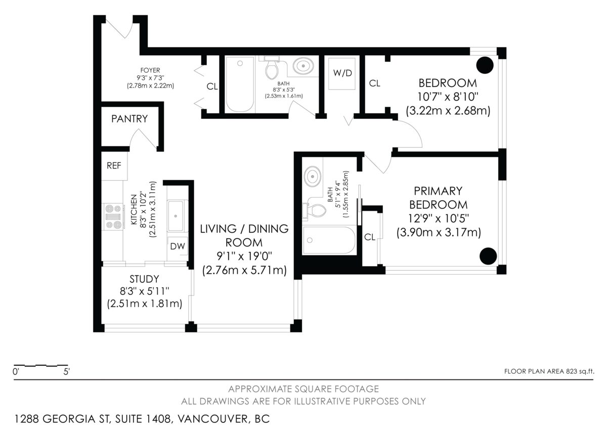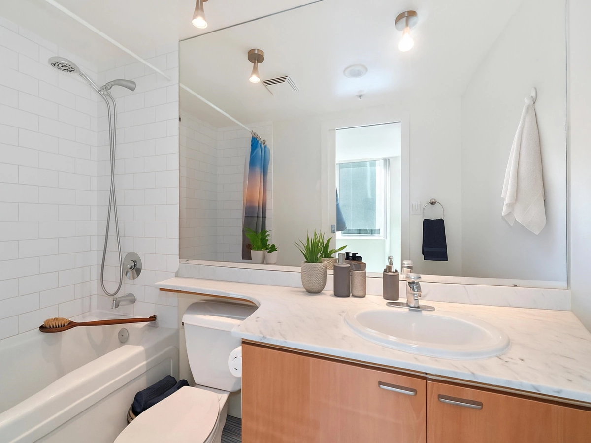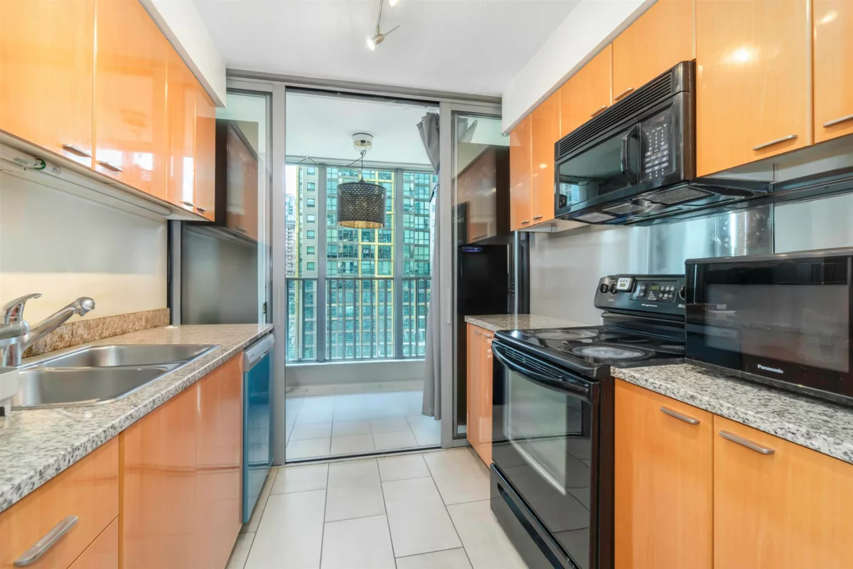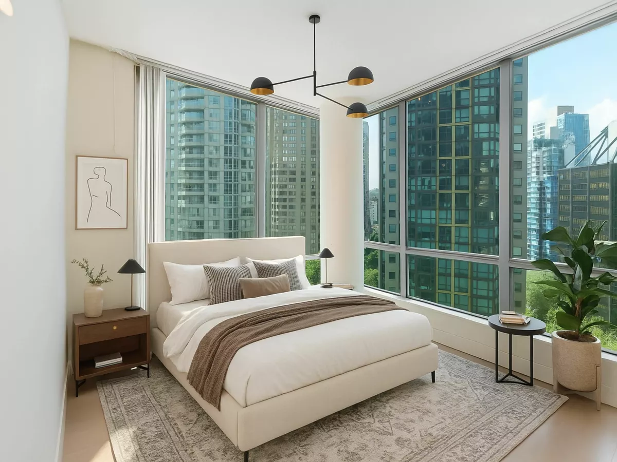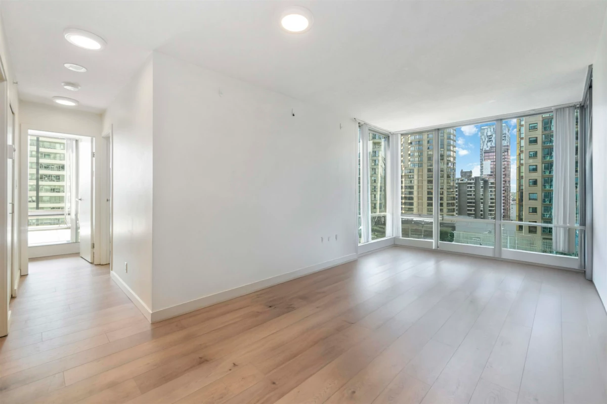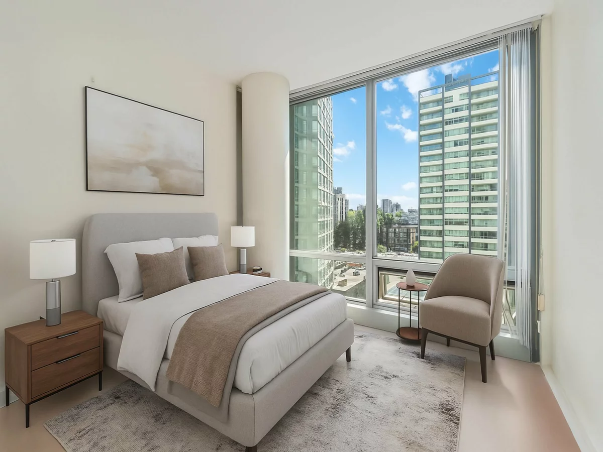 Welcome to The Residences on Georgia by renowned developer Westbank. This 2-bedroom, 2-bathroom plus den home offers 823 sq ft of well-designed living space with floor-to-ceiling windows showcasing stunning city views from every room. The layout separates the bedrooms from the main living area for added privacy, while the den is ideal for a home office or flex space. The kitchen features granite counters, stainless steel appliances, and ample storage. Enjoy 24-hour concierge, gym, secure parking, and storage locker. Rentals (30-day min) and pets allowed. Just steps to Robson Street, Stanley Park, Coal Harbour, and the Seawall. This is downtown living at its best! Photos have been digitally decluttered & virtually staged