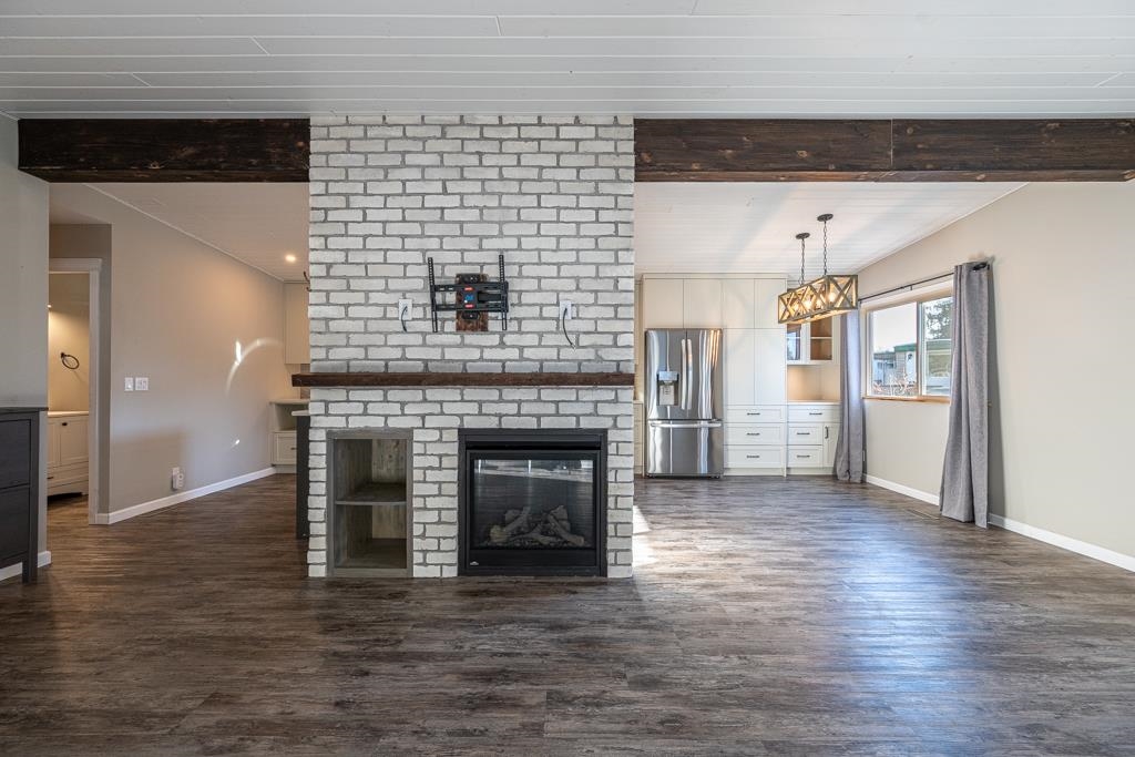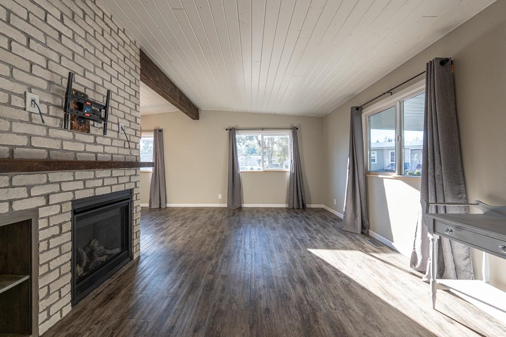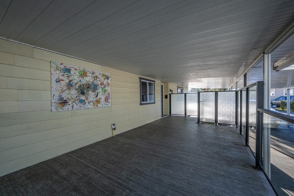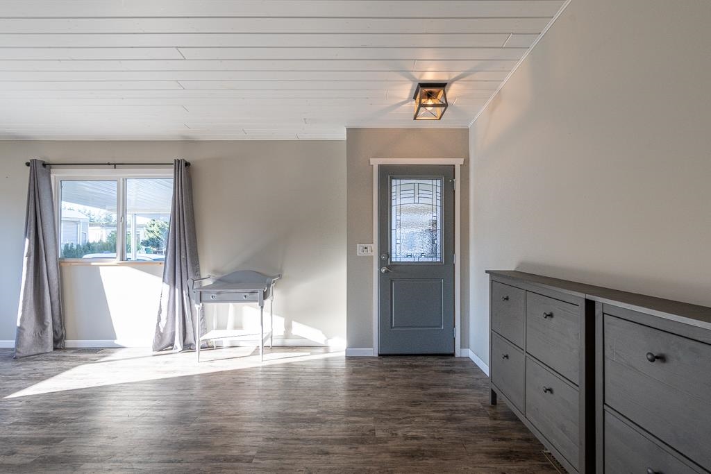 Langley Grove Estates/ This beautiful 2 bedroom. 2 bathroom home has been nicely updated throughout and is in a great location in the complex. Some of the features include large open newer white kitchen with qiartz countertops, s/s appliances, soft close pull out drawers, with great storage and cabinetry space. Newer A/C unit, vinyl plank flooring, vinyl windows, updated doors and plumbing, vaulted ceiling in living/kitchen area, and a natural gas fireplace. Outside has a private hedges and fenced backyard with two 10x10 sheds. Lots of room for parking. Hurry on this one!