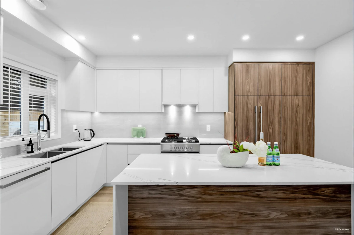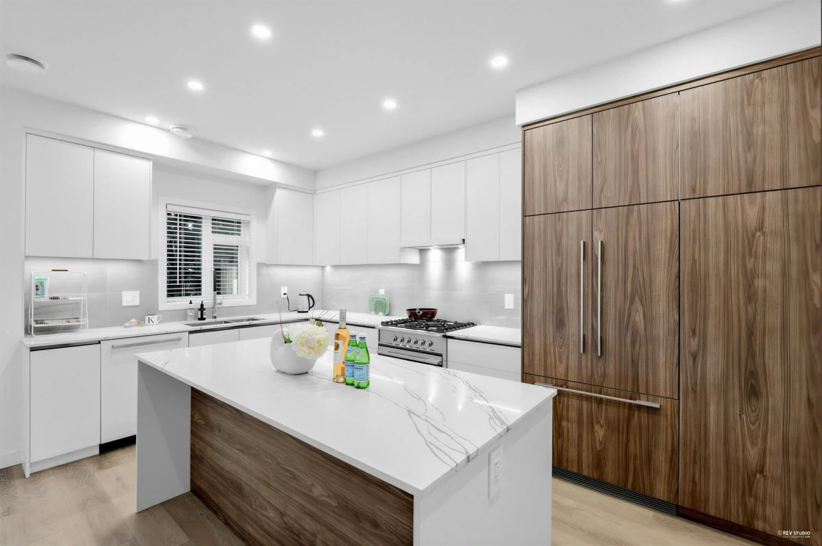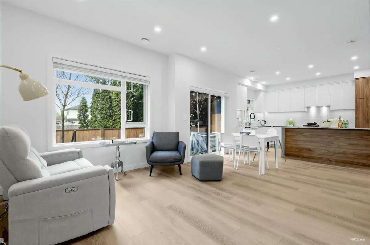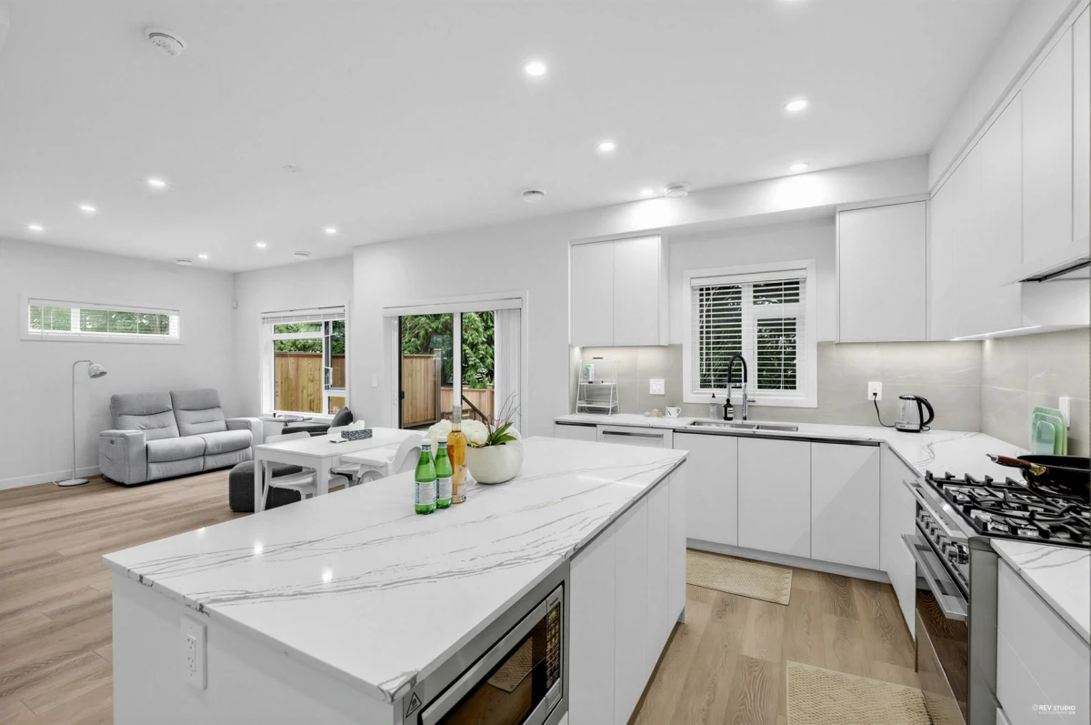 This 2 floors spacious & stunning townhome features 4 bedrooms and 4 bathrooms with Double side-by-side garage. Enjoy a modern open-concept layout with 11' ceilings, abundant natural light, European-inspired kitchen, equipped with Fisher & Paykel integrated refrigerator & German-designed Deson cabinets. Gas stove, and ample storage. Smart home features and a Smart Steam Closet, plus a heating and cooling system for year-round comfort. Close to West Dyke Trail, Golf Course, Multiple schools, parks and playground.