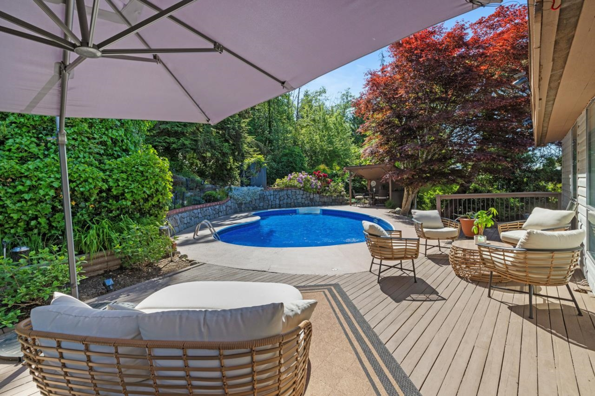 Ocean views, Swimming Pool, and Income Generating Suite! Located in the desirable Barber Street neighbourhood, this architecturally designed and constructed West Coast Contemporary home is perfect for family life and entertaining. Enjoy south-west views of the Burrard Inlet from your living room, dining, and kitchen, or retreat to the tranquil swimming pool and garden backing onto the green belt. The dual-fuel fireplace allows you to use wood or gas to fuel the fire. The extra-large 2 car garage will fit 2 large cars easily, along with all of your toys. The one-bedroom suite with a separate entrance provides numerous options. Many updates over the year, including new siding, roof, front windows, new pool liner and lighting, fences, pump house, and a full bathroom renovation. Just move in