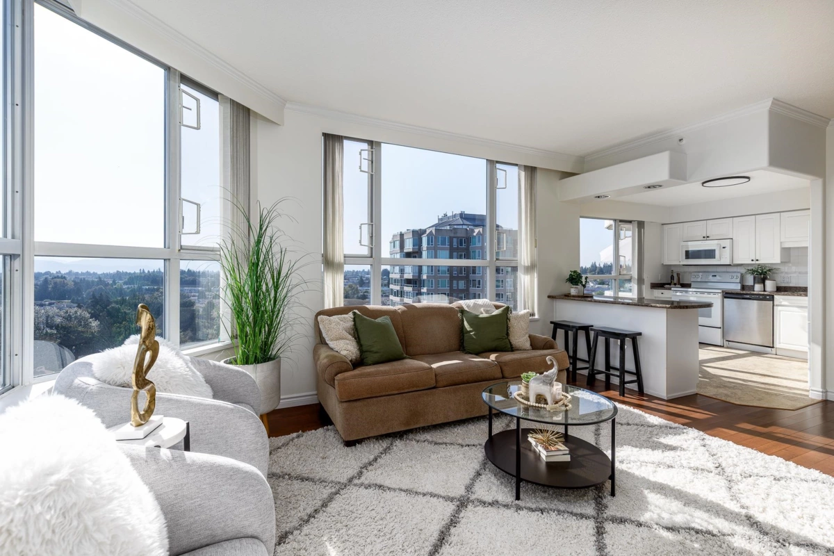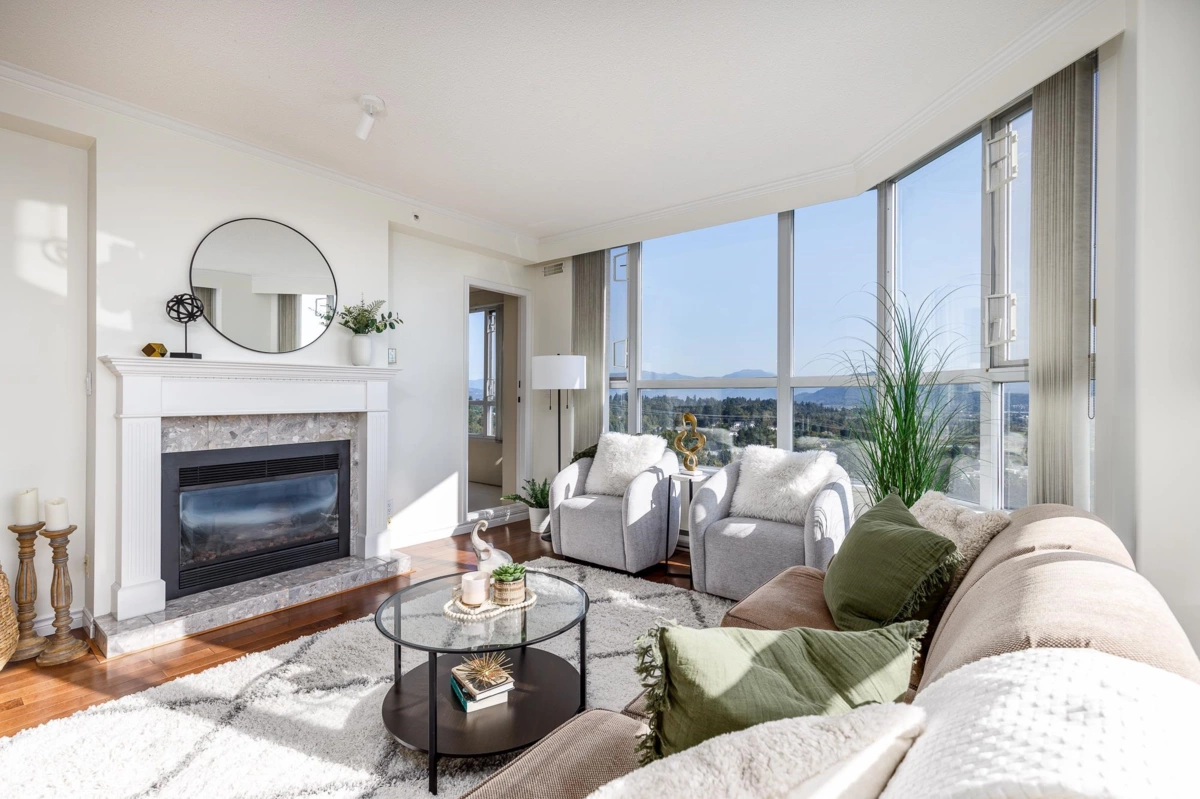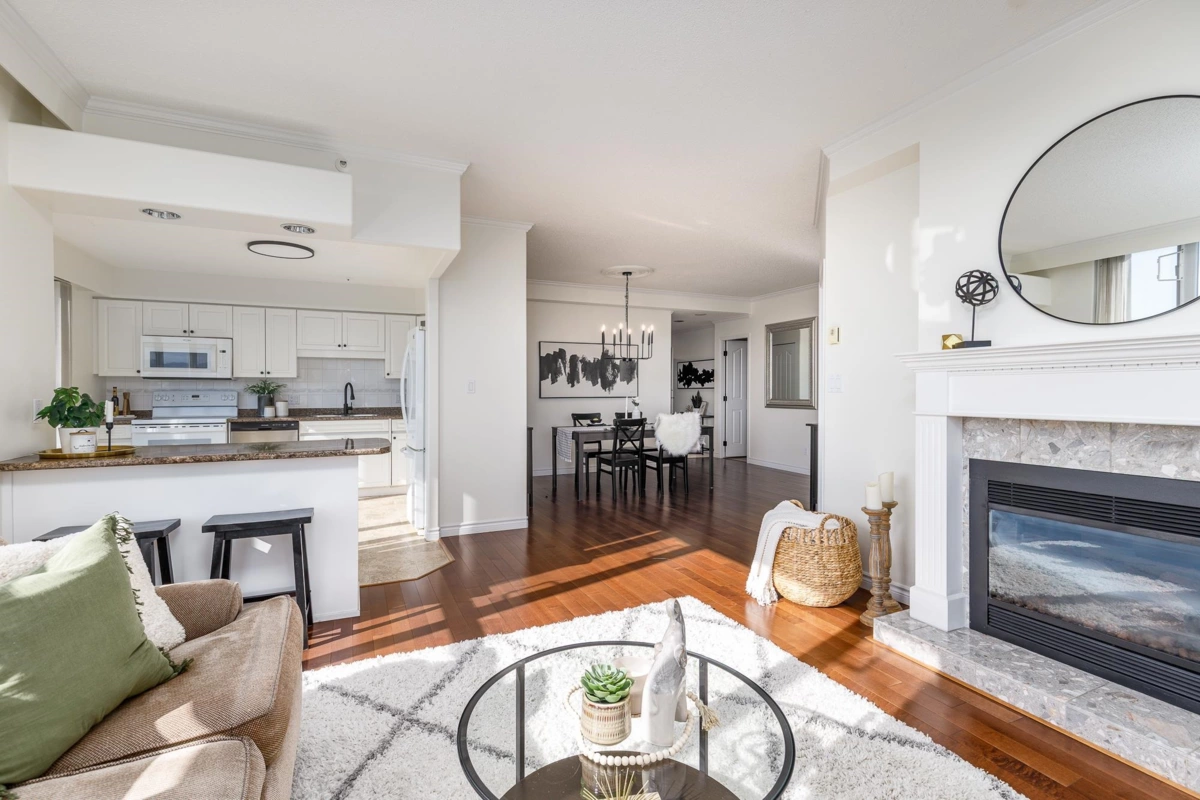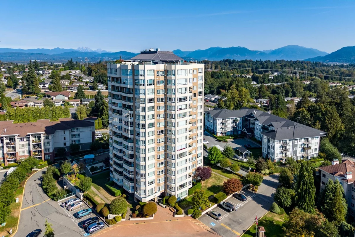Experience luxury resort-style living at Regency Park Towers! This bright, airy home boasts 9' ceilings, huge primary bedroom with his & hers closets & ensuite. Relax by the cozy gas fireplace (unique to some upper floor units) with massive windows framing stunning views of Mt. Baker, the Fraser Valley & Coastal Mtns. The kitchen features expansive windows, abundant cabinets & breakfast bar. Enjoy sunrises w your morning coffee on the enclosed balcony. Updates include new carpets, paint, hardware & lighting. Well-run strata with large contingency reserve, 2 side-by-side parking, possible RV parking, indoor pool, hot tub/sauna, gym & guest suites. No age restrictions, 2 indoor cats allowed. Conveniently located- steps to Superstore, Mill Lake, Seven Oaks, restaurants, churches & transit. Mo