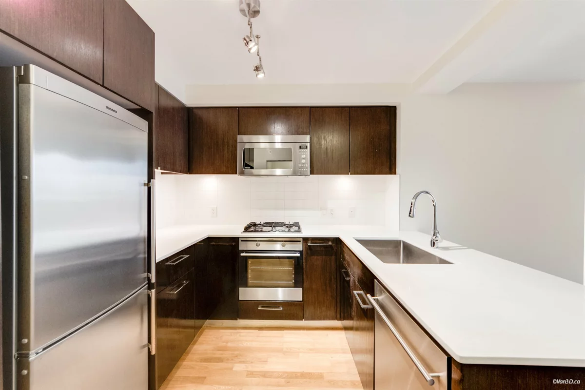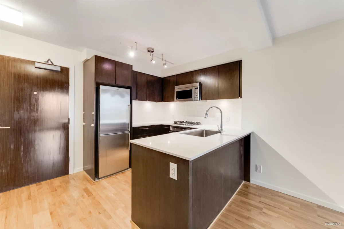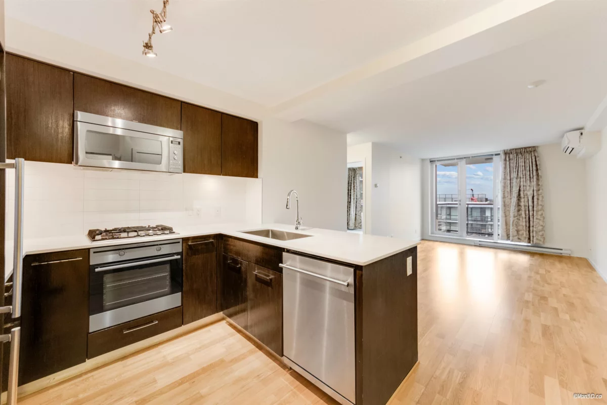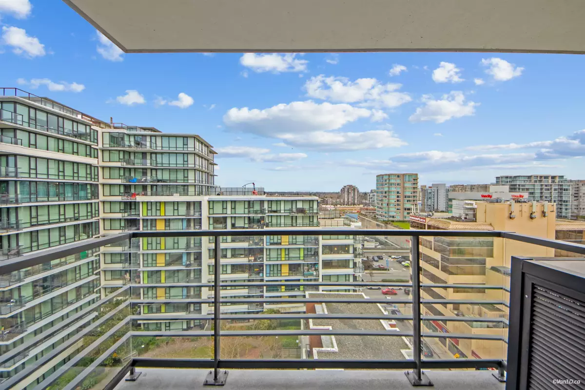 Located on the 15th floor of a concrete high-rise in Richmond City Centre, this east-facing 1 bedroom plus den, 1 bathroom home offers 586 sq ft of well-designed living space with a peaceful garden view. The unit features air conditioning, fresh paint throughout, and a functional open-concept kitchen with quartz countertops, gas cooktop, and stainless steel appliances. Comes with 1 secured parking stall and 1 private residential storage locker room (86 sqft). Enjoy excellent building amenities and an unbeatable location within walking distance to SkyTrain, shopping malls, supermarkets, restaurants, and Kwantlen Polytechnic University. Measurements are approximate, Buyer and Buyer's agent to verify.