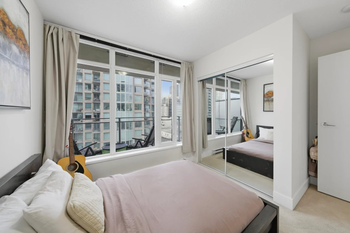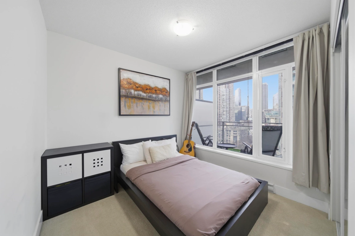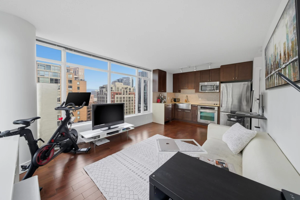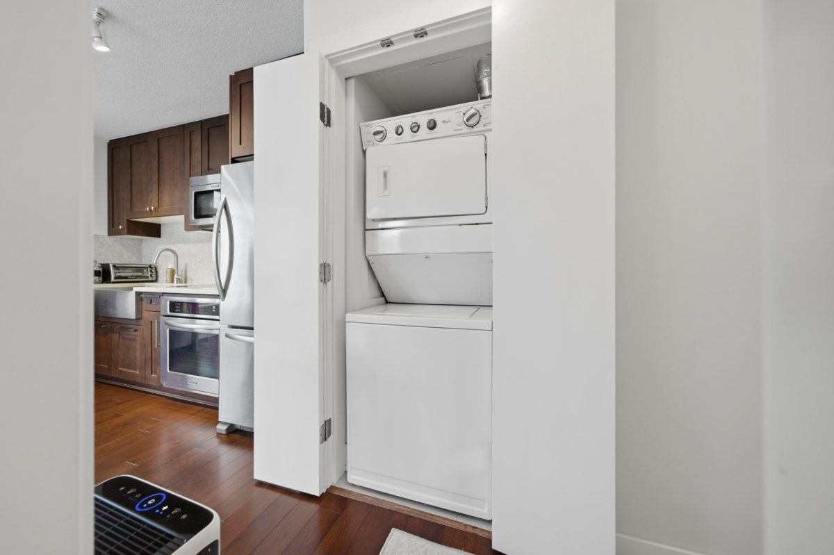 This impeccably maintained corner 1-bedroom residence features a bright, open-concept layout enhanced by expansive windows that flood the home with natural light. The designer kitchen offers stainless steel appliances and elegant stone countertops, while the bathroom is appointed with heated flooring for added comfort. Enjoy a private balcony showcasing city skyline. Ideally suited for professionals and students alike, the building is exceptionally well managed and offers 24-hour concierge, a fully equipped fitness center, residents’ lounge and meeting room, a landscaped common patio, and a dedicated dog park. Located just steps from from the very best of downtown living—shopping parks, acclaimed restaurants and transit at your doorstep! 1 Parking & 1 Storage included
