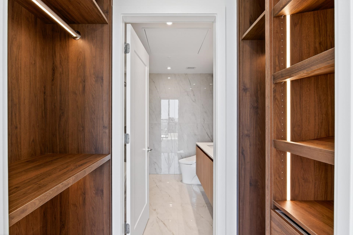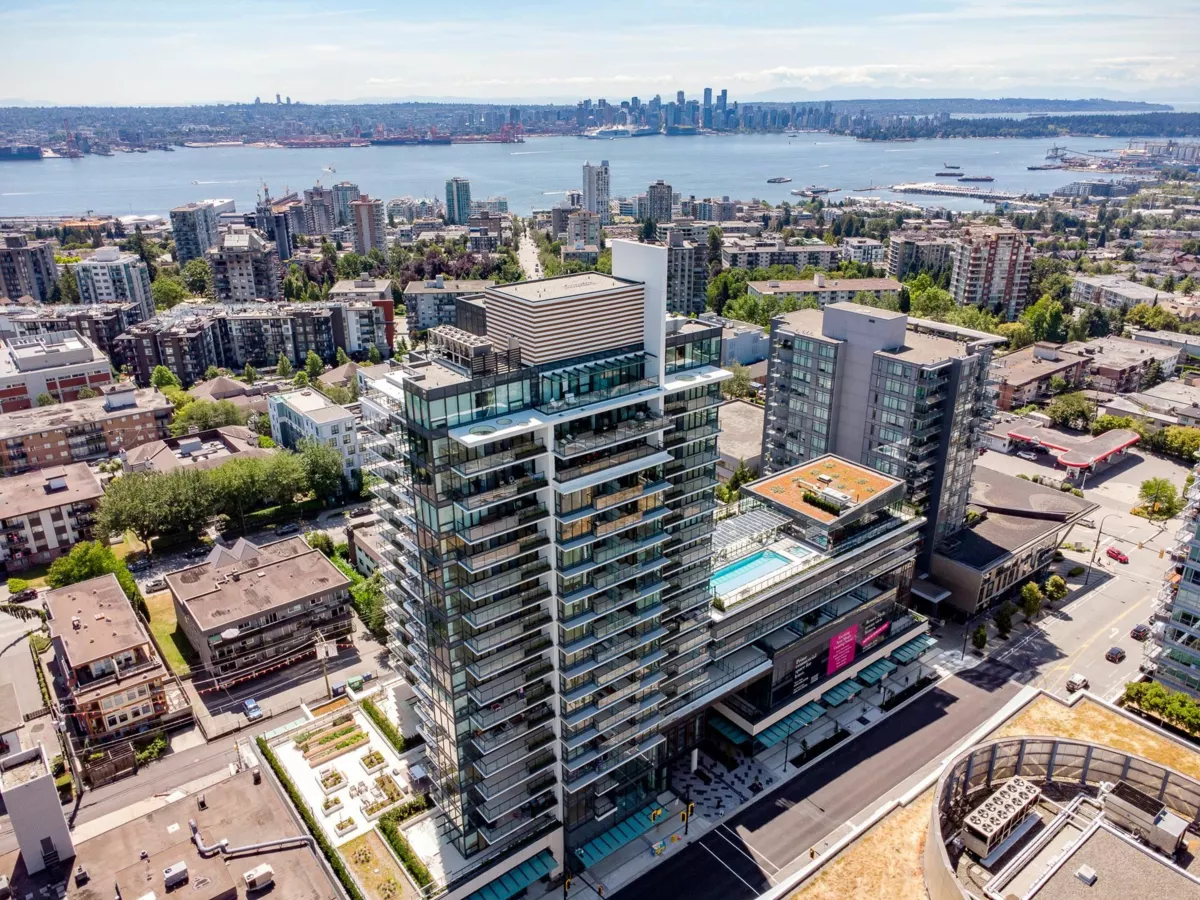1506 captures the North Shore views: the city skyline, ocean, Lions Gate Bridge, mountains & serene pool view below. This modern 2-bed, 2-bath corner residence offers over 1,000 sqft of refined living with south, west, and north exposures, showcasing breathtaking scenery from every angle plus two spacious balconies. This unit features floor-to-ceiling windows, a chef-inspired kitchen with premium integrated appliances, a gas cooktop, an oversized waterfall quartz island, LED lit cabinets. Luxury upgrades include motorized blinds, high-end custom closet millwork in the ensuite, a built-in wine fridge, pot lights in the bedrooms, and an elevated palette of premium finishes throughout. Parking and bigger storage. Pics, Floorplan, Pics & video are for 1406! Measurement approximate and to be v