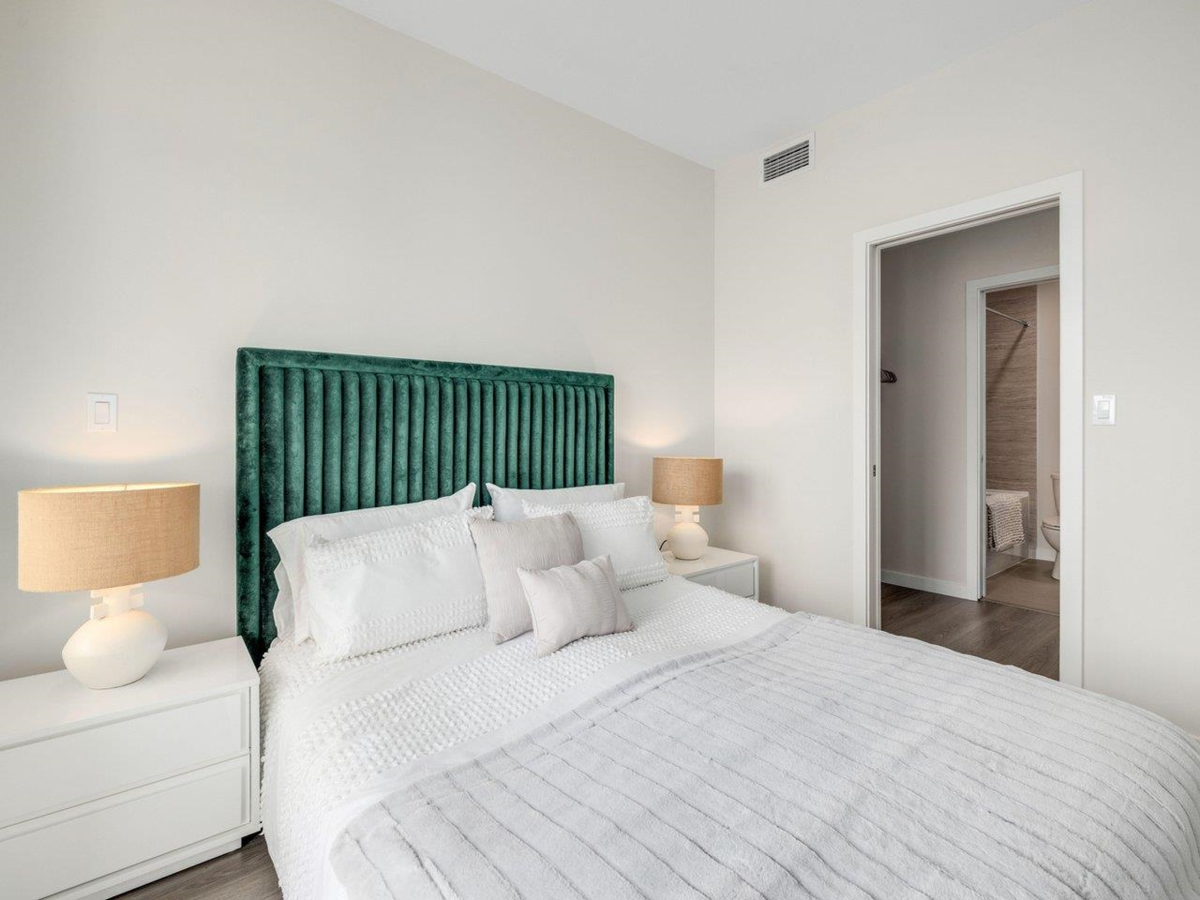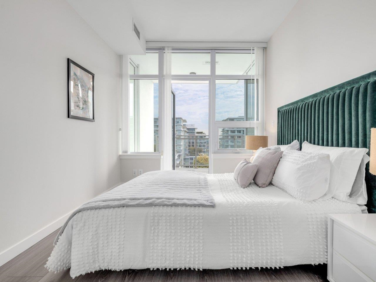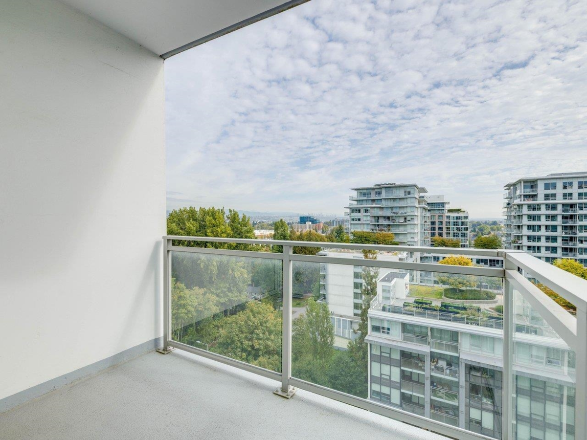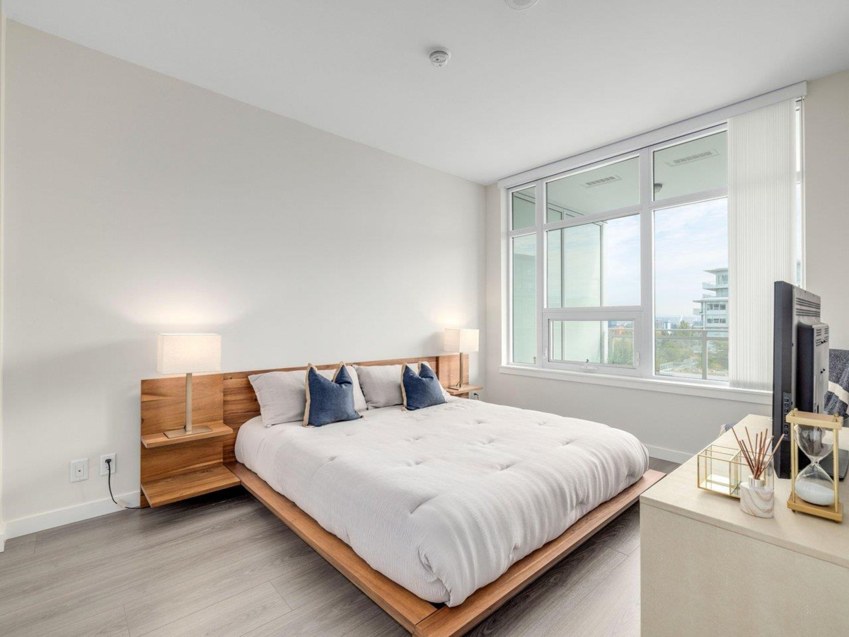 High level East-facing 932 sq ft 2 bed + den at Torino North with open mountain and garden views. Efficient floorplan with no wasted space, double ensuited bedrooms on opposite sides. High ceilings, full-size appliances, wide-plank laminate flooring, and heating/cooling. Convenient location with services, groceries, restaurant, and Capstan Canada Line Station just steps away. New and ready to move in.