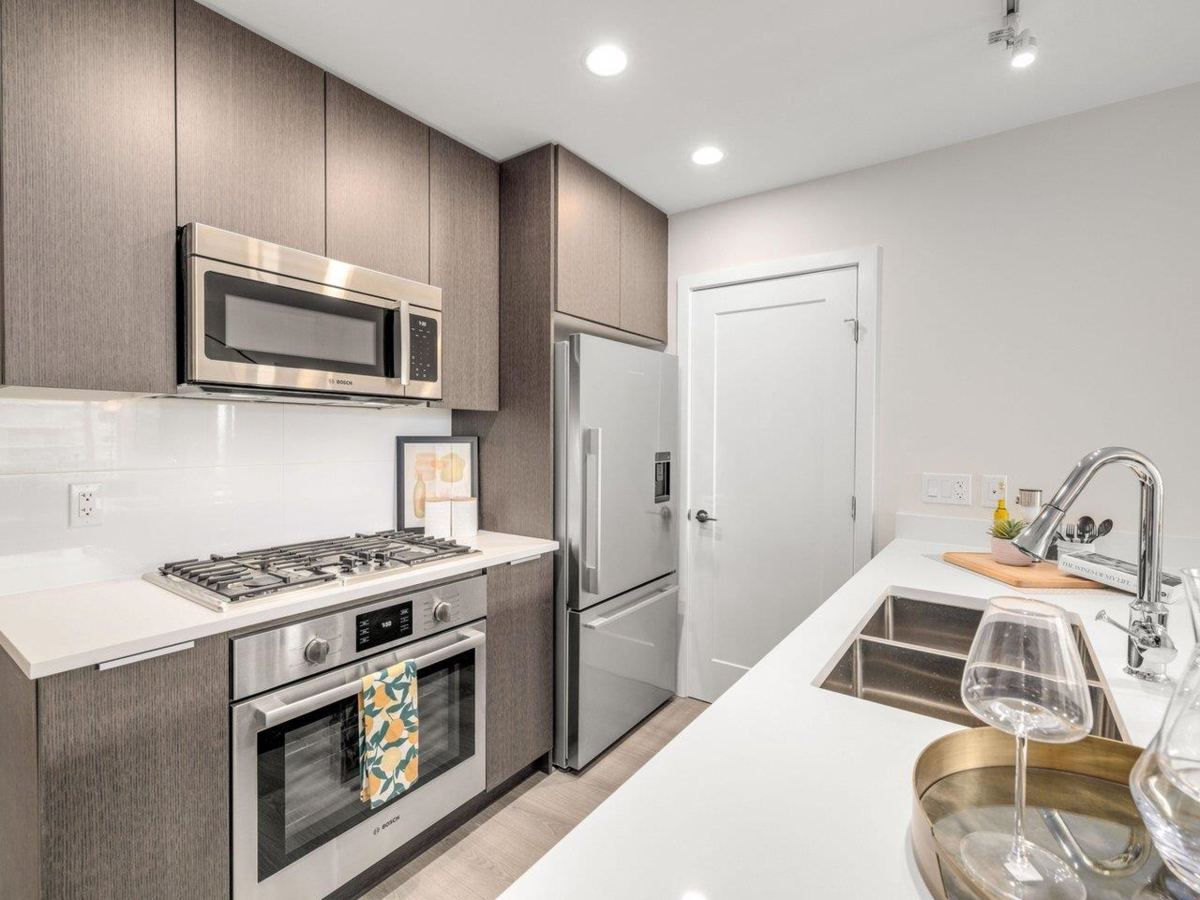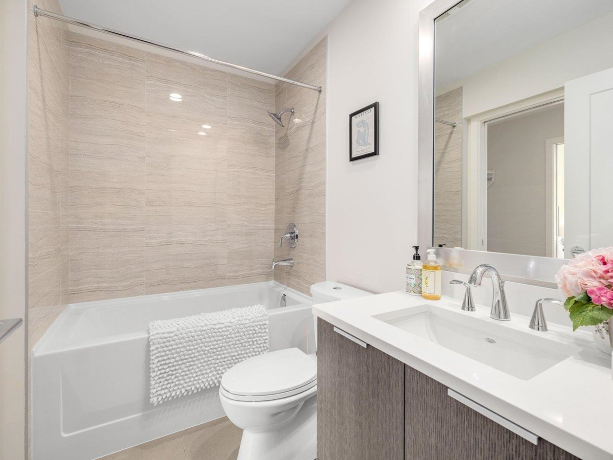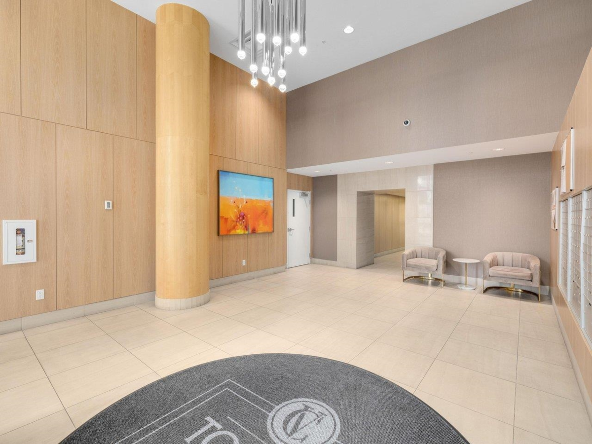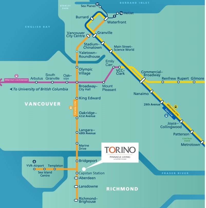 High level East-facing 932 sq ft 2 bed + den at Torino North with open mountain and garden views. Efficient floorplan with no wasted space, double ensuited bedrooms on opposite sides. High ceilings, full-size appliances, wide-plank laminate flooring, and heating/cooling. Convenient location with services, groceries, restaurant, and Capstan Canada Line Station just steps away. New and ready to move in.