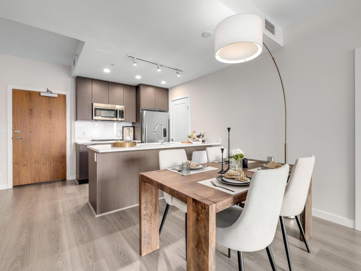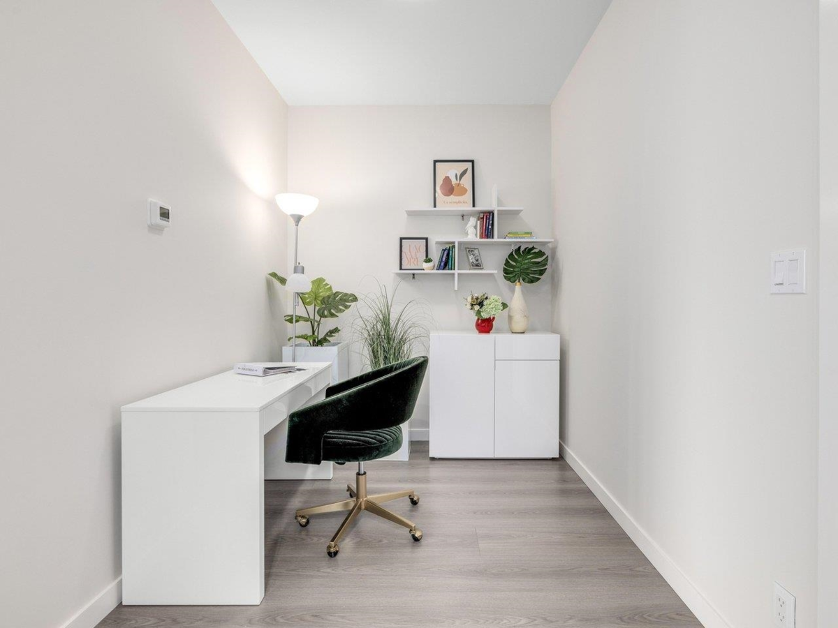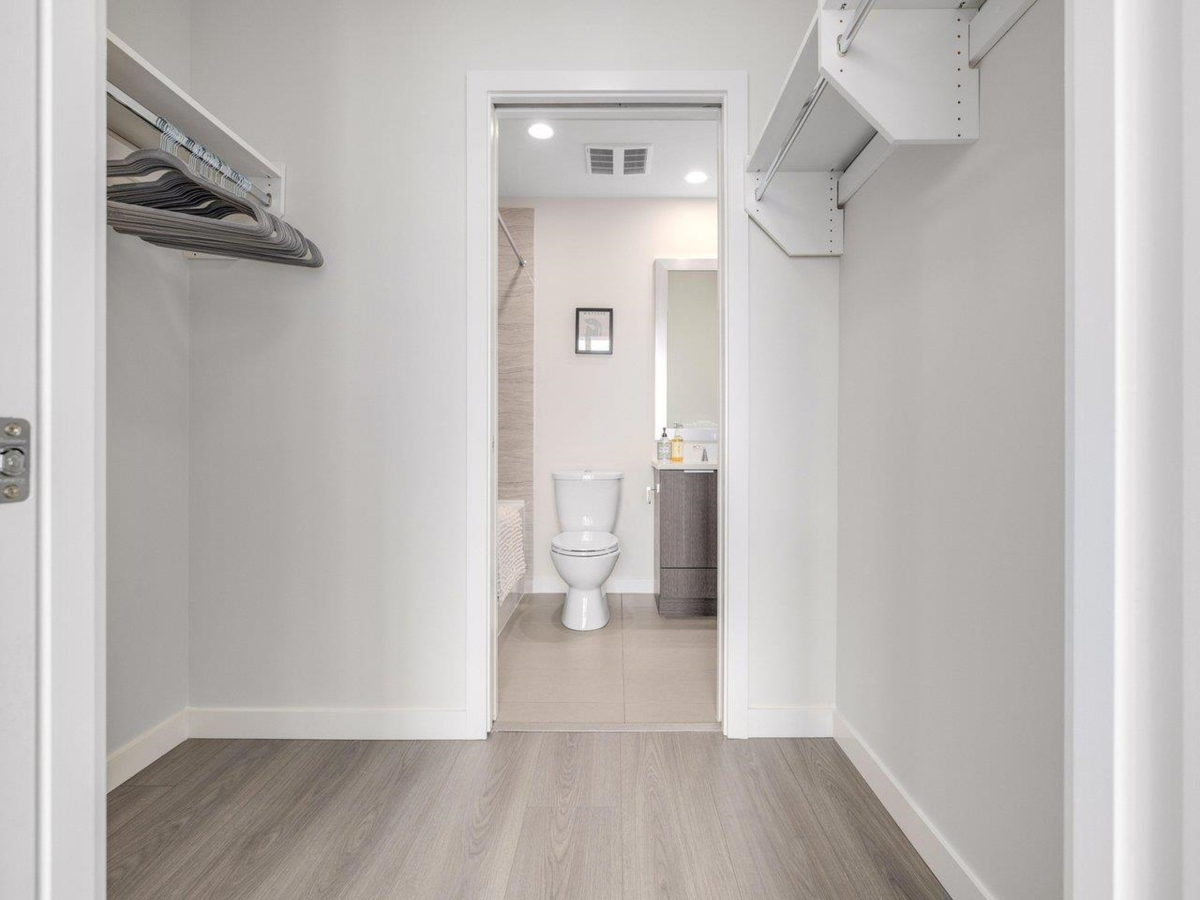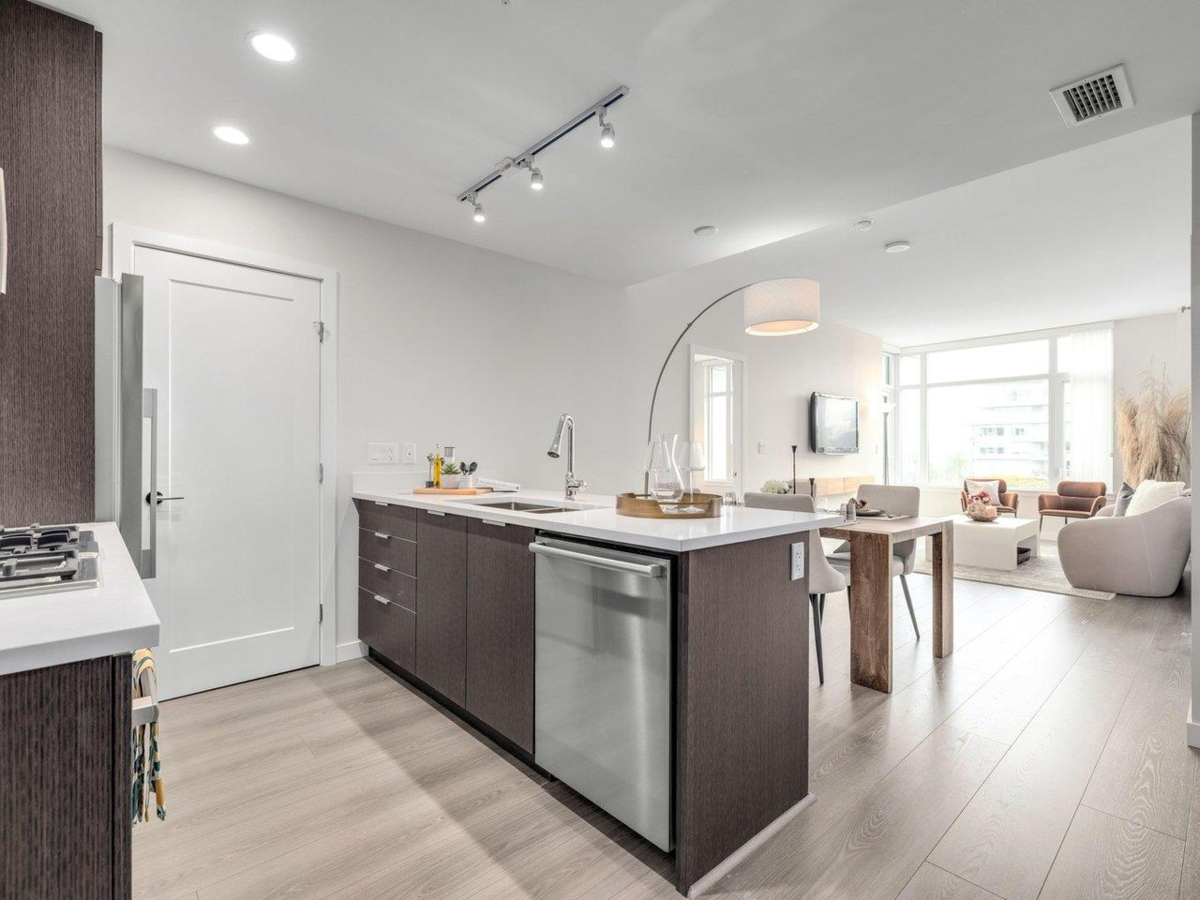 High level East-facing 932 sq ft 2 bed + den at Torino North with open mountain and garden views. Efficient floorplan with no wasted space, double ensuited bedrooms on opposite sides. High ceilings, full-size appliances, wide-plank laminate flooring, and heating/cooling. Convenient location with services, groceries, restaurant, and Capstan Canada Line Station just steps away. New and ready to move in.