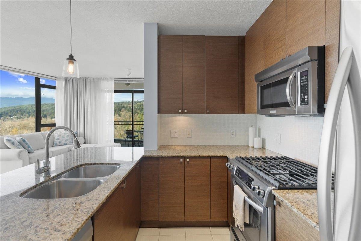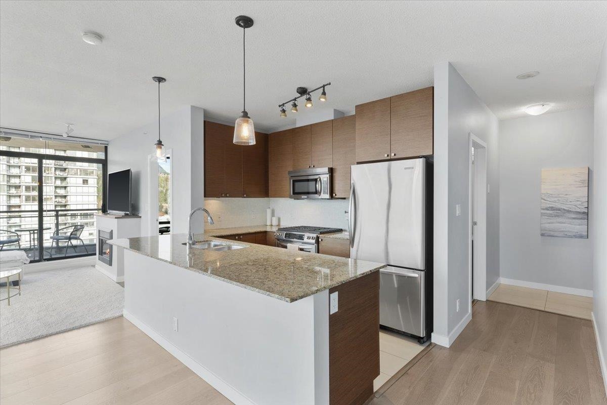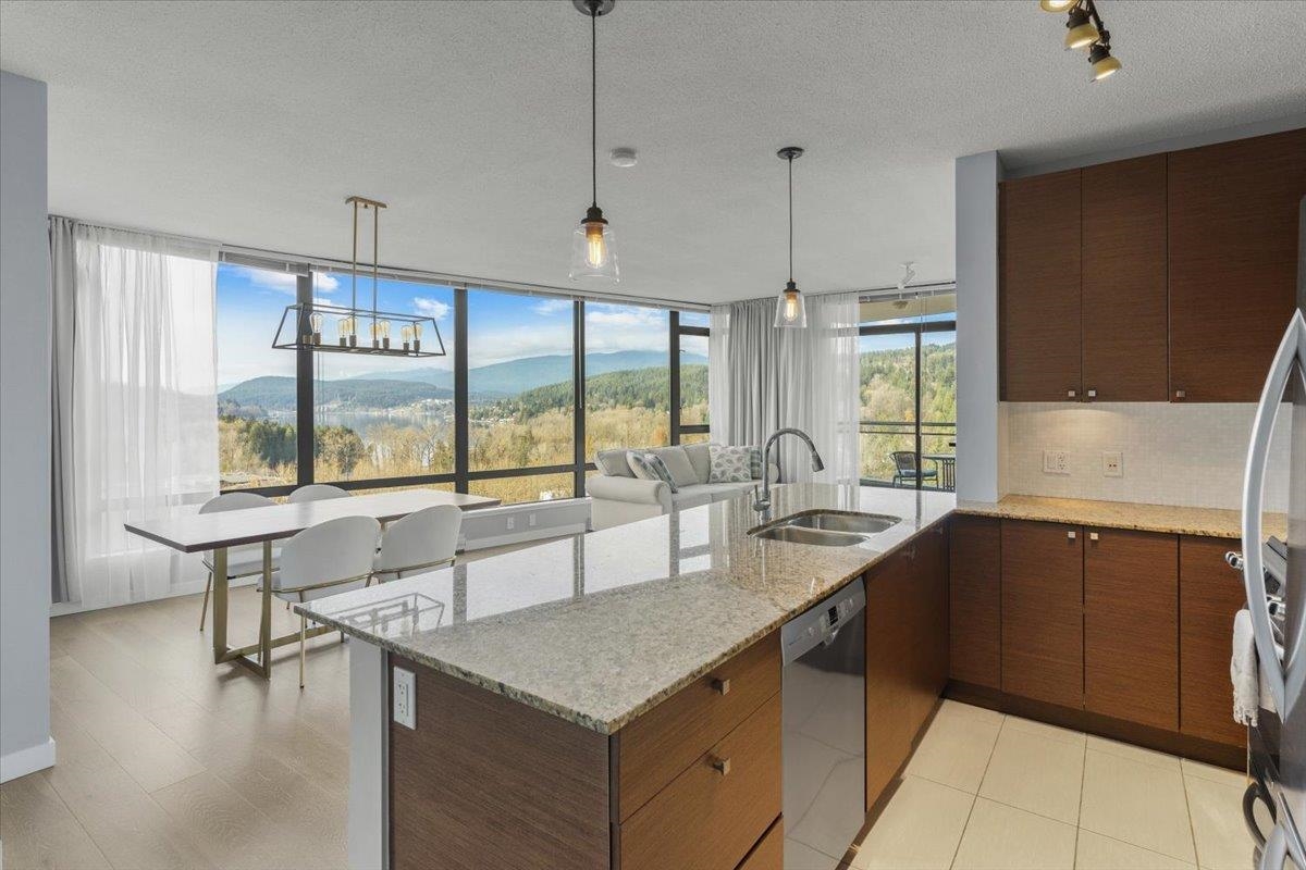 Discover stunning sunsets and panoramic water and mountain views from every room in this bright NW corner 2-bed,2-bath condo, featuring one of the most sought-after layouts in the building, located in vibrant Suter Brook Village. The stylish peninsula kitchen features quartz countertops, stainless steel appliances, and luxurious finishes. The primary suite offers sweeping views, walk-in closet, and a spa-like ensuite with a soaker tub and separate shower. Relax on the covered balcony or by the cozy fireplace. Amenities include a gym, squash court, indoor pool, hot tub, theatre room, party lounge, and guest suite. Steps from SkyTrain, shops, parks, and restaurants, with secure parking—your perfect lifestyle awaits! Open house *by appointment only* Saturday, January 25 from 1-3 pm