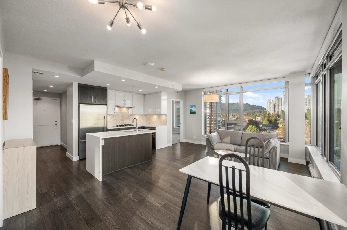 Exceptional NE facing 2 Bed, 2 Bath + Den corner suite in the heart of West Coquitlam, only steps from The City of Lougheed Shopping Centre and SkyTrain. This contemporary home offers 900 SF of expansive interiors, spacious living & dinning rooms filled with natural light, with amazing North Shore mountains and city views, separated bedrooms for added privacy, and a flexible den for your home office or in-suite storage. The stylish kitchen features European appliances, gas cooktop, and a large island with additional space for dining and entertaining. Amenities include fitness centre, party room, and sky lounge. Centrally located close to transit, shops, groceries, parks, and golf; short drive to SFU.