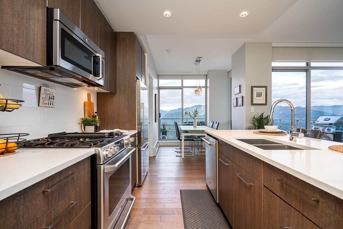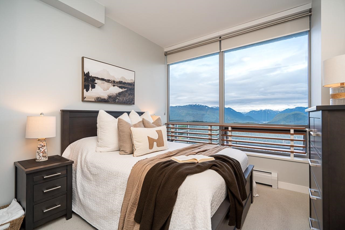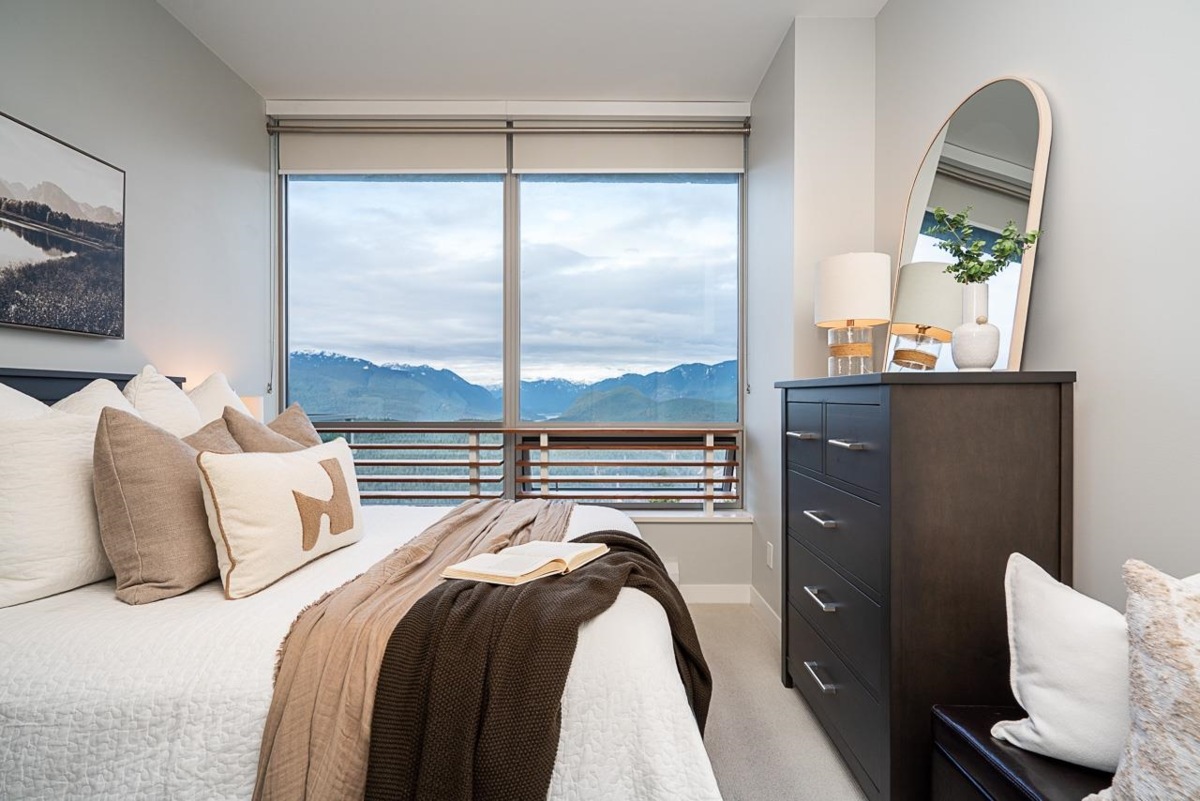 Executive style 2 bedroom plus den,2 bathroom home at Altitude, SFU, offering unobstructed 180 degree panoramic views of the Burrard Inlet, North Shore Mountains, and city skyline from every room. The open concept layout features floor to ceiling windows that flood the home with natural light and showcase stunning scenery from sunrise to sunset. Enjoy peaceful mornings or evening sunsets from your private balcony. Located steps to the SFU campus, schools, shops, cafes, and transit, this home blends luxury, convenience, and an exceptional mountain setting. Strata fees include heating and gas. Situated on UniverCity land within a long established, SFU encouraged master planned community, this leasehold ownership offers exceptional views and location at a more accessible price point.