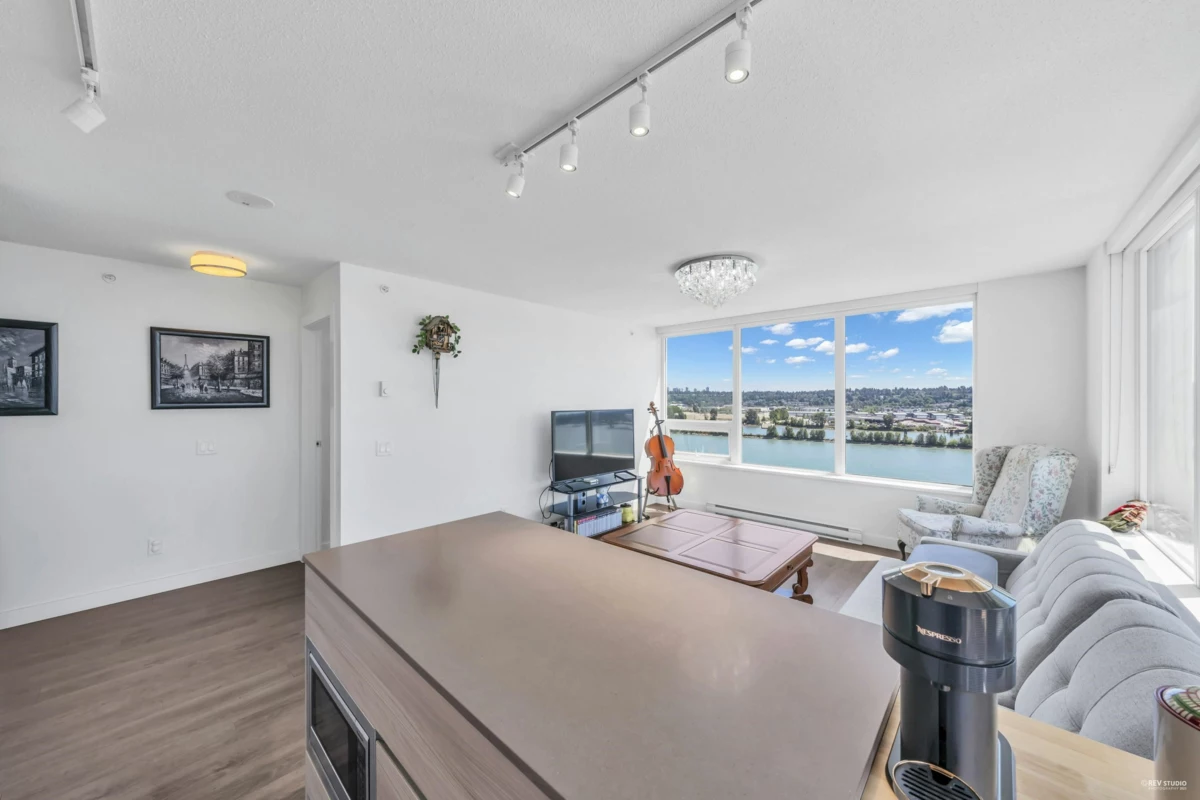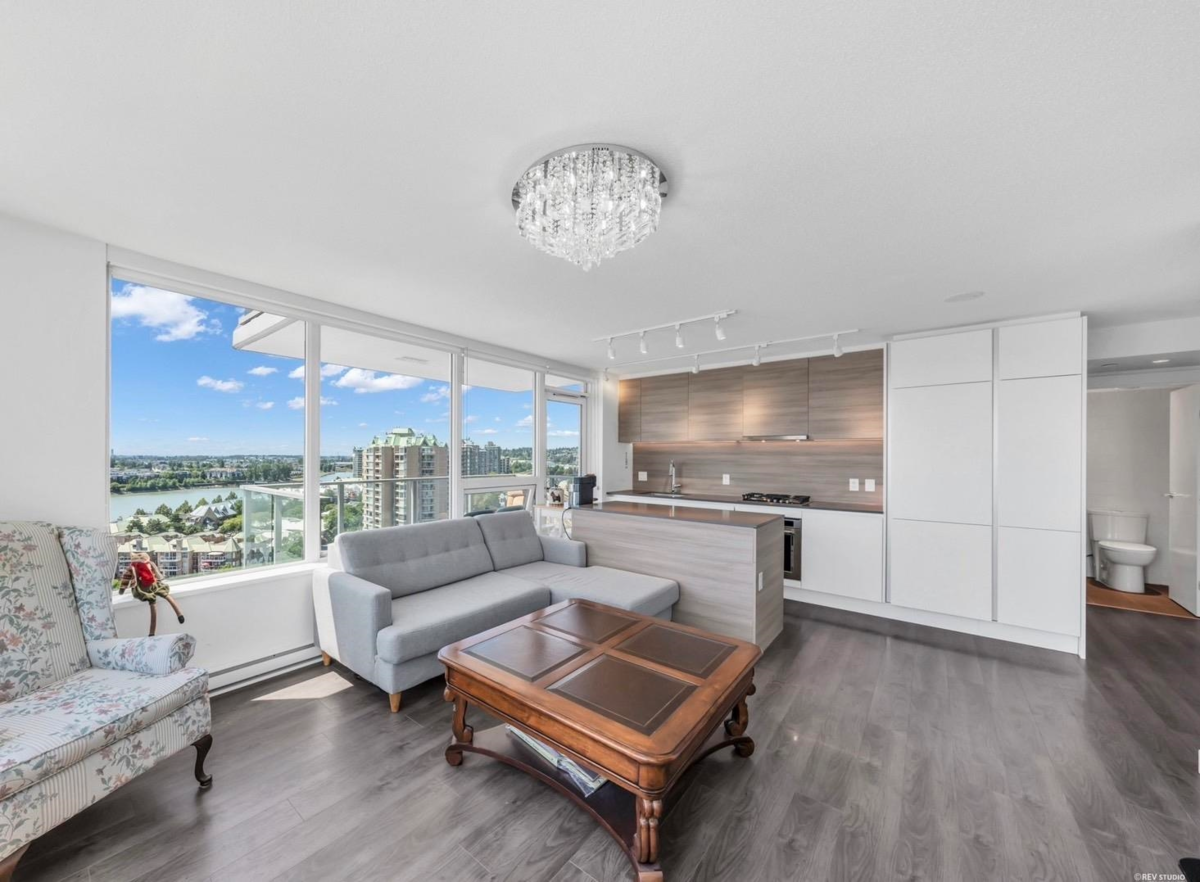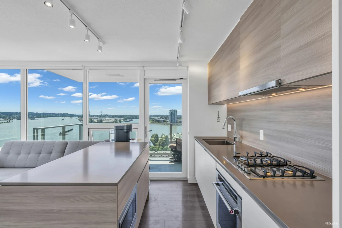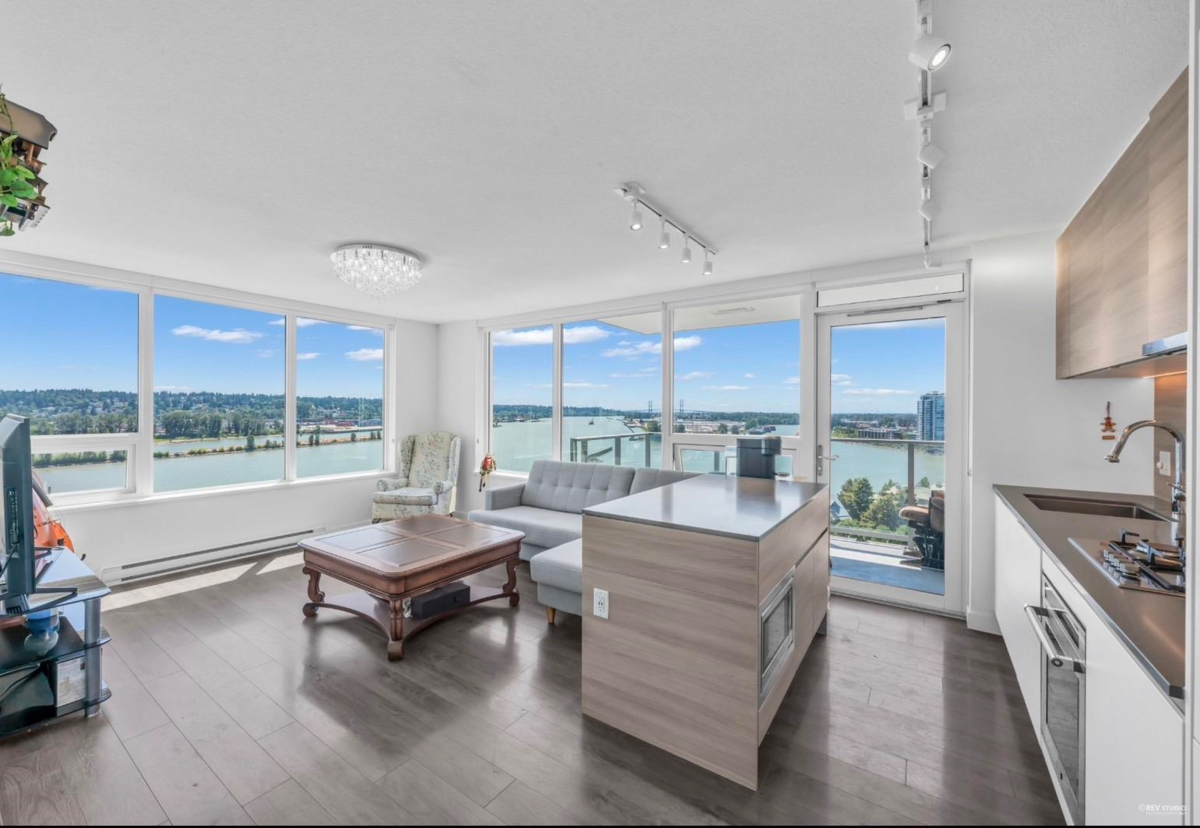 RIVERSKY 2 by BOSA Properties in the heart of Downtown New Westminster. This beautiful 889 SqFt, 2-bedroom and 2-bathroom corner unit on 15th floor. Features a spacious, open-concept living space with unobstructed water views. Kitchen includes gas cook-top, built-in fridge, oven, and pantry storage. Ideal southeast facing with generous patio. This building also has a full-time concierge, gym, yoga, and much more room. Easy access to Skytrain, restaurants, groceries, and cafes on the Quay. One storage locker & one parking stall.