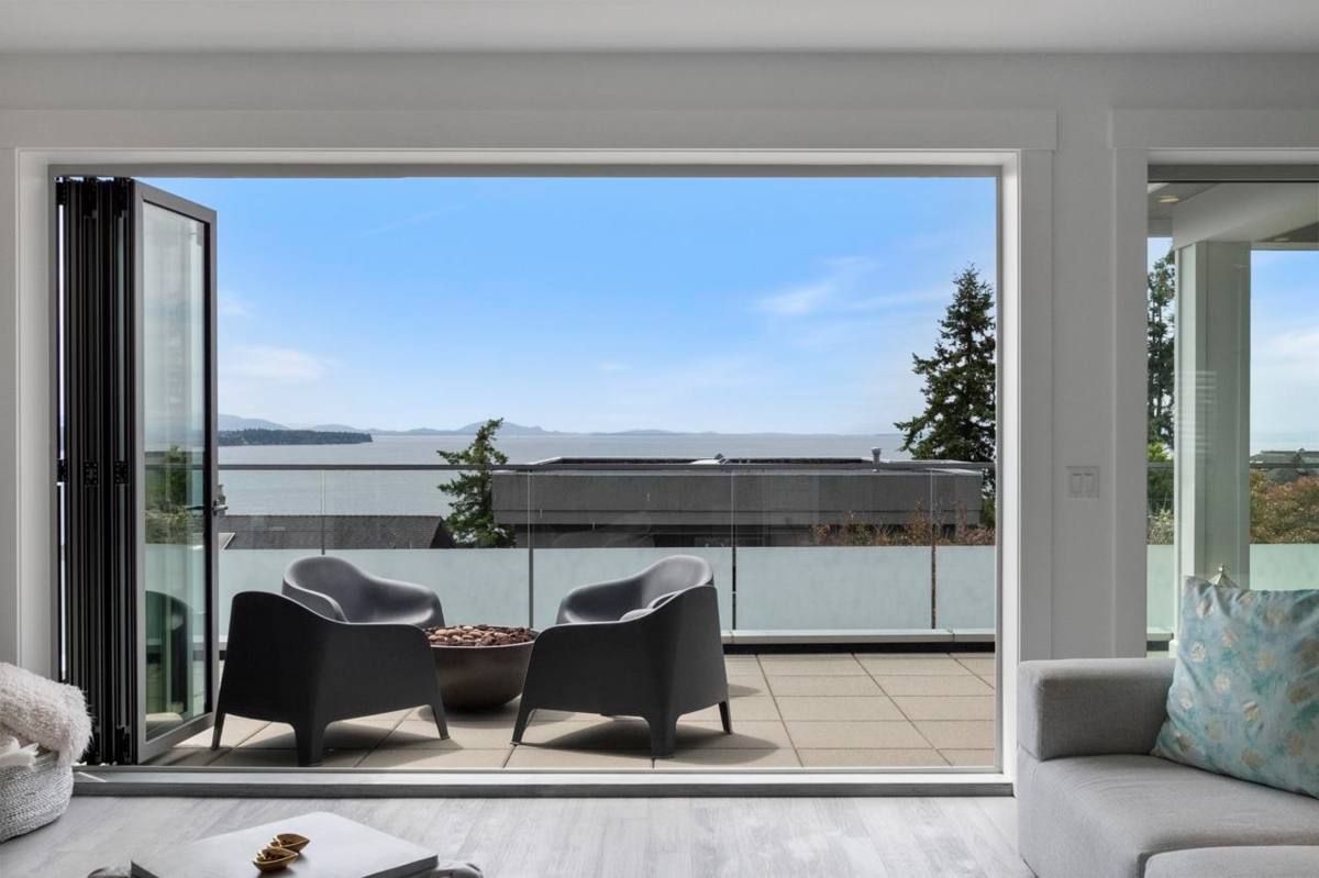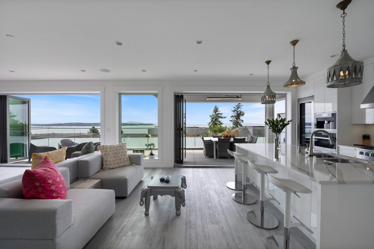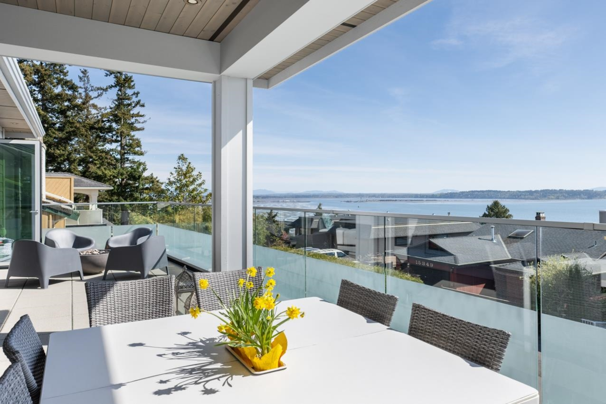 White Rock Living at its finest Fine Custom Built Ocean View Home Spans East along the shores of White Rock beach to west glorious Sunsets w/Gulf Islands. Above Prof. Meile Kitchen & wok kitchen Nat gas Fpl. Living Rm, dining & Office .Firepit& nat gas & water on balcony. Foyer level Three Bedrooms en-suited w/ walk in closets& Laundry rm. Primary suite w/Ocean View Balcony & custom walk-in closet.Comfortable radiant heated flrs on all levels. 4 Nano doors open to over 1000 SF of Balconies glass railed. Home has a Western Elevator services all floors from Dbl Garage up. Bright Legal Suite below main w/ laundry & designated parking for tenant from lane access. Quiet Peaceful Street, no Traffic. Dbl Garage and open parking for 8 cars. Schools White Rock Elementary & Semiahmoo Secondary.