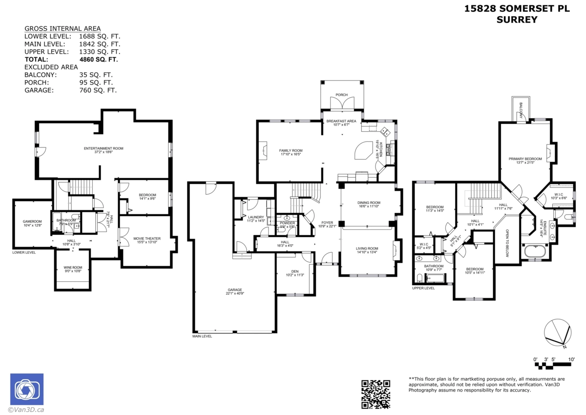 Welcome to this stunning Morgan Creek home, set on a 13,548 sqft lot with south-facing backyard and waterfall feature, ensuring complete privacy in a prime cul-de-sac location. This 4,860 sqft custom-built residence spans 3 fully finished levels. The main floor features soaring ceilings, a formal living and dining room, an office, a large laundry/mud room, and a chef's kitchen with stainless steel appliances and granite countertops overlooking the family room and backyard. Three bedrooms upstairs, with the master suite offering a spa-like ensuite and WICLO. The expansive basement is perfect for entertaining, with a rec room, games area, media room, gym, and wine cellar. Updated new paint, carpet, and hardwood flooring. Conveniently located near golf course, shopping & School.