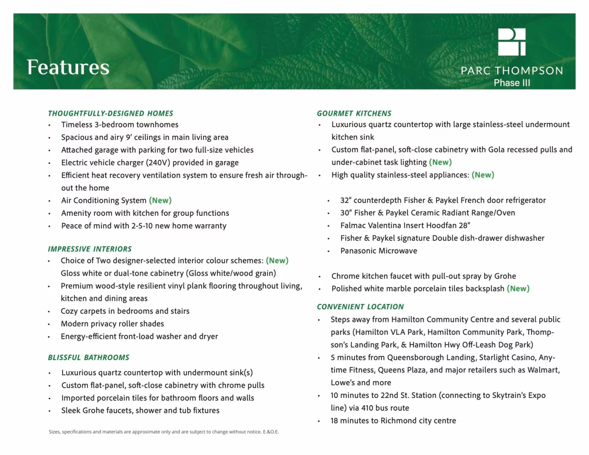 Welcome to Parc Thompson – Phase 3, the newest release in this established East Richmond townhouse community, featuring comprehensive upgrades throughout compared to earlier phases. This modern home offers an open-concept layout with a fully upgraded HVAC system providing whole-home air conditioning, enhanced appliances, upgraded flooring and wall finishes, and improved overall build quality and craftsmanship. The gourmet kitchen features stainless steel appliances, while expansive windows bring in abundant natural light. Designed for comfortable, contemporary living, the home delivers a noticeably higher level of finish and quality. Quiet yet convenient location just minutes to Queensborough Landing, parks, schools, and easy highway access.