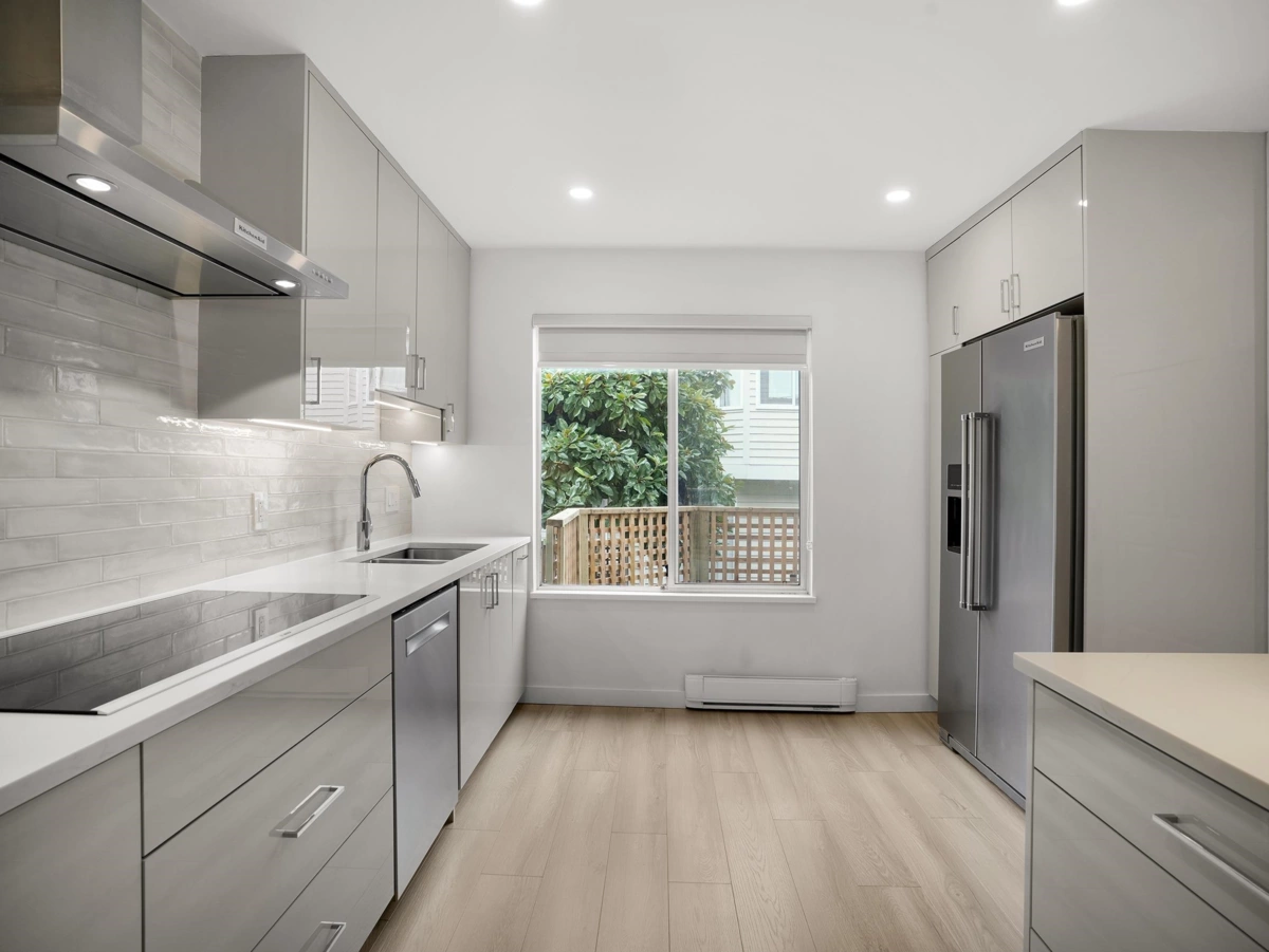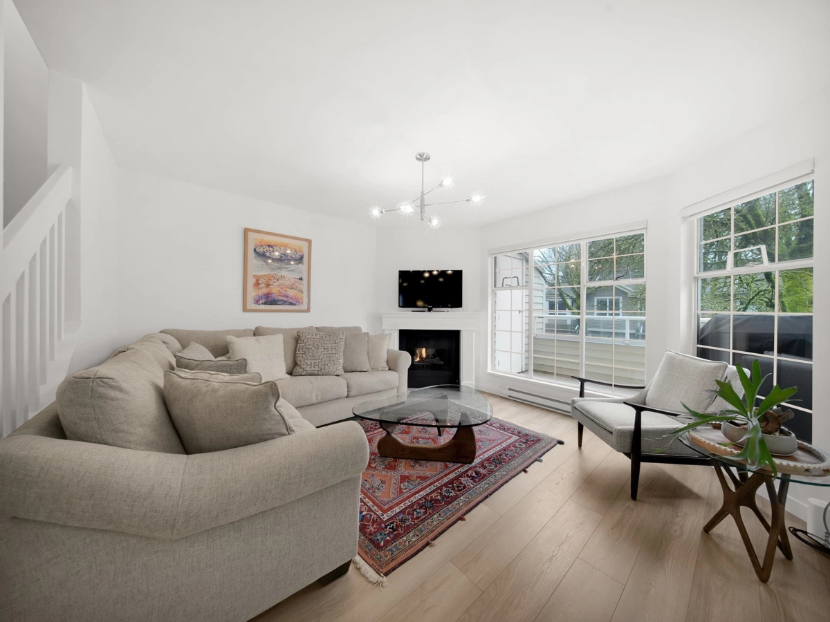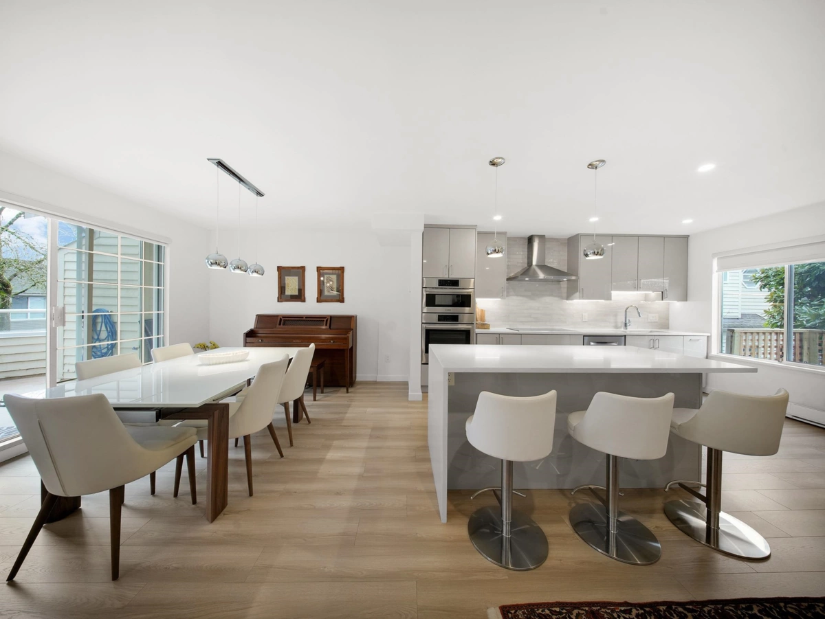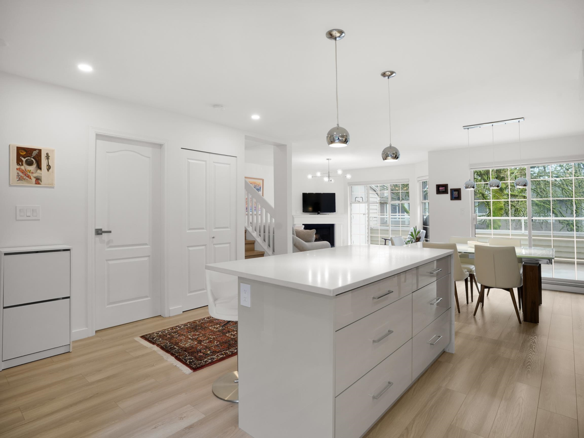 Beautifully RENOVATED SOUTH facing townhouse with 3 bedrooms plus DEN (office), 3 bathrooms, & a bright open concept layout. Spacious rooms & excellent flow create an airy, comfortable living space. Enjoy a south-facing deck with a beautiful treed outlook, providing privacy & a peaceful setting. Fully renovated in 2022 with close to $200K in upgrades, all completed with City & Strata permits; including removal of interior walls on the main floor to create the open concept layout, new kitchen with quality cabinets, quartz countertops & top appliances, updated bathrooms, new flooring & tile, new plumbing, new hot water tank & new blinds (some motorized). Inc 2 parkings & 2 storages. Exceptionally maintained & move-in ready. A rare fully renovated townhouse opportunity in North Vancouver.