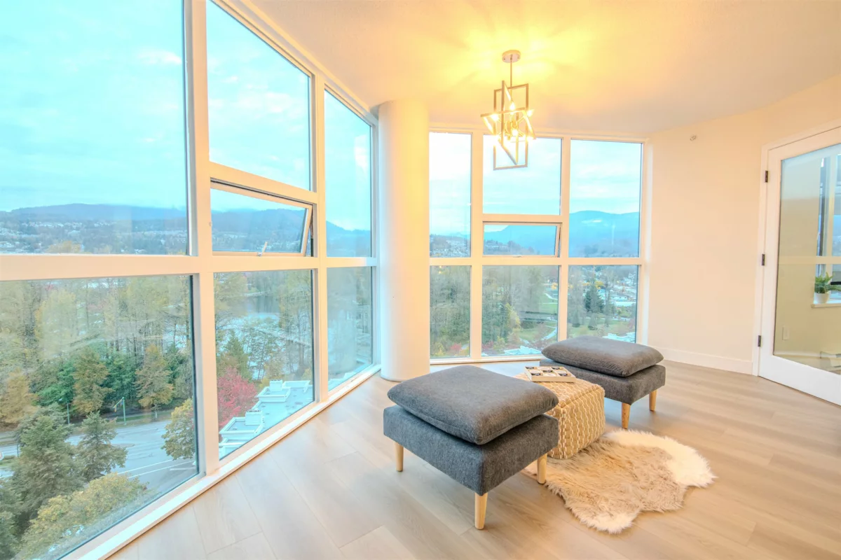 Ultra-spacious condo boasting nearly 1,200 SF of living space with tons of natural light and breathtaking mountain and Lafarge Lake views. Fully renovated for a modern & comfort style and features a brand-new white kitchen with lots of storage, new paint, new flooring throughout, and brand new appliances.Comes with 2 bedrooms, 2 full bathrooms, a large living area with a cozy gas fireplace, and a heated den / solarium accessible from the living room, master bedroom, and 2nd bedroom. Perfectly located for convenience, you’re just a short walk to the SkyTrain station, Coquitlam Centre Mall, Douglas College, Lafarge Lake, and all levels of schools. Plus, enjoy Canada Day fireworks from comfort of your own home! Comes with a secure parking and storage locker.