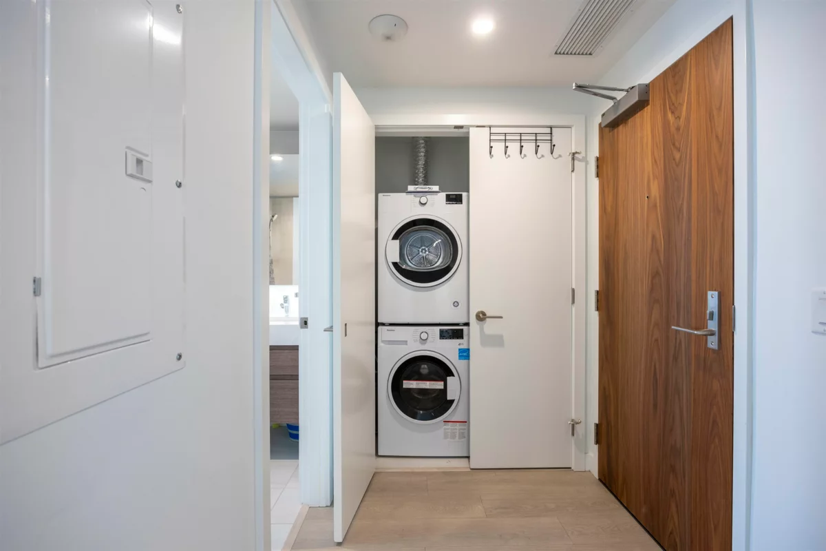 Bright and beautifully designed 1-bedroom home located in the vibrant heart of Metrotown. This northeast-facing residence offers a highly functional layout that maximizes every square foot, creating a comfortable and efficient living space that truly feels “small but mighty.” The modern kitchen is equipped with a full set of premium Miele appliances, complemented by sleek contemporary finishes throughout. This unit includes 1 secured parking stall and 1 storage locker. Enjoy unbeatable walkability to SkyTrain, Metropolis at Metrotown, Crystal Mall, restaurants, parks, and everyday conveniences. Situated in one of Burnaby’s highest-demand rental markets, this home offers excellent rental income potential and long-term value appreciation—an ideal opportunity for both end users.