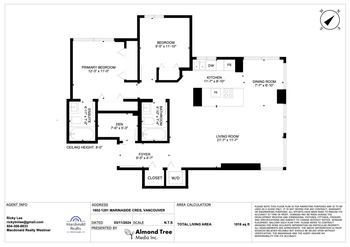 Great 2 Bedrooms with Den & 2 BATHS corner unit at The Peninsula. Breathtaking False Creek Marina & City Views. Renovations done in 2019. Spacious home located right on the seawall, prime and convenient location, one block away from city's best entertainment & restaurants, and only steps away from Urban Fare, Canada Line, Roundhouse Community Centre. Quick possession possible. Brand new Fridge and Dishwasher. Move in condition.