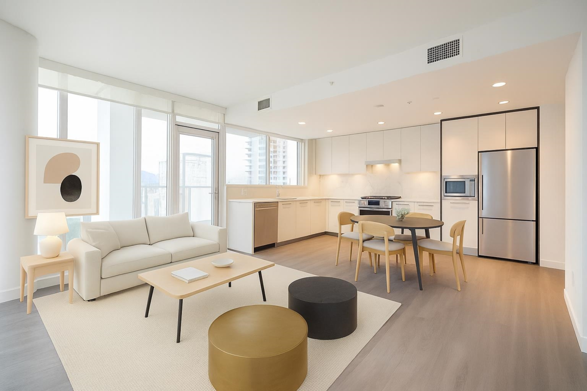 Step into the best floor plan at 567 Clarke+Como by Marcon, located by Burquitlam Skytrain/Lougheed Town Centre. This bright 2-bedroom, 2-bathroom corner suite boasts nearly 900 square feet of living space with stunning Northwest views. The open-concept design features floor to ceiling windows. The kitchen is a chef’s dream with Bosch appliances, a Fisher & Paykel fridge, quartz counters, and custom cabinetry. Relax in the elegant master suite with a walk-in closet, or unwind in the luxurious bathroom with a soaker tub. Enjoy air conditioning, laminate flooring, and two balconies to take in the breathtaking scenery. Includes 1 parking and 1 storage locker. Building amenities include a Sky-Lounge, fitness center, basketball court, yoga....1 Parking, 1 storage.