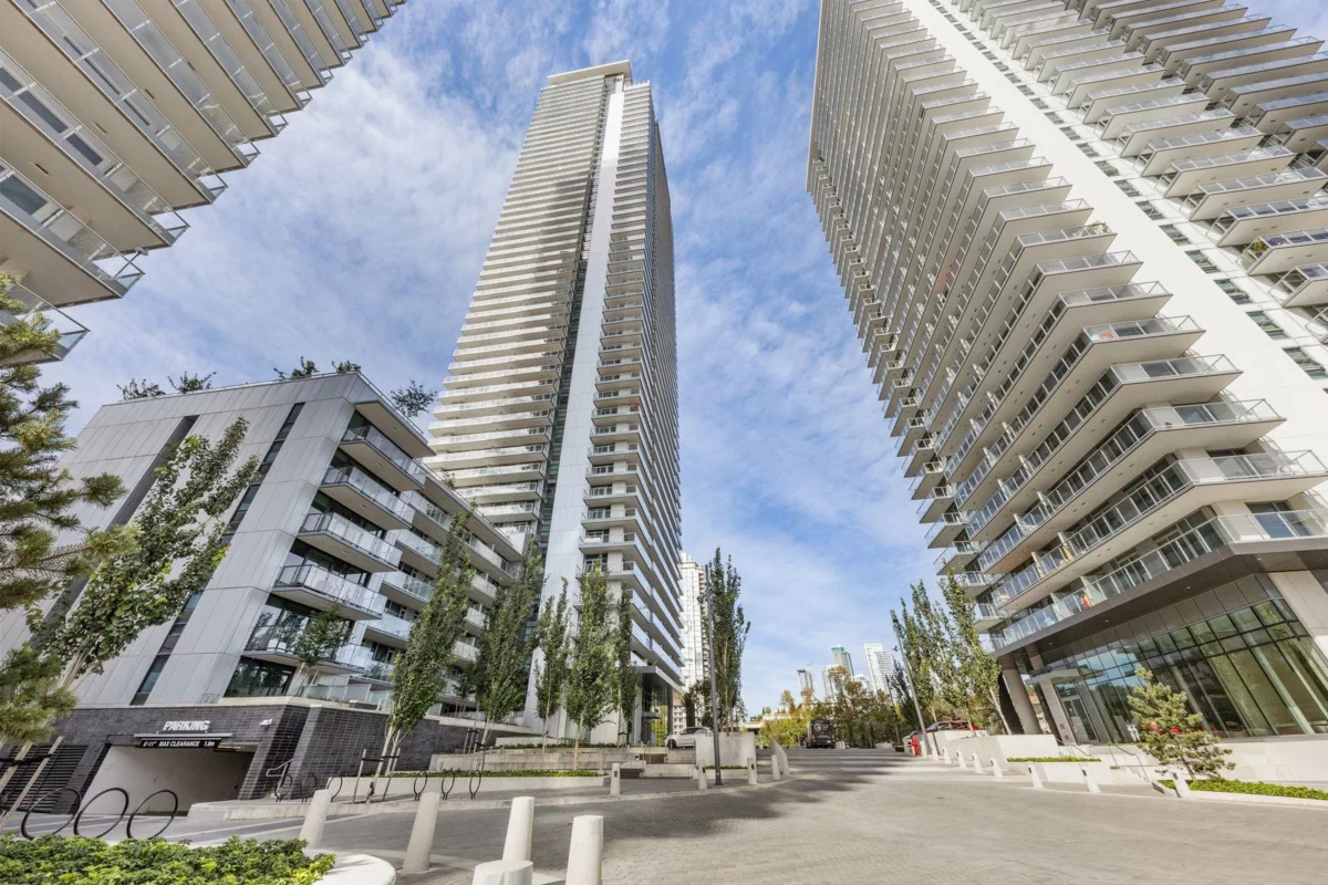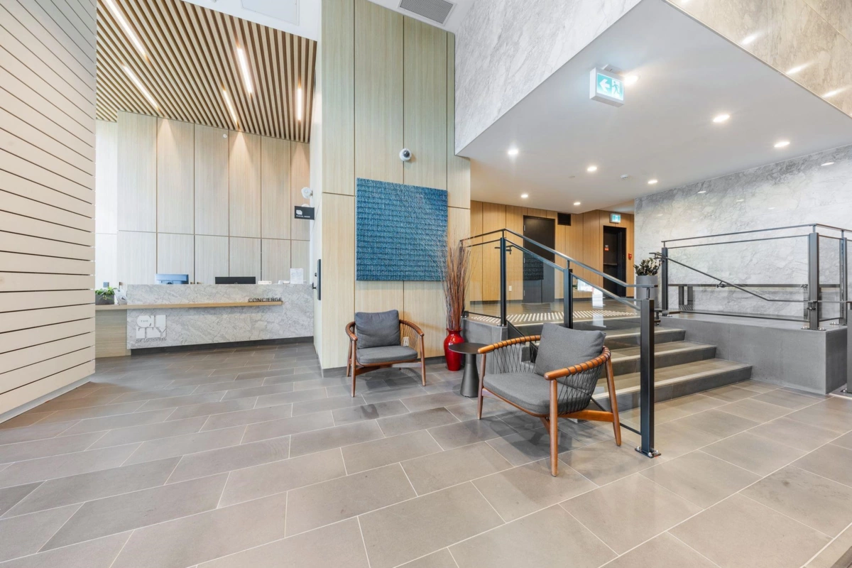 Welcome to this stunning 2-bedroom, 2-bathroom corner home featuring sweeping, unobstructed views and floor-to-ceiling windows that fill the space with natural light. Enjoy a 281 sq. ft. wraparound balcony perfect for relaxing or entertaining. This residence offers air conditioning, premium appliances, 8’9” ceilings, a spacious kitchen with island, and generous bedrooms with excellent closet space. The building features five high-speed elevators, concierge service, the balance of the New Home Warranty, and a three-level Amenity Pavilion including a fully equipped gym, ping pong and pool tables, bocce courts, putting green, workstations, and more. Includes one parking stall, one storage locker, and is pet-friendly. Furniture is staged. OPEN HOUSE CANCELLED