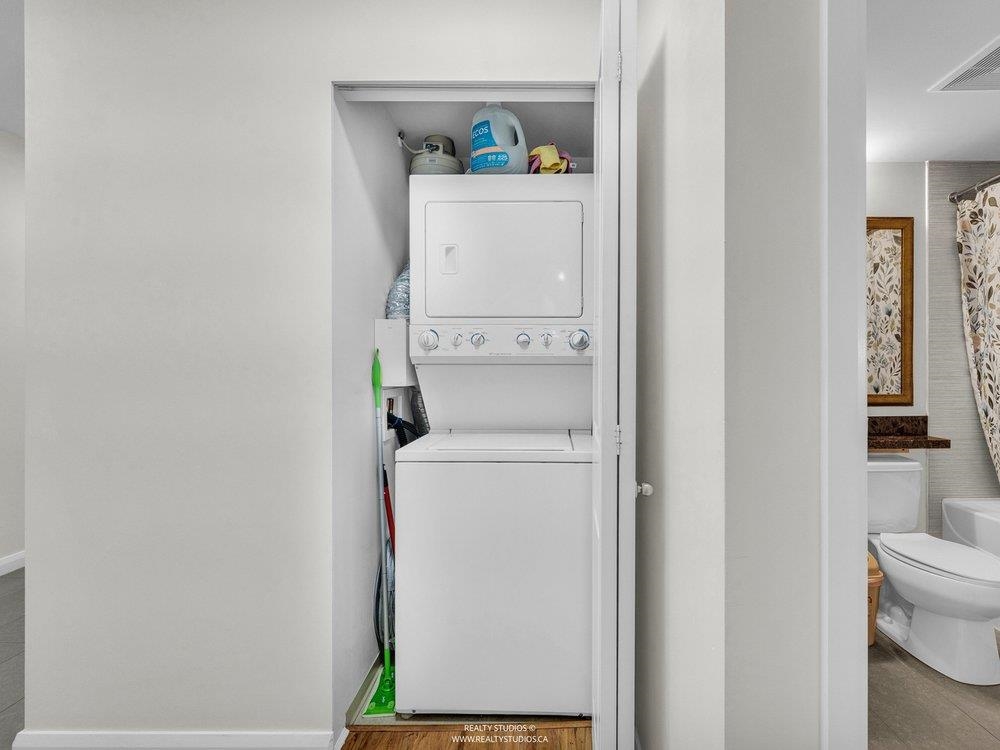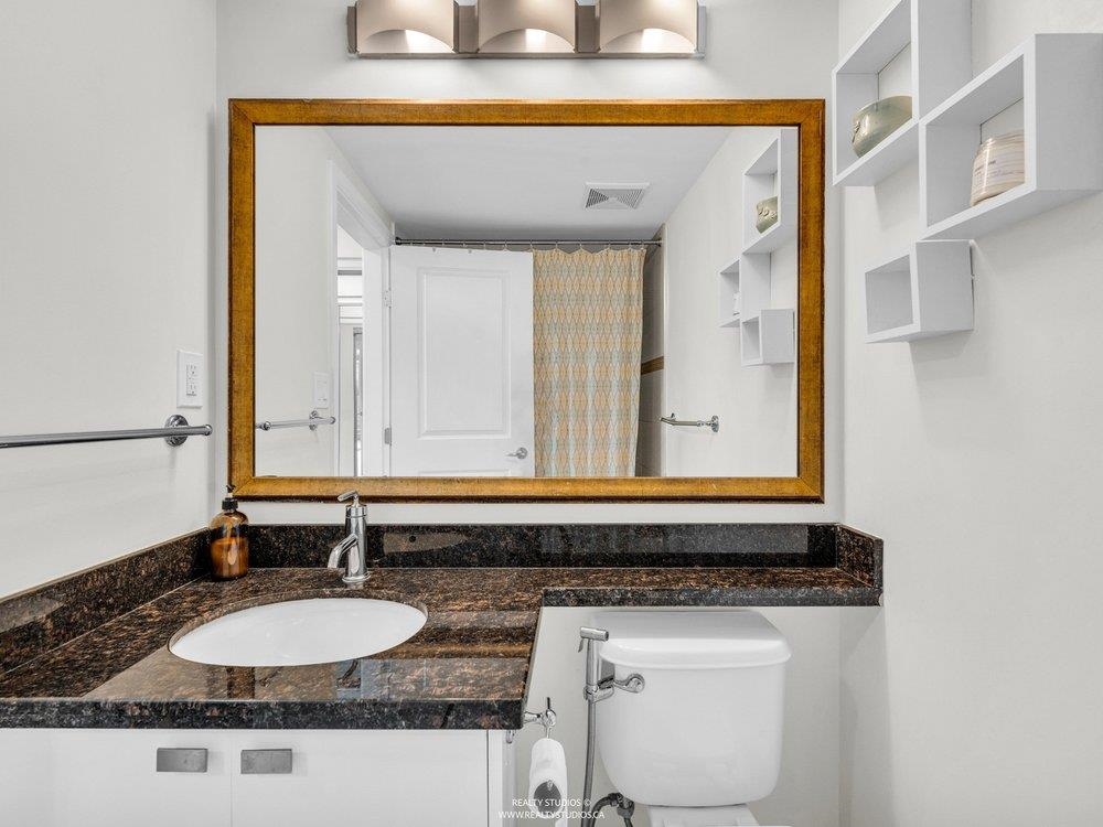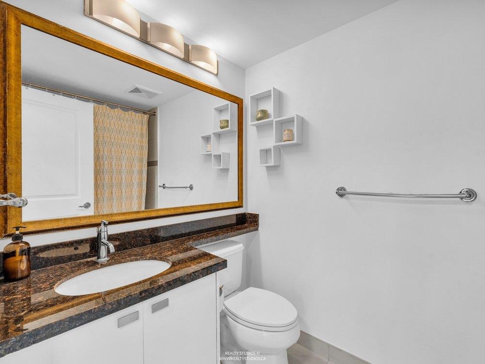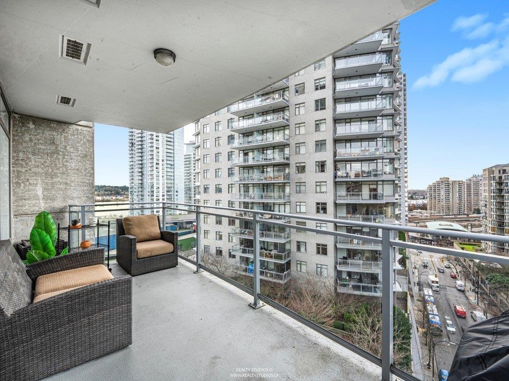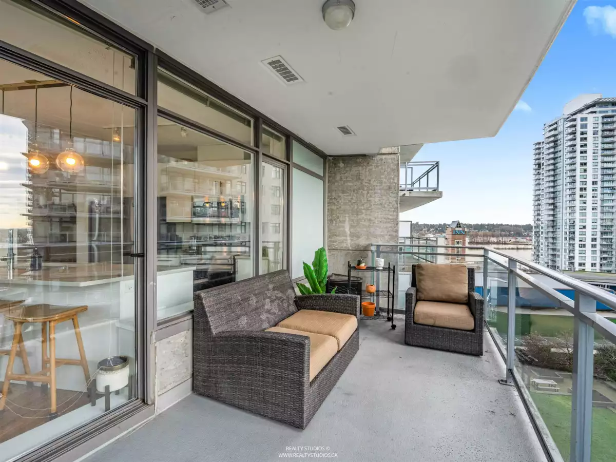High up on the 16th floor, this is city living with breathing room. Unit 1608 is a well-laid-out 2-bed, 2-bath home with sweeping views and real light. Floor-to-ceiling windows frame the river, skyline, and sunsets that hit different after a long day. The kitchen is streamlined and functional, the living space flexible, and the bedrooms properly separated—well placed for privacy and ideal for guests, work-from-home, or roommates. Steps to SkyTrain, the Quay, shops, dining, and the boardwalk. Solid building. Smart location. Calm above the noise. Best experienced in person.