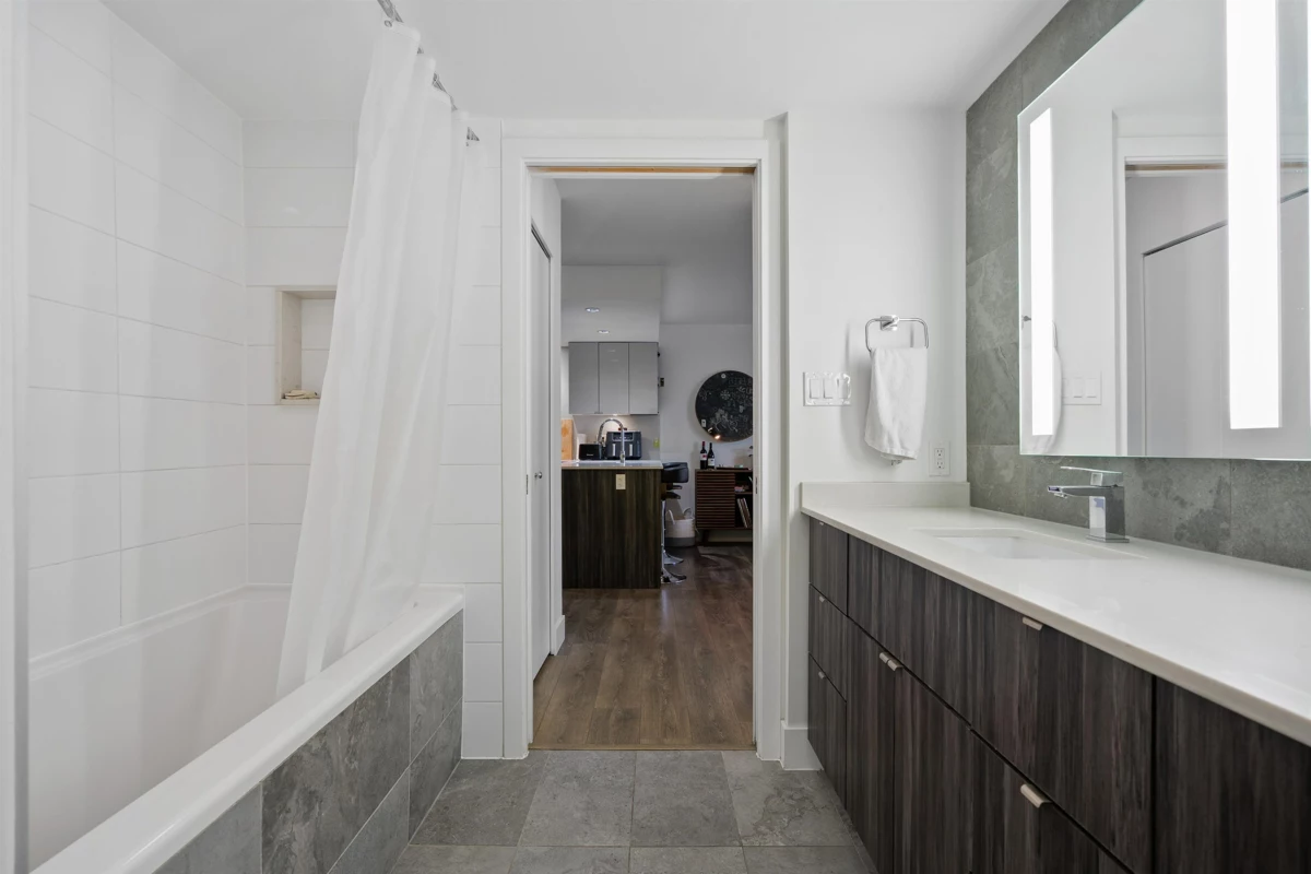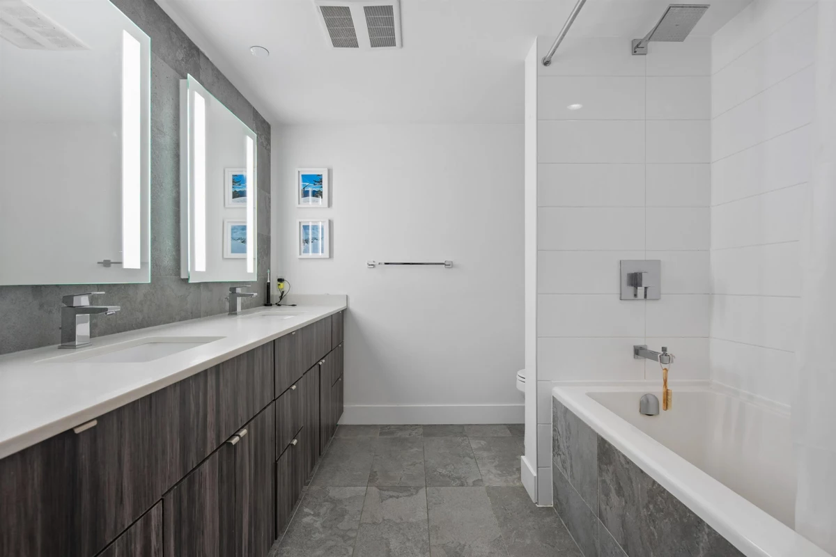 Spacious and functional 1 Bed + Den + Flex + Balcony in Olympic Village with city, mountain & water views. This bright, open-concept, Airbnb-friendly home features floor-to-ceiling windows, German wide-plank flooring, and sunny SW exposure. The gourmet kitchen offers high-gloss cabinetry, induction cooktop, and stainless steel appliances. Generous primary suite with spa-inspired ensuite, double sinks, ample storage, and soaker tub. Enjoy a sunny balcony perfect for BBQs. Epic at West amenities include a fitness centre, 8,500 sq.ft. rooftop patio, concierge, clubhouse, and dog spa. Steps to the Canada Line, seawall, restaurants & shops. Parking & storage included. Tenanted 24 hours’ notice required.