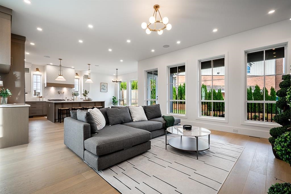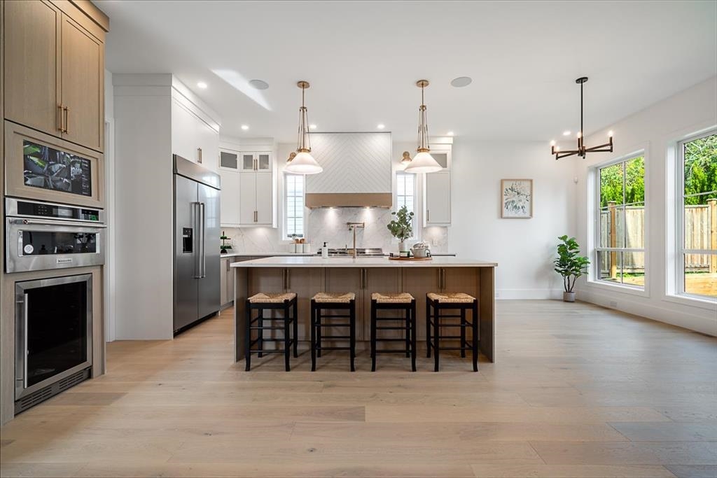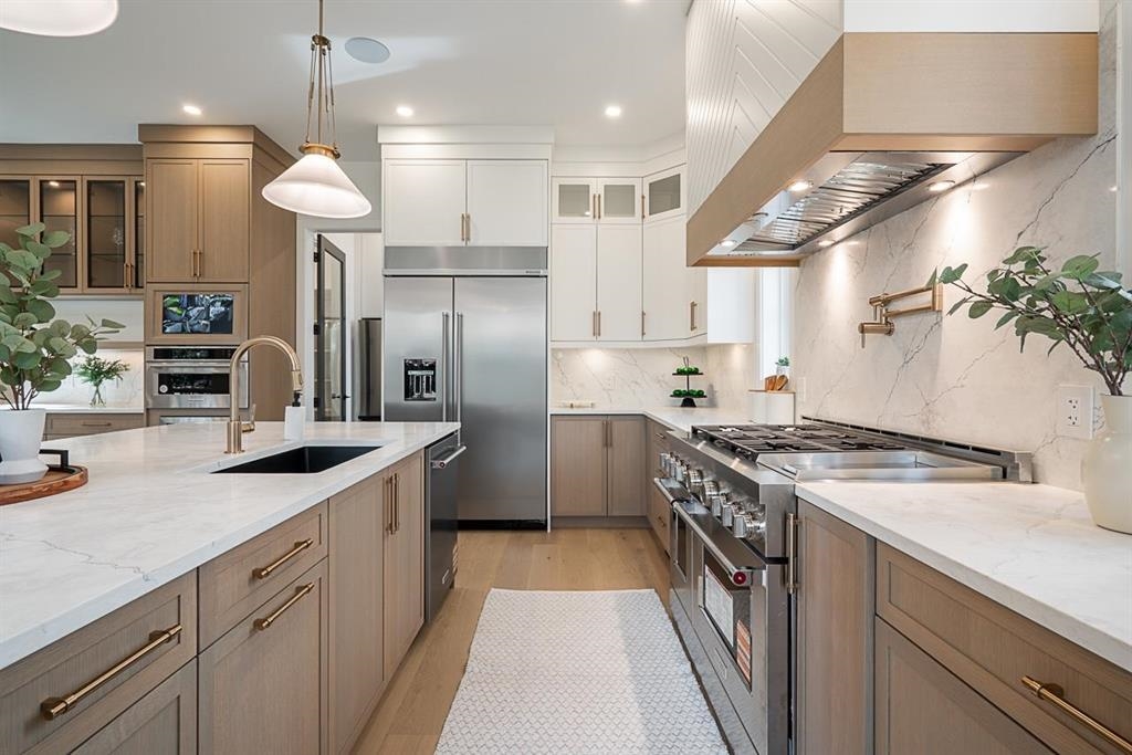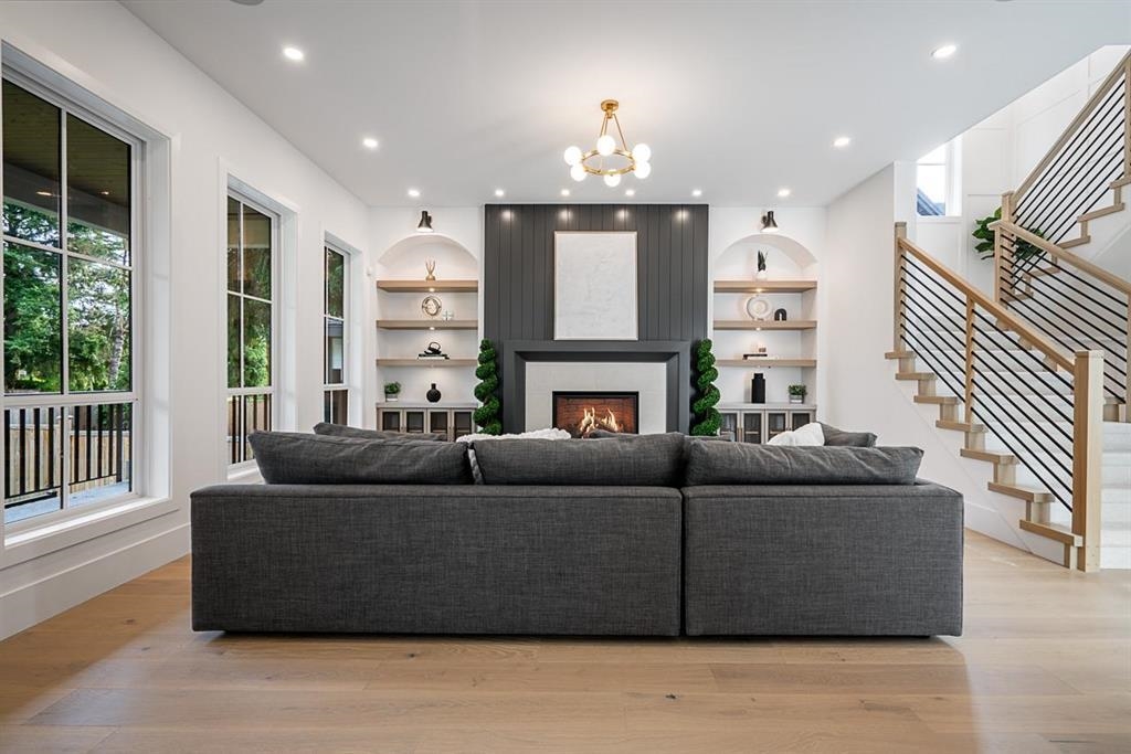 This breathtaking designer home blends Craftsman architecture with Farmhouse elegance, offering 5,560 sq ft of luxurious living in sought-after West Cloverdale. Bright, airy interiors feature expansive windows with automatic blinds, exquisite millwork, and premium flooring. The showstopping great room centers around a stunning fireplace and a custom two-tone white oak kitchen with top-tier appliances, a spice kitchen, and walk-in pantry. Upstairs boasts 4 vaulted bedrooms including a dreamy primary suite, plus a main-level bedroom. The lower level features a 2-bed legal suite, media room with wet bar, 3-pc bath, storage, and mudroom. Enjoy central A/C, smart home features, and the 2/5/10 New Home Warranty—a perfect blend of sophistication, comfort, and functionality.